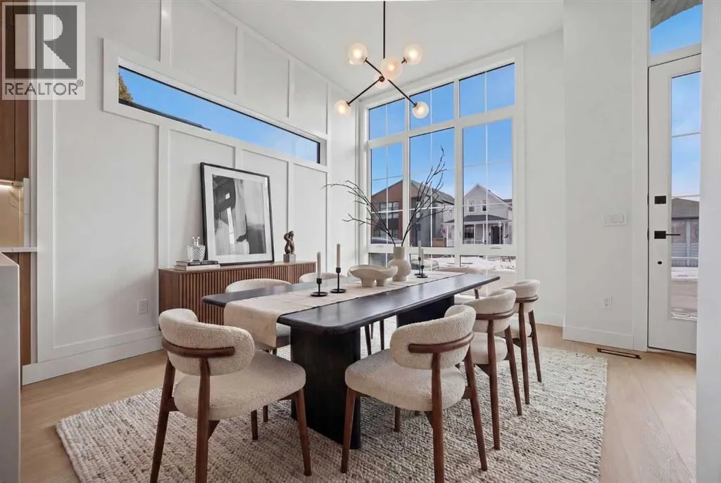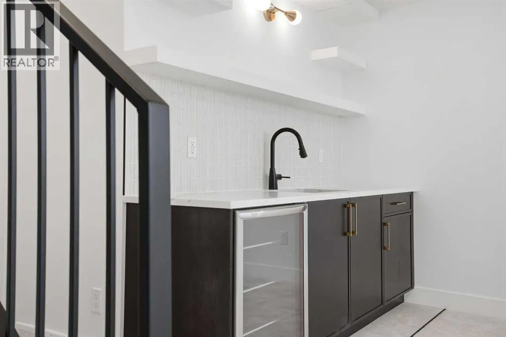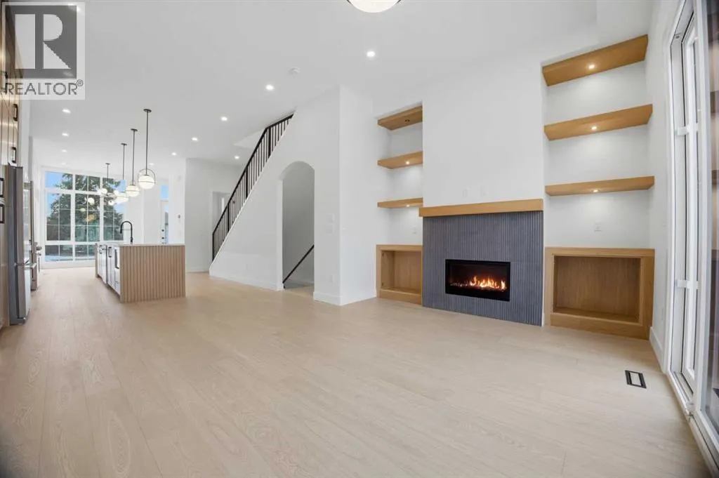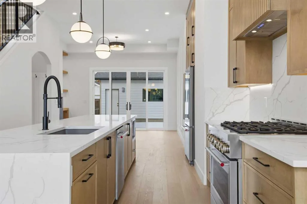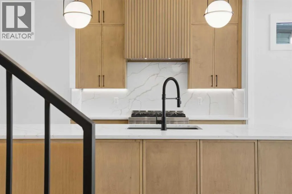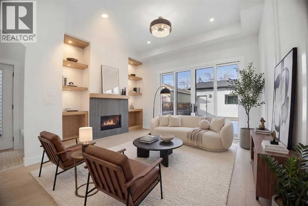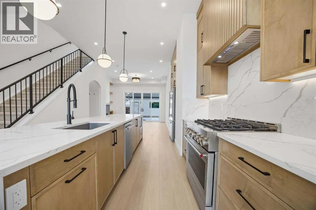 ***OPEN HOUSE: Saturday, April 4 1:00-4:00pm & Sunday April 5 1:00-4:00pm***. Welcome to Ramsay and its newest luxury infill on the picturesque 23 Ave SE. This exceptional home blends architectural character with modern design, creating timeless curb appeal with its triple-arch front elevation, detailed masonry, and durable Hardie Board siding, all complemented by clean, low-maintenance landscaping.Step inside and you will immediately notice the scale and craftsmanship that make this home stand out. The main floor features impressive 11-foot ceilings, a striking 10-foot custom entry door, and 10-foot Lux windows that fill the space with natural light. The open-concept layout is centered around a stunning 14-foot quartz waterfall island and micro-shaker cabinetry, creating the perfect space for both everyday living and entertaining. A cozy gas fireplace and a beautifully designed powder room add character, while continuous site-finished engineered hardwood flooring ties the entire level together.Upstairs you will find three bright and spacious bedrooms, thoughtfully designed for comfort and functionality. The primary suite feels like a private retreat, highlighted by a soaring 13-foot vaulted ceiling. The spa-inspired ensuite features heated tile floors, and the custom walk-in closet is finished with a dramatic barrel ceiling and continued hardwood flooring.The fully developed basement offers even more space to relax and entertain. It includes a fourth bedroom, a large recreation room, and a stylish cocktail bar that is perfect for hosting guests.Located just steps from downtown, breweries, coffee shops, restaurants, parks, and a Kâ6 school, this home offers an ideal blend of lifestyle and convenience. (id:27476)
