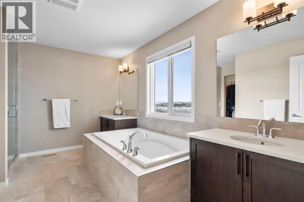 Unbelievable RIDGE HOME with spectacular WEST facing MOUNTAIN VIEWS & incredible sunsets! This beautifully UPDATED 2-storey house in the sought-after community of Cranston offers DIRECT access to ridge pathways = perfect for walking, biking & enjoying the outdoors! This special home features a rare 4 BEDROOMS UP layout, IDEAL for larger families! Bonus room on top level could ALSO become a fifth bedroom IF NEEDED! Covered entry (perfect on snowy days!) Enjoy LARGE foyer space, GLEAMING HARDWOOD, 2-piece bath, main floor office, mud room, walk-thru pantry from DOUBLE garage (drywalled/insulated + HIGH ceilings ideal for storage!) that you can easily park 2 vehicles in!! OPEN CONCEPT living means your family can live, eat, cook, entertain, study, work - ALL in one beautiful space w/central A/C for year-round comfort. BIG Island and LIGHT cabinets in Kitchen! Transition DIRECTLY outside (NO stairs!) & enjoy NEW composite deck w/privacy panels, updated outdoor lighting, underground sprinklers PLUS hot tub - perfect spot for relaxing while enjoying incredible MOUNTAIN VIEWS & SUNSETS. Head upstairs to experience a HUGE primary SUITE with custom wall, incredible natural LIGHT & those amazing VIEWS that greet you every morning! Beautiful ensuite & walk-in closet PLUS toilet room for privacy. BONUS room perfect for MOVIE nights, games, studying or playing music. Laundry room ideally located on top floor! THREE MORE bedrooms + additional 4-piece bath - made for multi-person use (great for kids sharing!) Numerous updates include: NEW kitchen appliances, hood fan, tile backsplash, faucet, garburator, redesigned pantry shelving (great to stay organized!), washer/dryer, carpet & underlay upstairs, fresh paint, updated ensuite flooring & tiled shower w/glass doors, toilets & digital thermostats. Developed basement offers MORE value! Space to relax, workout, entertain, craft + 1 more bedroom & ANOTHER full bath - perfect for guests or teens or additional office space! Steps from F ish Creek Provincial Park, one of Canada's largest urban parks. Enjoy a family picnic by the Bow River, walk the dog or spend a day cycling on 100+ kms of trails! Community is designed to feel secluded & far from busy big city life â yet it's only a short distance from important amenities. Seton is right next door, grab a meal, enjoy a pint of craft beer or check out a movie at the theatre! South Health Campus Hospital is a stone's throw away. Cranston's Century Hall, a 22,000-square-foot community centre, houses a gym & meeting/banquet rooms. Outside, expect year-round recreation at the splash park, outdoor hockey rink & 2.8-hectare private park. Add in access to Public & Catholic school options, parks, major roadways, transit + great neighbours...what are you waiting for!?! Don't miss this rare opportunity to own a move-in ready RIDGE home (with NO ROAD below!) Book your showing today. You can BUY this home and start enjoying this view blossom into spring! (id:27476)