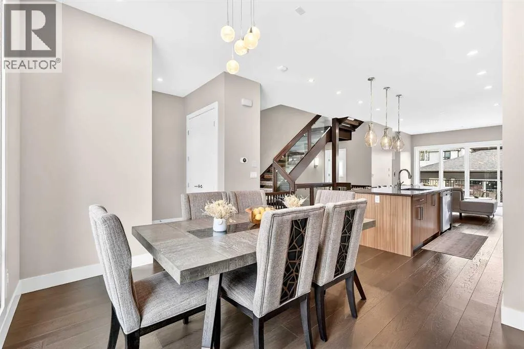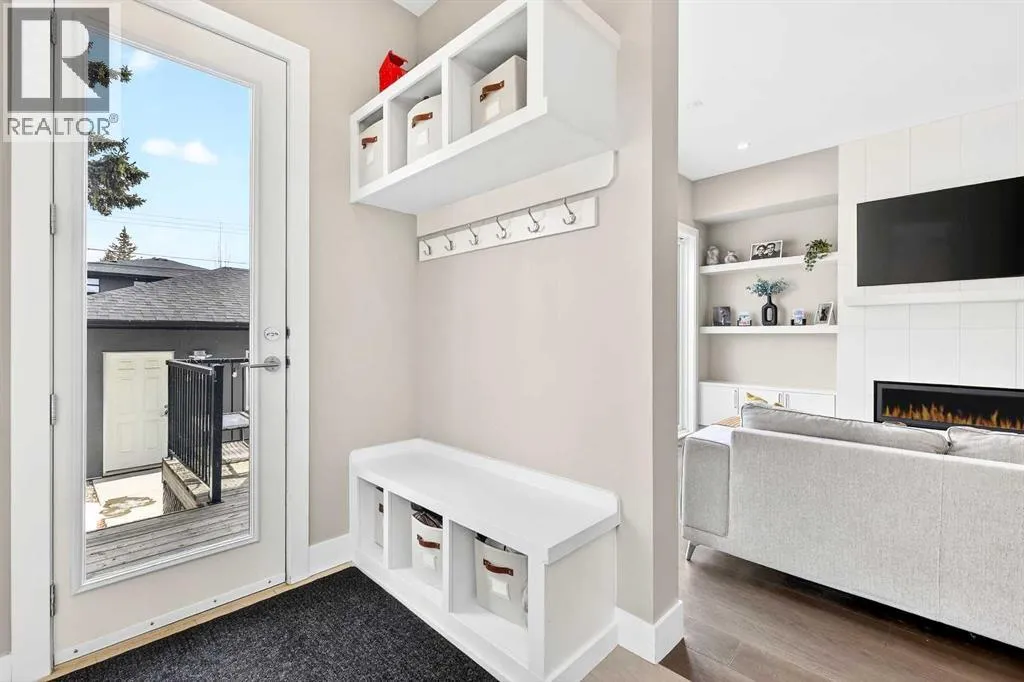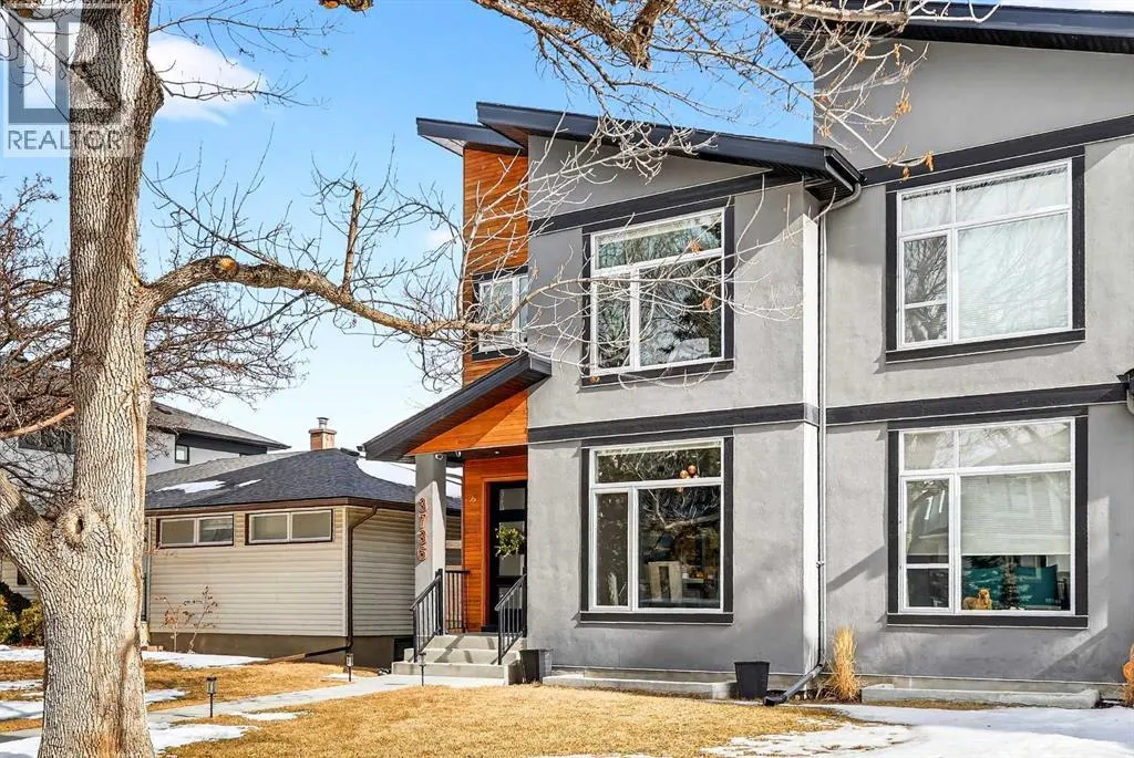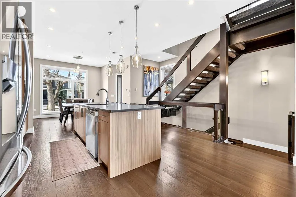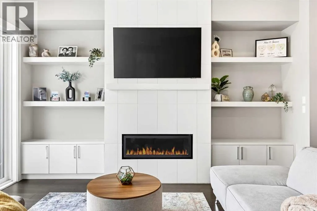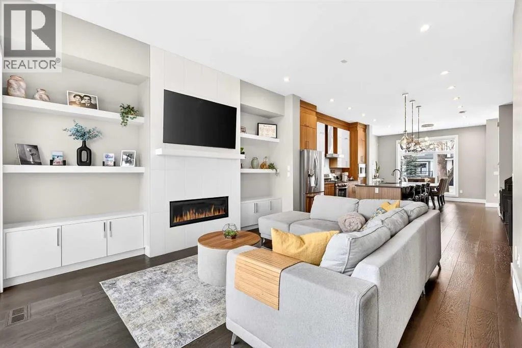 Ideally located on one of Glenbrookâs most desirable and well-established streets, this stunning fully finished contemporary infill offers exceptional design, quality craftsmanship, and a functional open-concept layout. The main floor showcases wide-plank engineered hardwood flooring, large windows that flood the space with natural light. The chef-inspired kitchen is beautifully designed with stainless steel appliances, quartz countertops, abundant two-tone cabinetry in white and wood finishes, and an oversized island with breakfast bar seatingâperfect for both everyday living and entertaining. Adjacent to the kitchen, the spacious dining area easily accommodates gatherings of any size. The inviting living room features custom built-ins and a striking gas fireplace, creating a warm and stylish focal point. Expansive 8â sliding doors lead to the private backyard retreat, an ideal place to relax after a long day. Completing the main level is a convenient 2-piece bathroom and a well-designed mudroom with built-in storage to keep everything organized and out of sight. Upstairs, the luxurious primary suite offers a peaceful retreat with a custom closet and an elegant spa-inspired ensuite featuring a large soaker tub, dual sinks, a stand-alone tiled shower with built-in bench seating, soaring ceilings, a stunning skylight, and a private water closet. Two additional generously sized bedrooms, a full 4-piece bathroom, and a convenient upper-level laundry area with stacking washer and dryer and sink complete this level. The fully developed basement, finished by the builder to the same high standard as the upper floors, provides incredible additional living space. This level includes a spacious recreation room perfect for a media area, playroom, or entertaining, along with a fully equipped wet bar featuring a sink, extensive cabinetry, and space for a bar or wine fridge. A fourth bedroom with a large walk-in closet and a full 4-piece bathroom make this level ideal for guests or extended family. Outside, enjoy low-maintenance landscaping, a beautiful deck perfect for summer evenings, and a double detached garage. Additional comfort is provided with central air conditioning, making the home enjoyable year-round. Situated on a quiet street yet close to everything, this exceptional home offers easy access to schools, shopping, downtown Calgary, 17th Avenue, grocery stores, public transit, and major roadways. A beautifully designed inner-city home with an undeniable WOW factorâthis is one you wonât want to miss. (id:27476)