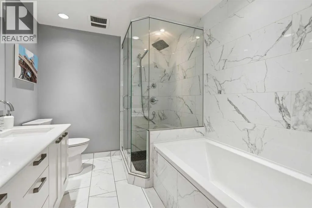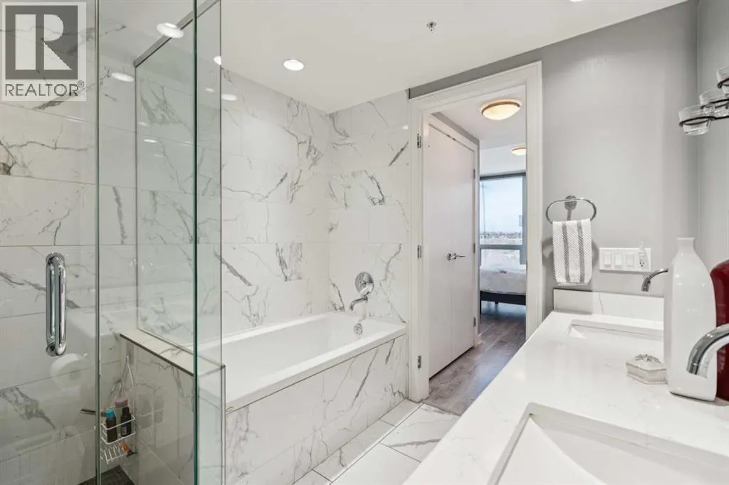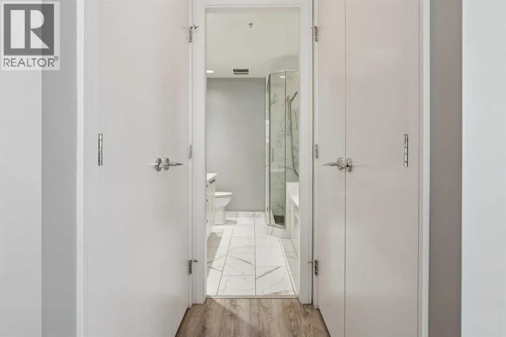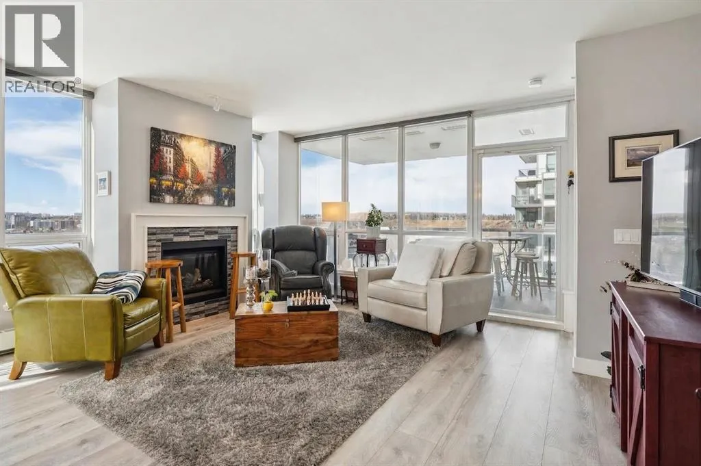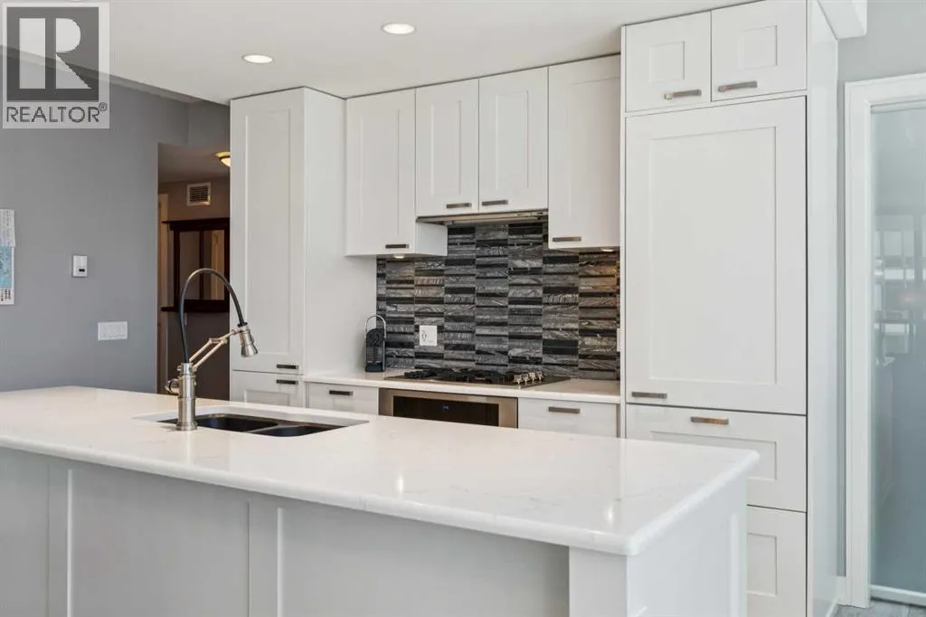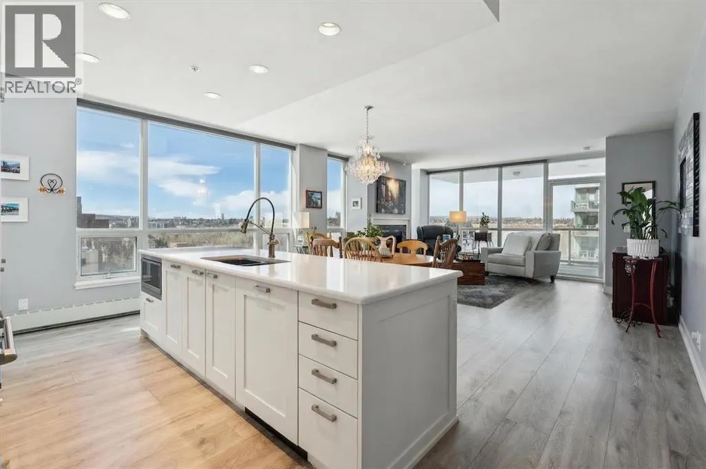 Sky-High Luxury Living in the Waterfront! Prime northwest corner location with spectacular views of Prince's Island Park, Bow River, mountains, COP and the downtown city lights! The many large expansive corner windows provide an abundance of bright natural light while enhancing those incredible views from every room! Exceptional open floor plan that's perfect for entertaining and great layout with opposite side bedrooms for complete privacy! Completely renovated kitchen, bathrooms, flooring and UV-Coated windows all in 2018. Immaculate 2 Bedroom + Den home with gorgeous hardwood flooring, quartz counter-tops throughout, soft-close kitchen drawers, custom Hunter Douglas blinds and tasteful recessed lighting! You'll be sure to enjoy the large covered balcony with incredible views, natural-gas fireplace, 5 pce ensuite bath with soaker tub and rain shower, custom closet organizers, separate office-den, open kitchen with large eat-in Island, gas range, 2 built-in freezer drawers, brand new dishwasher and microwave, separate laundry room with storage, high-end stack washer/dryer and spacious entrance to greet your guests. Comes with 2 very convenient SXS parking stalls across from elevator doors and storage locker in secure storage room. The luxurious Waterfront towers provide first-class amenities with concierge service, impressive lobby with comfortable seating area, fully equipped fitness center, hot tub area, steam room, yoga studio, social lounge with billiard table, awesome Theater room, private inner courtyard and car wash facilities! The location is extraordinary along the south bank of the Bow River next to Prince's Island Park, world-class pathway system, near by shops and boutiques, great restaurants and cafes, Chinese Cultural Center and quick access to transportation and the LRT. Time to enjoy the ultimate in downtown urban living! (id:27476)