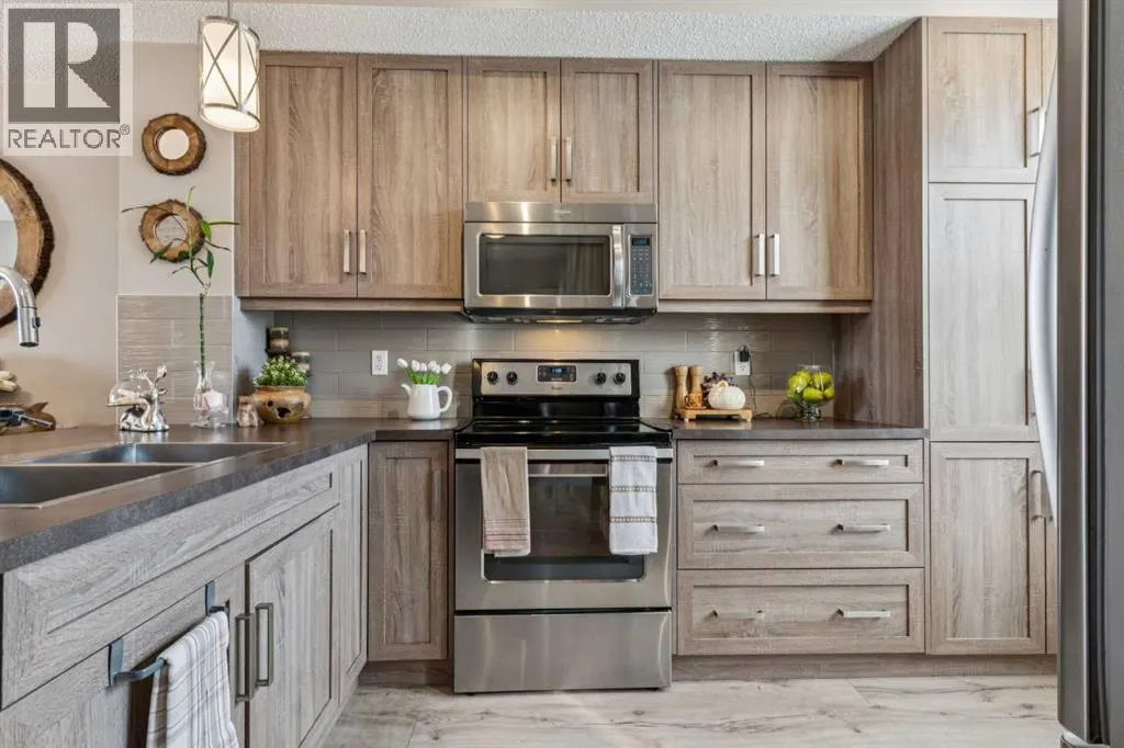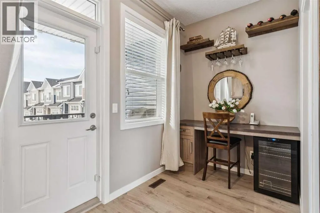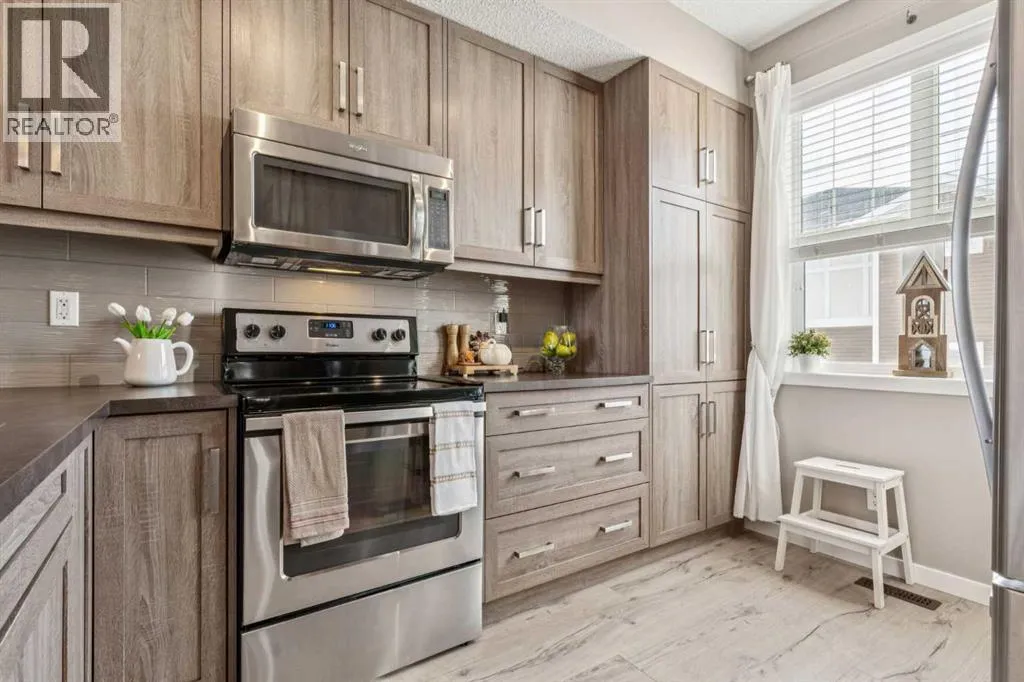 Stylish Jayman townhome offering over 1,500 sq ft of developed living space, a true heated double side-by-side garage, central air conditioning integrated with the HVAC system, and a brand new roof completed in 2025. Welcome to low-maintenance living in the sought-after community of Nolan Hill.The bright open-concept main floor features rich Alpine Oak laminate flooring and a designer kitchen with stainless steel Whirlpool appliances, elegant Shaker cabinetry, and generous counter space. A spacious breakfast nook flows into the inviting living area highlighted by a custom feature wall, mantle, and electric fireplace.This home includes approximately $15,000 in upgrades, including Hunter Douglas blinds, vinyl flooring on the staircase, the custom fireplace feature wall, and smart home features such as a Google Nest thermostat, smart WiFi keypad door lock, and a camera security system.Upstairs are three bedrooms including a comfortable primary suite, two full bathrooms, and convenient second-floor laundry. The lower level offers a versatile den ideal for a home office or recreation space. Enjoy relaxing on the balcony, while the heated double garage provides secure year-round parking and storage.Well-maintained and thoughtfully upgraded, this move-in ready home offers exceptional comfort, style, and convenience. (id:27476)