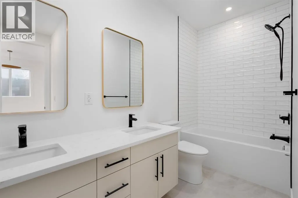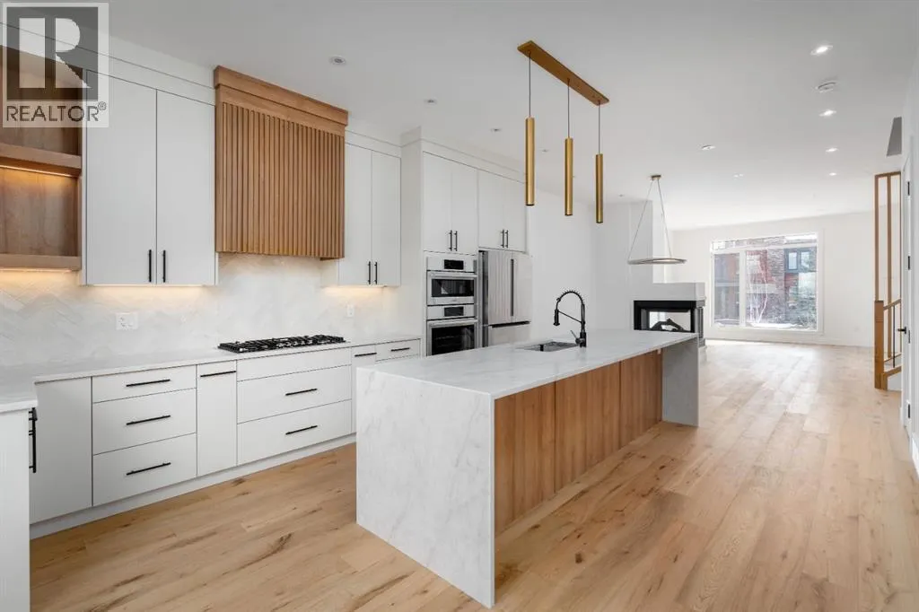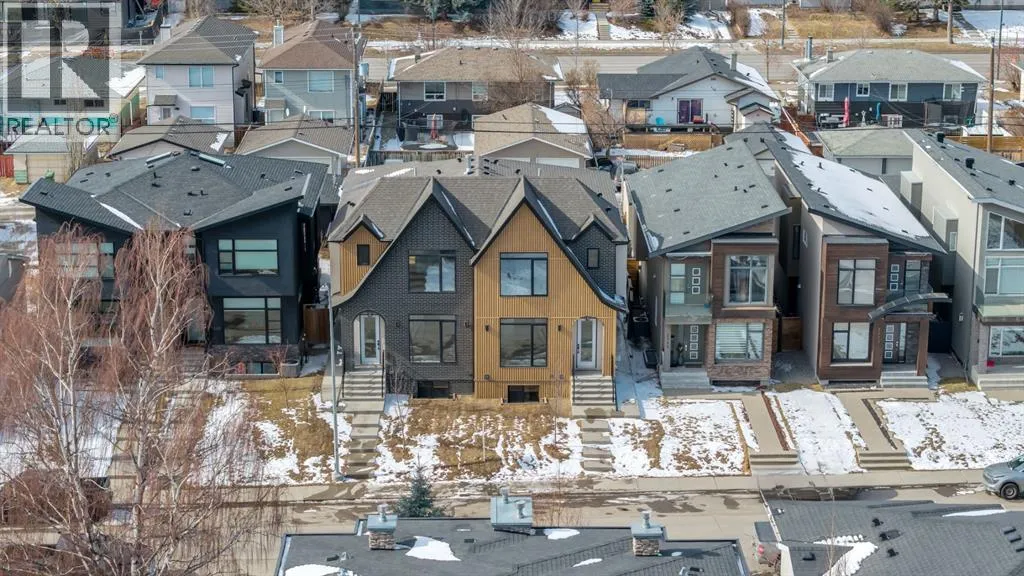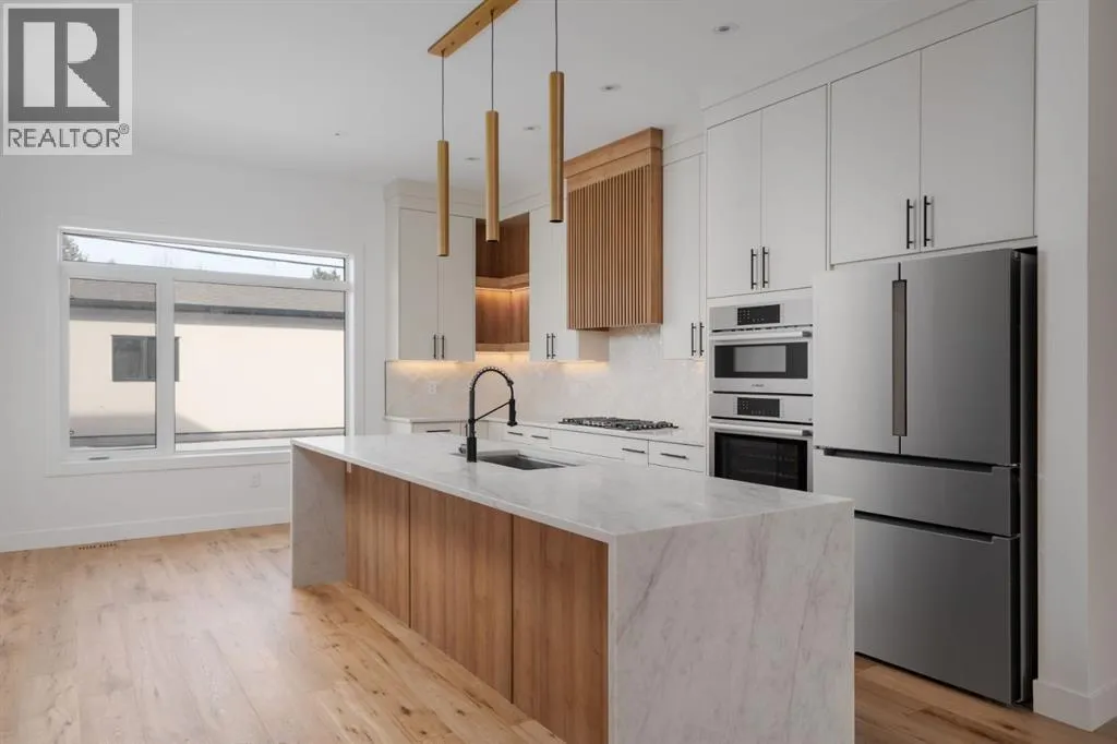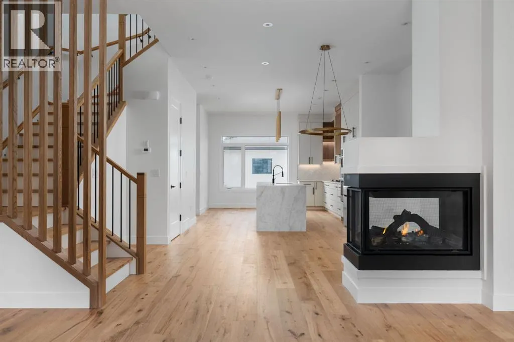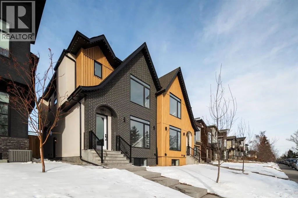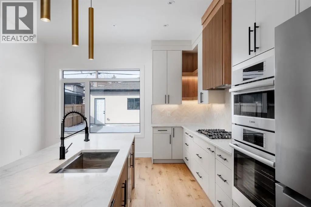 Welcome to The Killarney Collection in SW Calgaryâthoughtfully crafted on a quiet street, this fully upgraded duplex infill offers a refined balance of scale, texture, and modern comfort. From the moment you arrive, the home makes a striking first impression with its sleek, contemporary exterior, pairing oversized triple-pane windows for abundant natural light with warm natural tones of true brick detailing and stucco accenting stands out. Inside, 10-foot main floor ceilings create a grand sense of arrival, setting the tone for the interior designerâcurated colour palette carried throughout the home. Every detail has been intentionally explored, with the heart of the main floor anchored by a chef-inspired gourmet kitchen. Featuring a premium Bosch appliance package, fully custom-painted cabinetry, and an oversized waterfall granite island, the space effortlessly blends luxury with everyday functionality. A dedicated central dining off the kitchen offers a warm setting for gatherings, while the front living room provides a more intimate retreat, both areas are anchored by the full feature-wall gas fireplaceâperfect for evenings spent unwinding. Thoughtful storage solutions are seamlessly integrated, including built-ins at the entry and a fully custom mudroom at the rear, ensuring every inch of space is maximized. Ascending to the upper level, subtle design moments continue to impress, with a full wood feature wall, custom stair lighting, and luxury wide-plank hardwood flooring flowing continuously throughout both the main and upper levels for a seamless transition.The oversized primary bedroom is a true sanctuary, showcasing a vaulted and peaked ceiling design with expansive windows that welcome morning light. The spa-inspired ensuite features a dual vanity, an expansive full-tile shower, and a calming, private retreat. Two additional bedrooms offer generous proportions, each complete with custom closet built-ins. The upper-level laundry room maintains the homeâs commitment to efficiency and design, offering full cabinetry, a folding counter, side-by-side washer and dryer, and a laundry sink. A versatile work-from-home alcove completes the upper floor, easily functioning as a den or secondary living space.The lower level further extends the homeâs flexibility with an oversized 2-bedroom, 1-bath legal suite (900+SQFT), centered around a spacious open kitchenâideal for rental income, guests, or multi-generational living. A separate full laundry room, understair storage, and built-ins throughout each closet to ensure the same level of thoughtful design continues below.Perfectly positioned close to inner-city Calgary, recreation centres, shopping, and public transit, this Killarney residence offers a timeless blend of form and functionâdesigned to live beautifully today and adapt effortlessly for tomorrow. (id:27476)