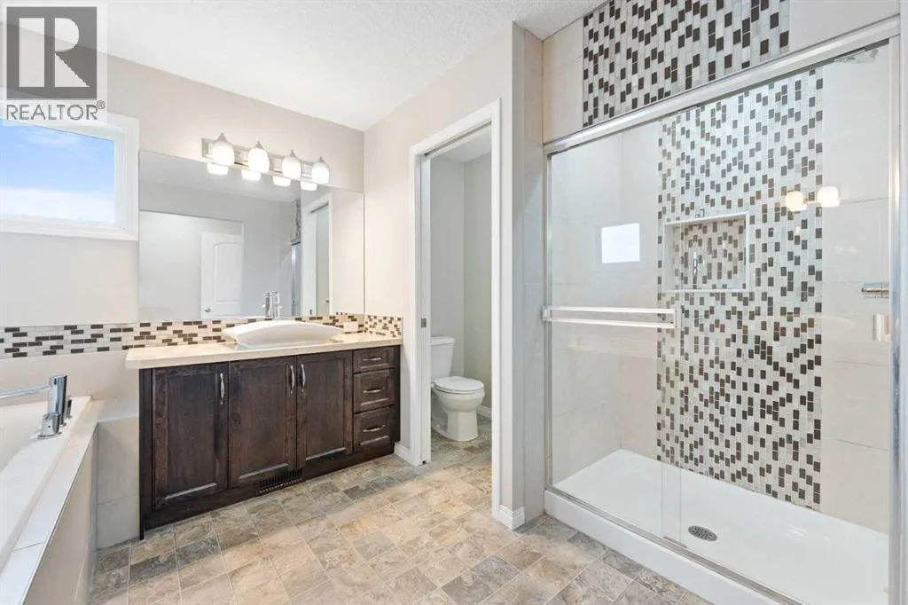 Welcome to this beautifully maintained 4 bedroom, 4 bathroom fully developed home located in the sought-after SE community of Walden. Offering a modern, functional layout with 9-foot ceilings, this home is designed for both everyday living and entertaining. The main floor welcomes you with rich hardwood flooring and an abundance of natural light pouring in through large windows in both the living and dining rooms. The living room features a striking stone feature wall, creating a warm and inviting focal point. A full formal dining room provides the perfect space for hosting family gatherings or dinner parties. At the heart of the home is the spacious kitchen, complete with granite countertops, a large central island, stainless steel appliances, and ample cabinetry for storage. Recent updates include a new dishwasher and washer/dryer. The thoughtfully designed walkthrough pantry connects the kitchen to the mudroom, making grocery drop-offs effortless. A convenient 2-piece bathroom completes the main level. Upstairs, youâll find a large bonus room, ideal for movie nights, a home office, or a kidsâ play area. The upper level also features three generous bedrooms, all with walk-in closets. The primary retreat is a true escape, offering a spa-inspired ensuite with dual vanities, a soaker tub, and a separate shower. Upstairs laundry adds everyday convenience and functionality. The fully finished basement expands your living space with an additional bedroom, a full bathroom with heated flooring, and a large family roomâperfect for guests, teens, or extended family.Step outside to a landscaped backyard with a large deck, ideal for summer barbecues and outdoor entertaining. Additional highlights include a double attached garage and easy access to Stoney Trail, Deerfoot Trail, and nearby shopping centres, making commuting and daily errands a breeze. This move-in-ready home offers space, comfort, and an unbeatable locationâan excellent opportunity in one of Calgaryâs most des irable southeast communities. (id:27476)