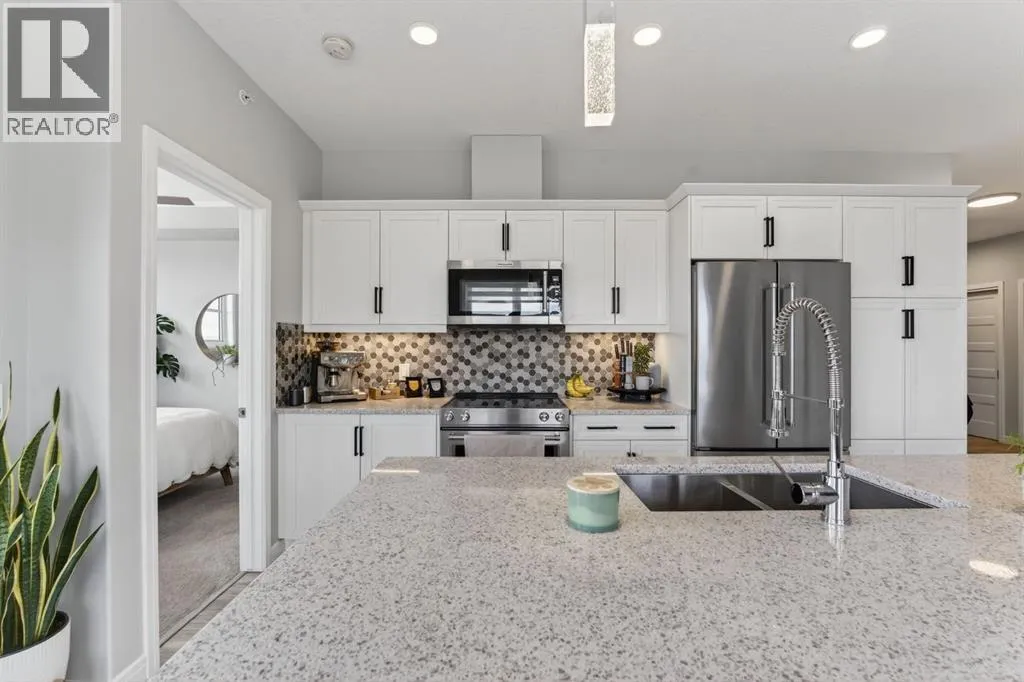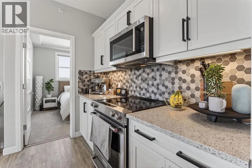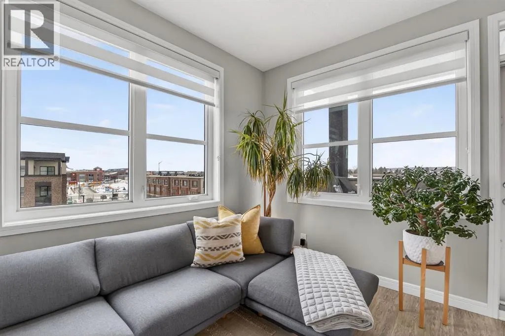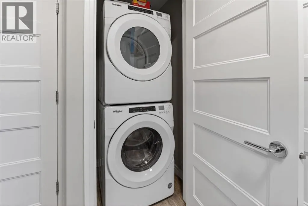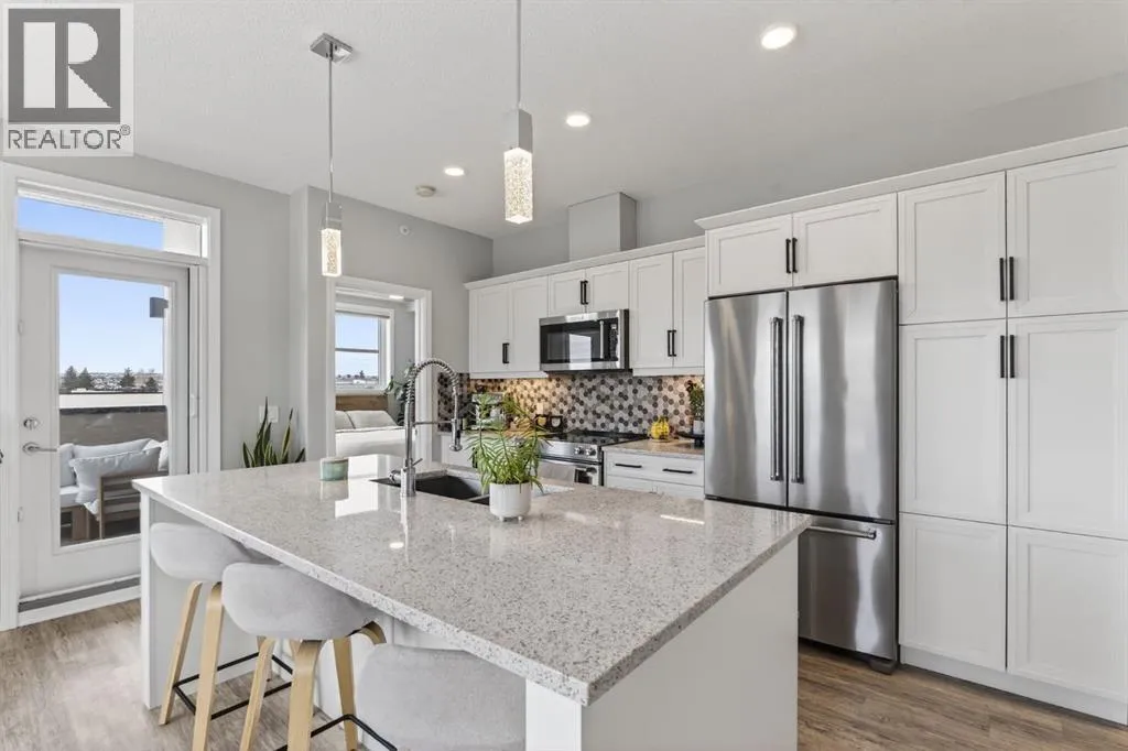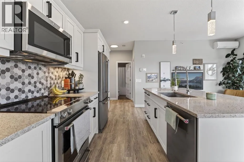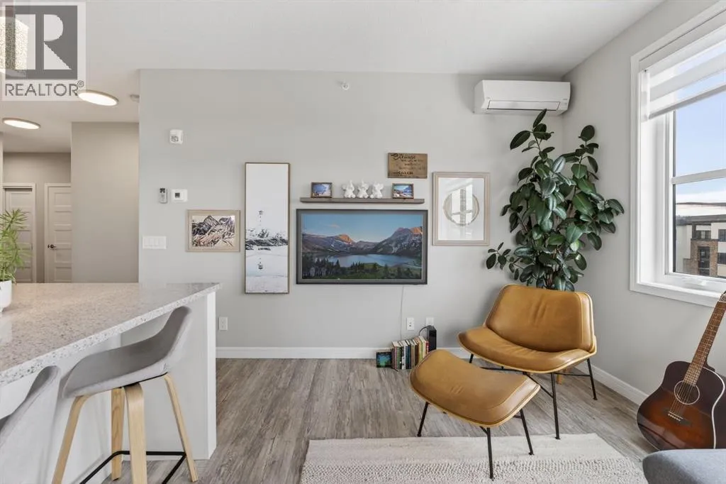 Welcome to Greenwich, one of Calgaryâs most exciting and up-and-coming communities. This fully upgraded TOP FLOOR condo offers 2 bedrooms, 2 bathrooms, and over 800 SQFT of thoughtfully designed modern living. An open concept layout that seamlessly combines the spacious dining area with the large living room creates the perfect space for relaxation and entertainment. Offering 9 foot ceilings, in-floor heat that will keep you warm all winter and air-conditioning to keep you cool in the summer. The stunning kitchen is complete with upgraded stainless steel appliances, ample white cabinetry, quartz countertops, and large quartz island. The kitchen island serves as a focal point, ideal for hosting dinner parties or gathering with friends. Luxury Vinyl Plank flooring adds an elegant touch, while two primary suites situated on opposite ends of the condo ensure privacy and comfort for all. The true primary suite boasts a large size, a walk through closet and a walk-in shower. The second bedroom is a generous size with access to the 4 pc bathroom. This condo has breathtaking WEST facing views of the Rocky Mountains and an incredible amount of natural sunlight from the large windows. Enjoy the spacious patio complete with a gas line for your BBQ and plenty of room for outdoor furnitureâperfect for relaxing and taking in beautiful summer sunsets. Additional features include in-suite laundry, a storage unit, and underground TITLED parking complete with additional storage cage for convenience. Located just steps away from the Calgary Farmers Market, shopping destinations, coffee shops, parks, pathways, outdoor skating rinks, and fitness facilities, this condo offers the epitome of urban living. Bowness Park is within easy reach, perfect for outdoor enthusiasts and Downtown Calgary a mere 18-minute drive away. (id:27476)