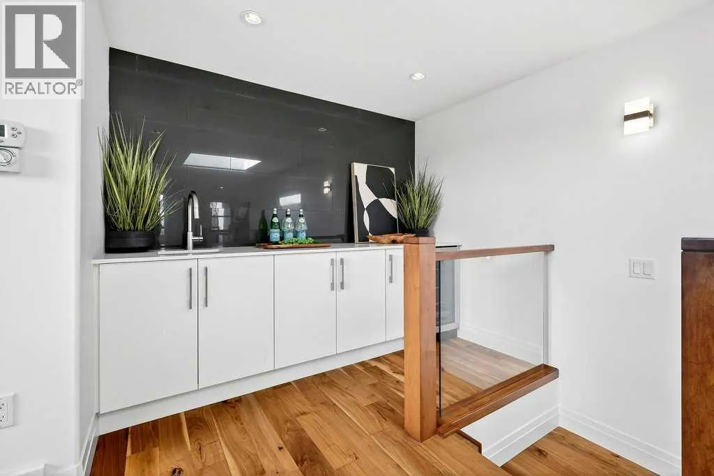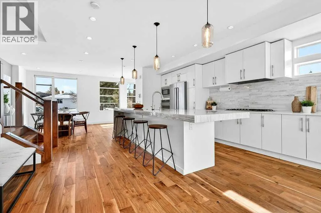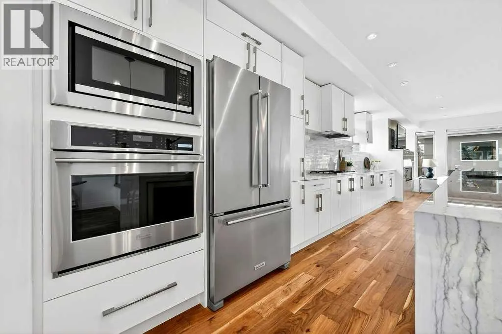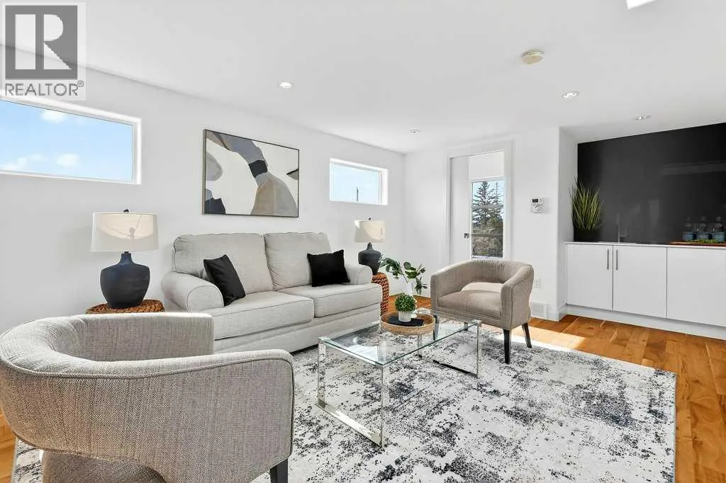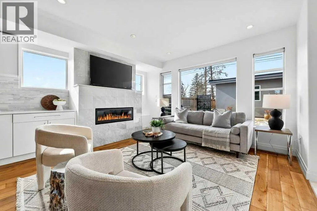Welcome to this exceptional luxury infill in the desirable inner-city community of Glenbrook, offering over 3,000 sq ft of developed living space with 4 bedrooms and 5 bathrooms on a large corner lot with sunny south and west backyard exposure that fills the home with natural light throughout the day. The open-concept main floor is designed for both everyday living and entertaining. The stunning chefâs kitchen features high-end stainless steel appliances including a gas cooktop, extensive contemporary cabinetry, a marble backsplash, and a massive quartz island with waterfall edge and double-thick edge detail. The bright living room overlooks the backyard and is anchored by a sleek linear fireplace, creating a warm and inviting space. Walnut hardwood flooring runs throughout nearly the entire home, including the upper levels and basement living areas. The second floor offers three bedrooms, a full bathroom, convenient laundry, and mountain views. The spacious primary suite features a walk-in closet with built-ins and a spa-inspired ensuite with heated floors, double vanity, glass shower, and deep soaker tub beside a large window that fills the room with natural light. The entire third floor is a standout entertaining space, offering a bright and versatile lounge area complete with a wet bar, beverage fridge, and 2-piece bathroom. Step outside to the private balcony with gas hookup, perfect for relaxing or entertaining. The professionally developed basement includes a large recreation area with built-in wet bar, a fourth bedroom, and a full bathroom, along with in-floor slab heating for year-round comfort. Additional highlights include a double detached garage with 220V outlet for EV charging. Ideally located close to parks, schools, restaurants, and shopping at Westhills and Signal Hill Centre, with quick access to Richmond Road and Sarcee Trail and approximately an 8-minute commute to downtown Calgary. (id:27476)