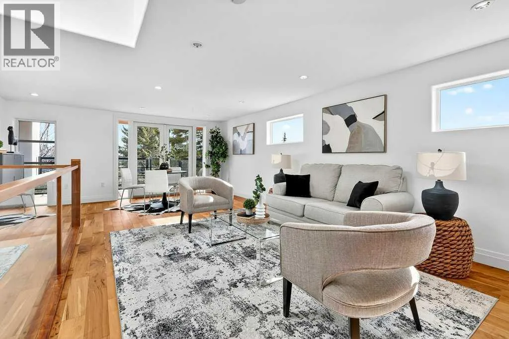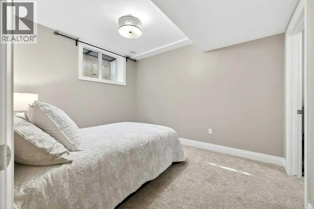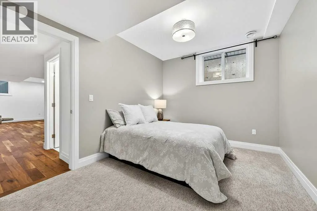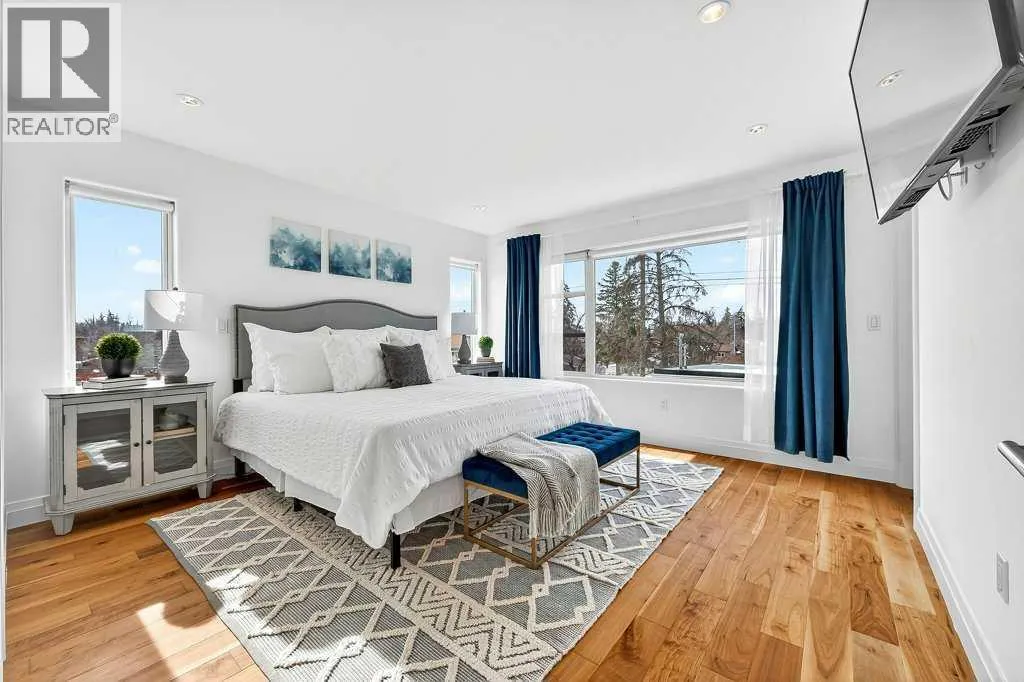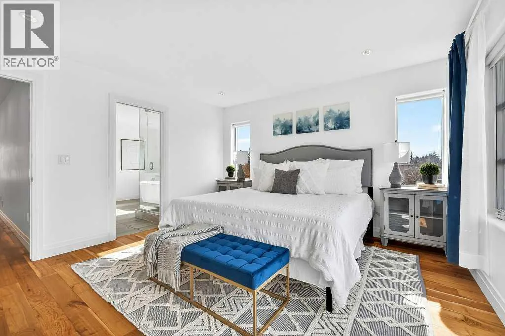 Welcome to this exceptional luxury infill in the desirable inner-city community of Glenbrook, offering over 3,000 sq ft of developed living space with 4 bedrooms and 5 bathrooms on a large corner lot with sunny south and west backyard exposure that fills the home with natural light throughout the day. The open-concept main floor is designed for both everyday living and entertaining. The stunning chefâs kitchen features high-end stainless steel appliances including a gas cooktop, extensive contemporary cabinetry, a marble backsplash, and a massive quartz island with waterfall edge and double-thick edge detail. The bright living room overlooks the backyard and is anchored by a sleek linear fireplace, creating a warm and inviting space. Walnut hardwood flooring runs throughout nearly the entire home, including the upper levels and basement living areas. The second floor offers three bedrooms, a full bathroom, convenient laundry, and mountain views. The spacious primary suite features a walk-in closet with built-ins and a spa-inspired ensuite with heated floors, double vanity, glass shower, and deep soaker tub beside a large window that fills the room with natural light. The entire third floor is a standout entertaining space, offering a bright and versatile lounge area complete with a wet bar, beverage fridge, and 2-piece bathroom. Step outside to the private balcony with gas hookup, perfect for relaxing or entertaining. The professionally developed basement includes a large recreation area with built-in wet bar, a fourth bedroom, and a full bathroom, along with in-floor slab heating for year-round comfort. Additional highlights include a double detached garage with 220V outlet for EV charging. Ideally located close to parks, schools, restaurants, and shopping at Westhills and Signal Hill Centre, with quick access to Richmond Road and Sarcee Trail and approximately an 8-minute commute to downtown Calgary. (id:27476)