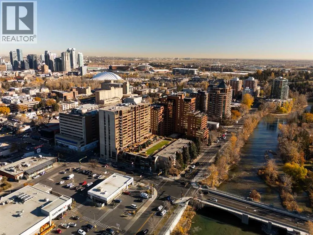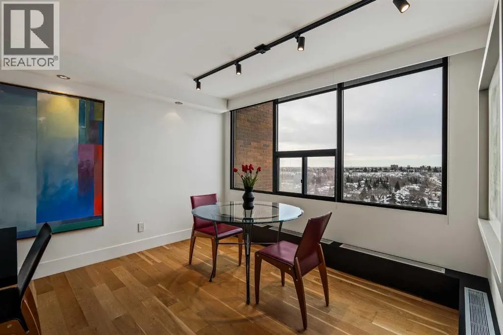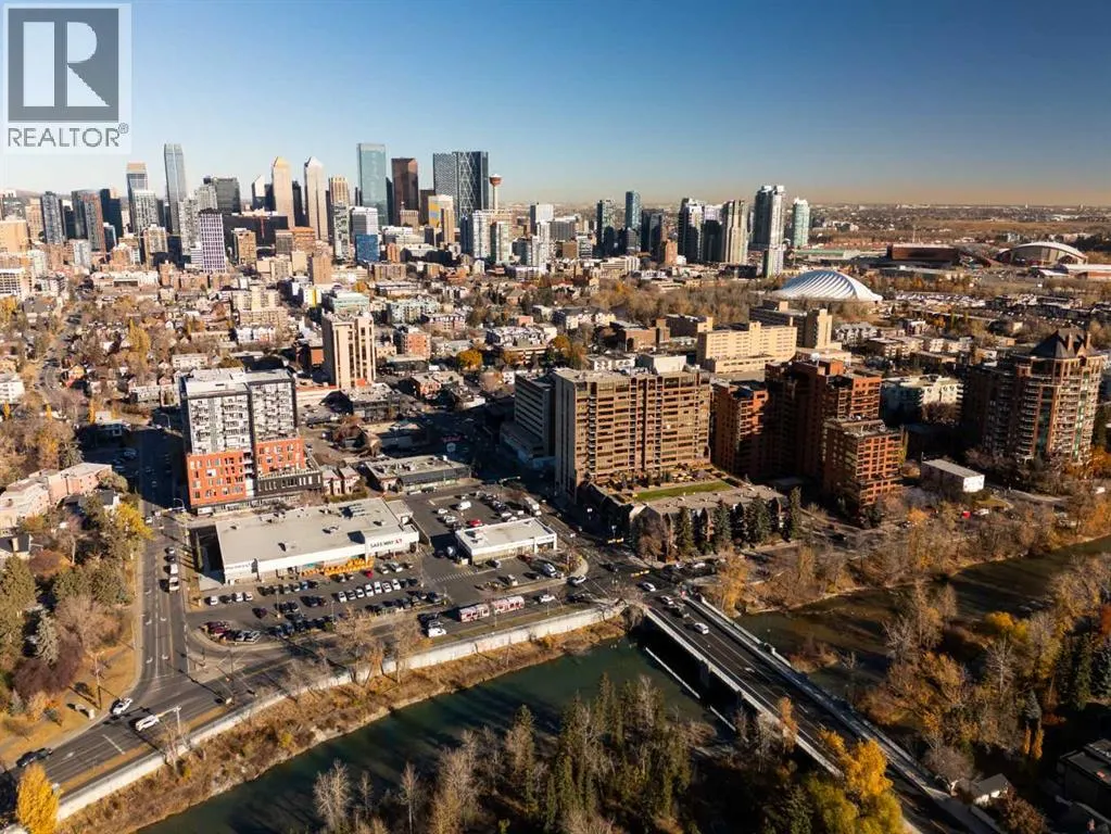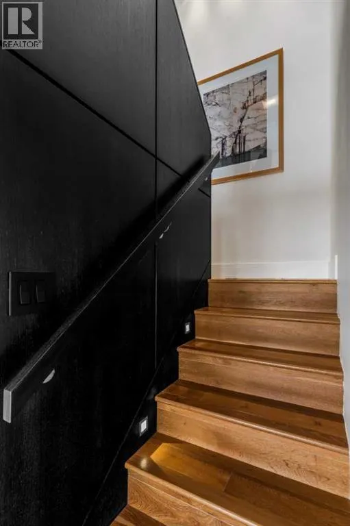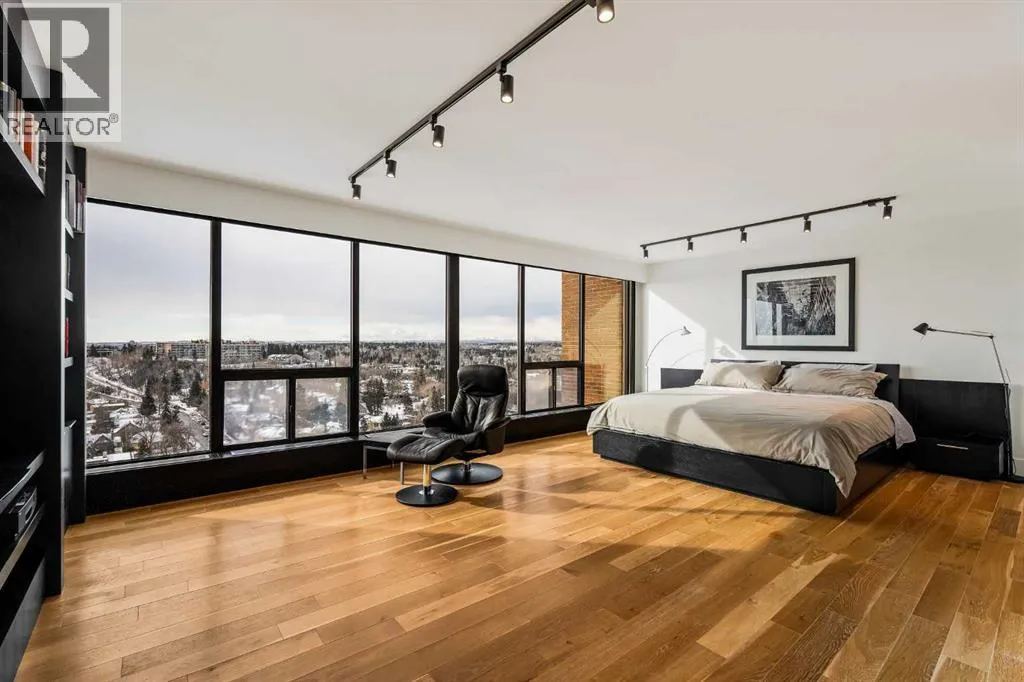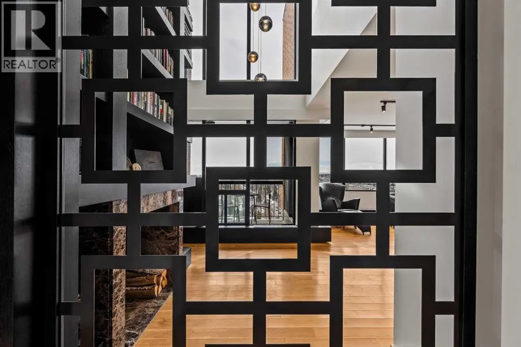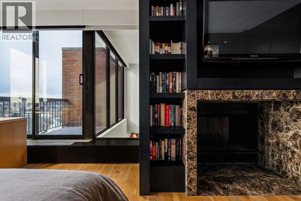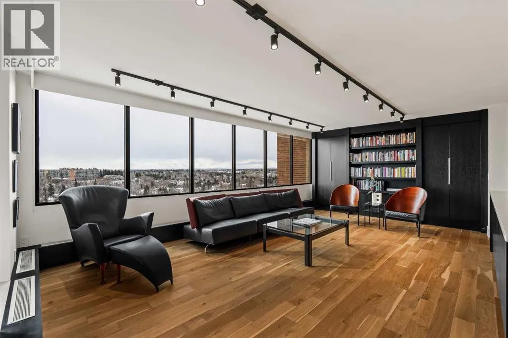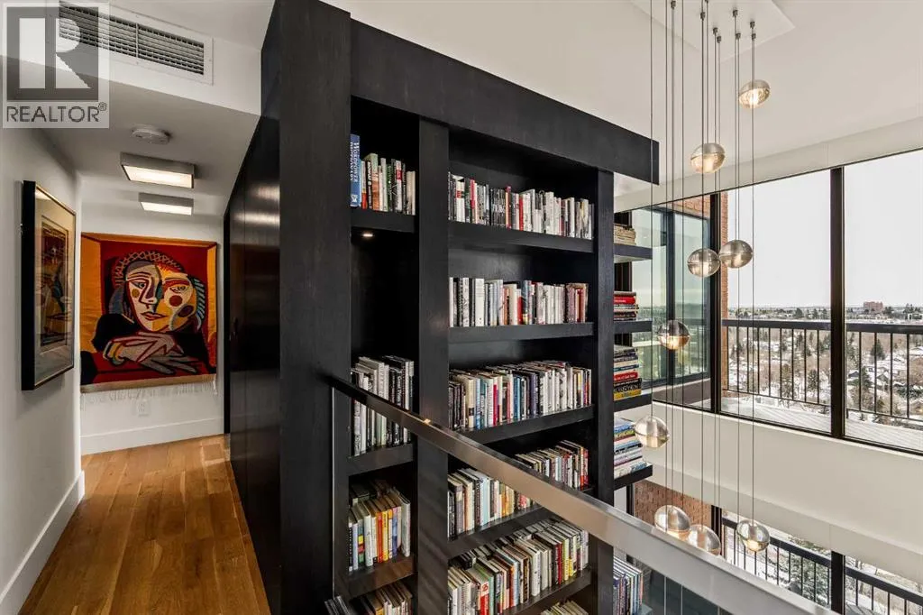 Architecturally renovated, this remarkable 2 storey penthouse delivers over 2,300 sq ft of refined living space with sweeping river valley and mountain views in the heart of Mission. Positioned within Roxboro House, one of Calgaryâs most established concrete buildings, the home places river pathways, restaurants, cafés and downtown access within an easy walk while maintaining a quiet elevated setting above the city. Dramatic double height ceilings define the main living space where floor to ceiling windows frame expansive views and fill the interior with natural light throughout the day. Custom millwork and built-in library shelving introduce architectural character while a striking Bocci designer light installation creates a sculptural focal point above the living area. Marble fireplace surrounds add warmth and elegance while hardwood flooring extends throughout the home to create a cohesive and timeless finish. Entertaining flows easily between the living and dining areas where open sightlines toward the river valley form an impressive backdrop for gatherings. Quartz countertops and a full height quartz backsplash highlight the beautifully renovated kitchen where extensive custom cabinetry and a large central island support both daily routines and larger entertaining. Walk-in pantry storage keeps the space organized while built-in speaker wiring enhances the atmosphere for hosting. Adjacent bar cabinetry incorporates three wine fridges with capacity for approximately 750 bottles, creating a dedicated entertaining feature rarely found in condominium living. Upper level design introduces a flexible den retreat with its own fireplace and access to a second balcony, offering an ideal setting for a home office, lounge or private reading space overlooking the city skyline while an included Murphy bed allows the space to easily accommodate overnight guests when needed. Primary bedroom accommodations prioritize comfort and privacy through large windows, blackout blinds an d extensive custom storage solutions. Heated floors in the lavish ensuite provide everyday comfort while modern fixtures enhance the spa-inspired atmosphere. Air conditioning supports year-round comfort and upper level laundry adds everyday convenience. Two private balconies extend the living space outdoors while showcasing panoramic mountain and river views. Tandem underground parking accommodates 2 vehicles and an assigned storage unit adds valuable extra space. Roxboro House residents enjoy secure entry with front desk service along with exceptional amenities including an indoor pool, hot tub, sauna, fitness room, woodworking shop, library and billiards lounge, party room and a beautifully landscaped sky terrace with BBQ areas and outdoor gathering spaces. Mission remains one of Calgaryâs most vibrant inner-city neighbourhoods where river pathways, parks, restaurants and boutique shopping create an exceptional walkable lifestyle just minutes from downtown. (id:27476)