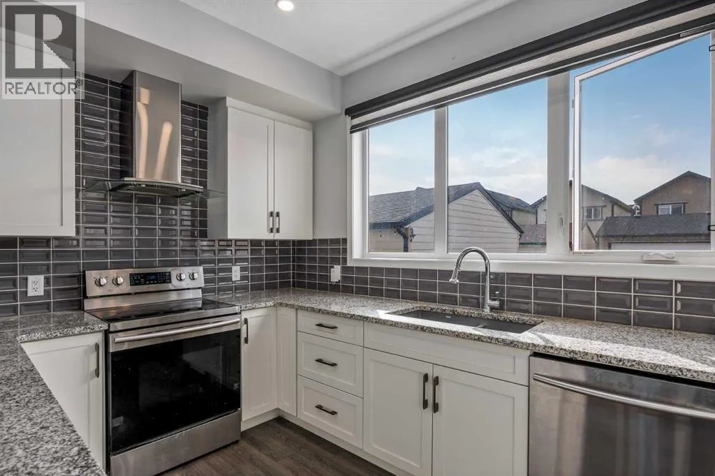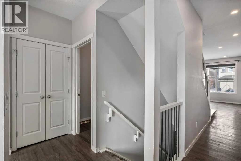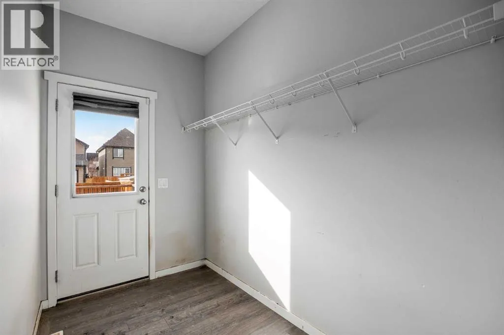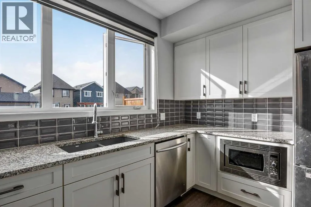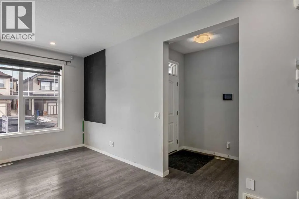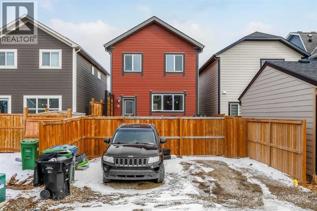 Excellent opportunity for a first-time buyer, an expanding family or an investor. Located in Mahogany on Calgaryâs SE edge, with quick access to downtown or Albertaâs natural treasures this 2.5 storey, 1,588 sq. ft., 3 bedrooms and 2.5 bathroom home allows for plenty of space to grow. The east-facing front yard has timesaving, low maintenance landscaping. On entering the foyer note the wide plank laminate flooring throughout and the high ceilings. On the right, the living room has lots of natural light due to the large front window. An adjacent den could be utilized as a home office. The dining room and kitchen are open concept. The dining area is substantial and would easily accommodate large gatherings. The kitchen is strikingly decorated in white and grays. White, modern cabinetry, stainless appliances and hood fan, light gray, quartz countertops and darker gray tiled backsplash plus an oversized window over the undermount, double sink make for a well-lit, inviting work area. A mudroom with an abundance of shelving leads to the rear deck and a 2-pc. bath complete this level. The carpeted second level boasts a generous primary bedroom with walk-in closet and an impressive 4-pc. tiled ensuite with double vanity. Two additional bedrooms share a 4-pc. bath. Laundry facilities with handy cabinets and shelving are conveniently located on this level. The lower level is unfinished and provides further options for development and expansion. The backyard is fully fenced with an expansive wooden deck for summer enjoyment. Three vehicles have room on the parking pad at the rear of the property which is accessed via the back lane. As noted, this home is close to Stoney and Deerfoot Trails, 52nd Street SE which leads to nearby shopping and restaurants, schools, playgrounds, Mahogany Lake and Wetlands and the South Health Campus. Take the leap and seize this incredible opportunity today! (id:27476)