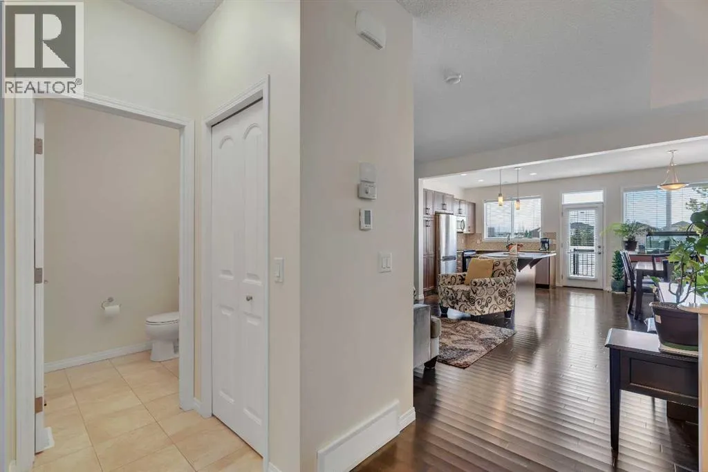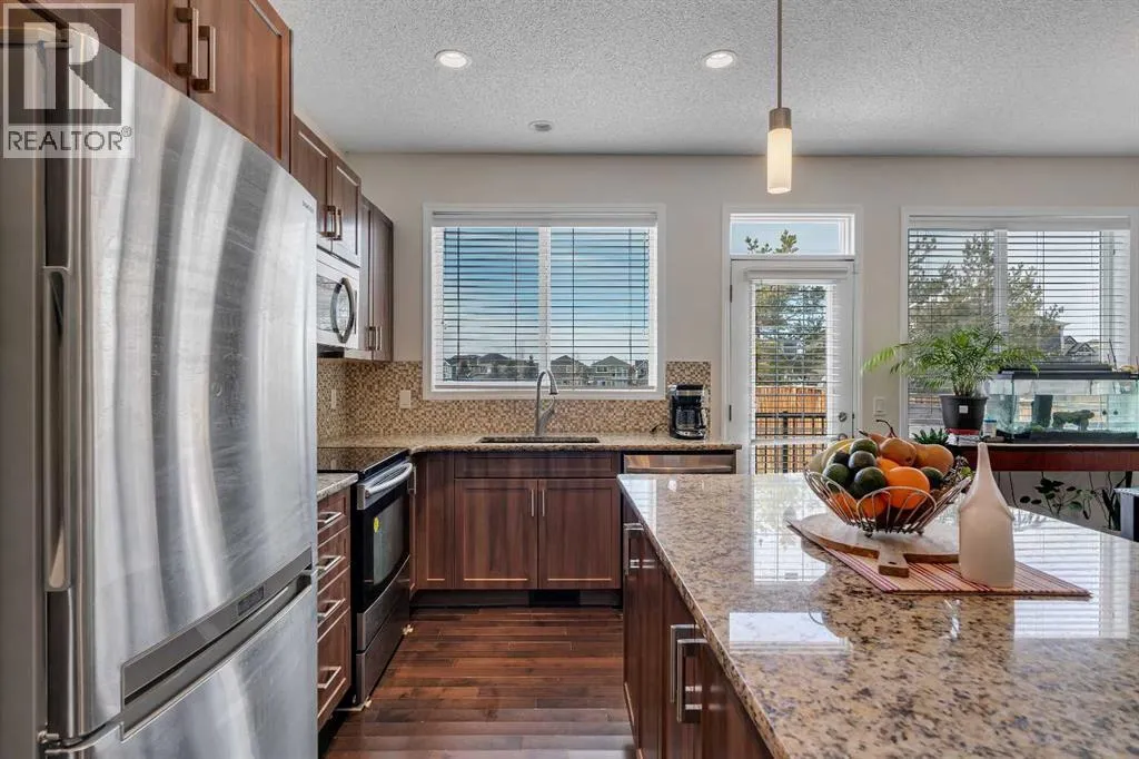 BACKING GREEN SPACE!! Welcome to this exceptional family home in the highly sought-after lake community of Auburn Bay. Ideally located on a quiet, family-friendly street, this beautifully finished home offers over 2,250 sq. ft. of thoughtfully designed living space and is just steps from schools, parks, restaurants, the lake, and all the amenities that make Auburn Bay such a vibrant place to live. Step inside to a spacious front entryway that leads into a bright open-concept main floor featuring rich hardwood flooring throughout. The main level also includes a generous dining area and a timeless kitchen designed for both everyday living and entertaining, complete with granite countertops, stainless steel appliances, and a large island with breakfast bar seating. Upstairs youâll find a functional three-bedroom layout plus a large bonus room, perfect for movie nights, a play area, or a home office. The primary suite features a walk-in closet and a private 4-piece ensuite, creating a comfortable retreat at the end of the day. The fully developed basement expands the living space even further with a fourth bedroom, recreation area, 3-piece bathroom, and laundry room with ample storage. Step outside to enjoy your fully landscaped backyard, complete with a spacious deck and lush lawn â ideal for summer barbecues, entertaining guests, or relaxing with family while enjoying the peaceful green space behind. Additional highlights include central air conditioning, a single attached garage, and quick access to Stoney Trail and Deerfoot Trail, making commuting throughout Calgary easy and convenient. (id:27476)