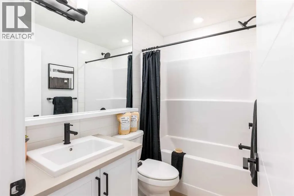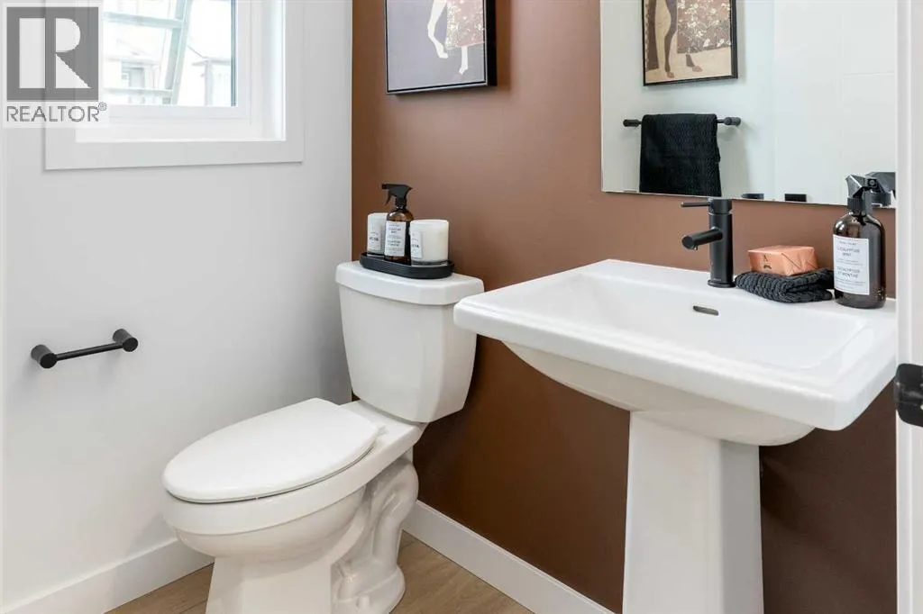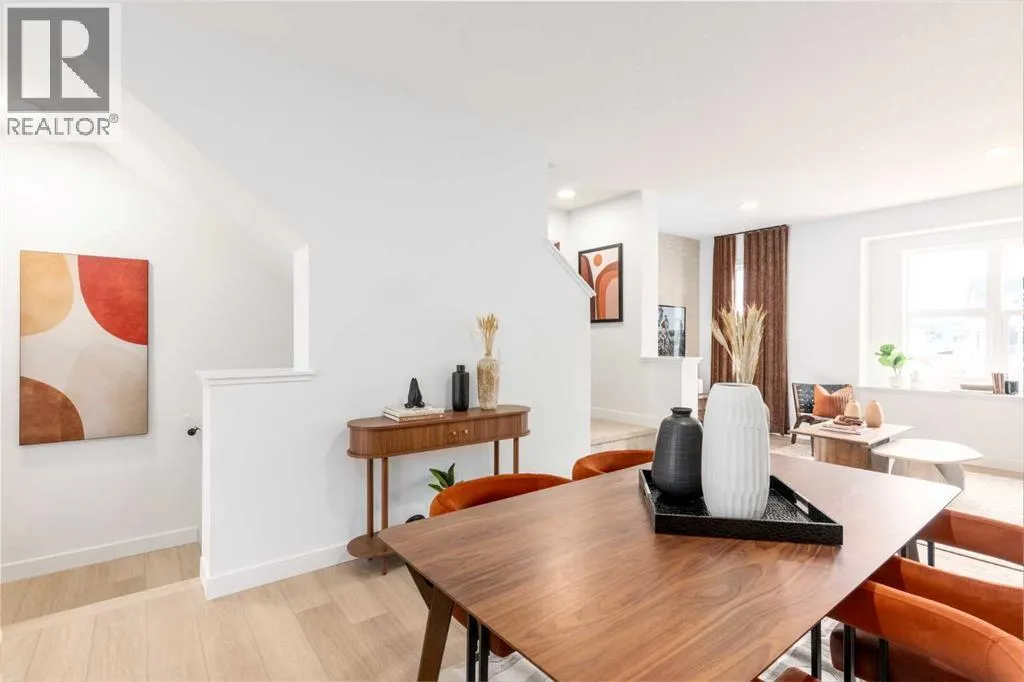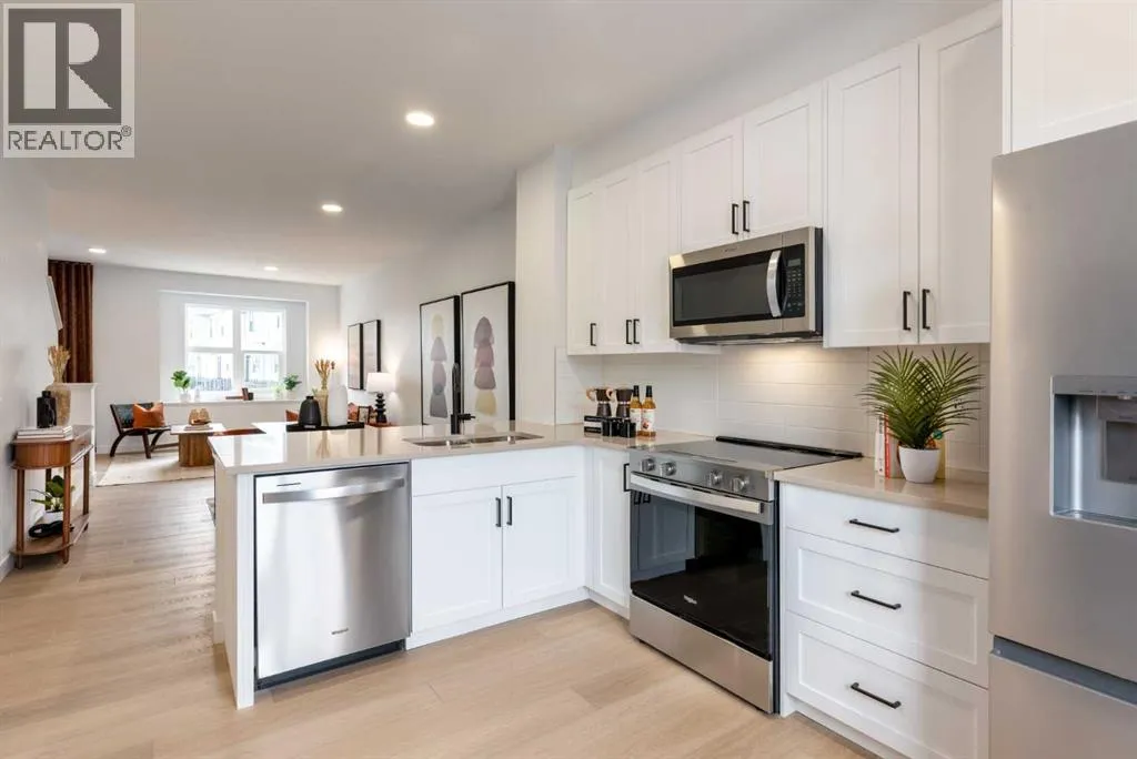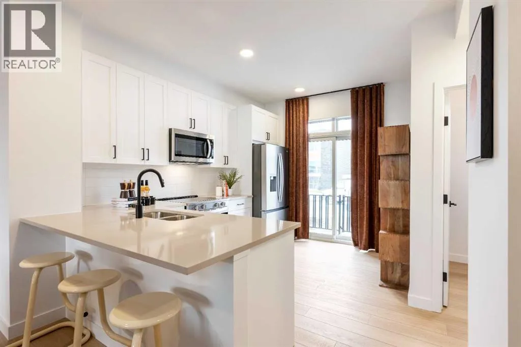 ALPINE PARK IS ONE OF THOSE COMMUNITIES PEOPLE TALK ABOUT AFTER THEYâVE WALKED IT. Wide boulevards, architecture that actually has personality, and a growing village centre designed to bring daily life close to home. If youâve been watching it take shape and waiting for the right opportunity to get in, this THREE-STOREY Jasmine model at 303, 437 Alpine Avenue SW deserves a closer look.This BRAND-NEW Homes by Avi townhome offers 1,285 square feet of thoughtfully arranged living space across three levels. The east-facing entry opens to a clean, practical ground floor with a welcoming foyer, interior access to the home, and a DOUBLE ATTACHED TANDEM GARAGE that stretches nearly forty feet deepâplenty of room for two vehicles plus bikes, seasonal gear, or the kind of storage every household eventually accumulates. And with construction complete, possession can happen on your timeline.Upstairs is where the home really opens up. The main living level connects the kitchen, dining, and living spaces in one BRIGHT, EASY-FLOWING LAYOUT designed for real everyday life. QUARTZ COUNTERTOPS, a contemporary tile backsplash, pantry storage, and a GENEROUS BREAKFAST BAR give the kitchen both presence and practicality. Just off the dining area, a WEST-FACING BALCONY spans more than sixteen feetâwide enough for a proper outdoor setup and perfectly placed for quiet morning coffee or relaxed evening meals above the street.The top floor keeps the private spaces thoughtfully separated. The primary bedroom includes a walk-in closet and a streamlined three-piece ensuite, while the second bedroom also enjoys its own walk-in closet and convenient access to another full bathroom. A FLEXIBLE DEN sits between the bedroomsâideal for a home office, reading nook, workout space, or nurseryâand the laundry room is right where you want it: upstairs, close to the bedrooms.Outside, the exterior architecture blends MODERN MATERIALS AND CRISP LINES that fit perfectly with Alpine Parkâs design-forwa rd streetscape. Step beyond the front door and youâre surrounded by PARKS, PATHWAYS, AND GREEN BOULEVARDS, with the future Village Centre set to bring cafés, shops, and neighbourhood energy just minutes away.The home is finished. The keys are waiting. Come see what life in Alpine Park is starting to look like. ⢠PLEASE NOTE: Photos are of a SHOWHOME of the same model â fit and finish may differ. Interior selections and floorplans shown in photos. (id:27476)