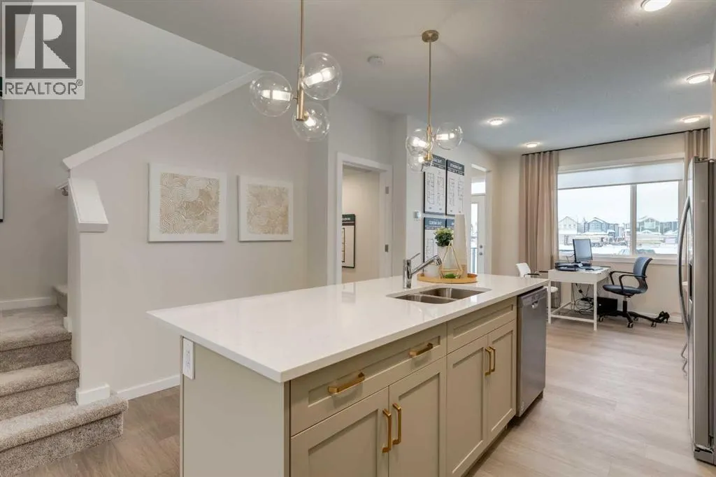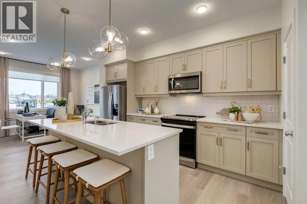 THIS IS THE KIND OF FIRST HOME PEOPLE REMEMBER. The kind youâre proud to unlock at the end of the day, proud to invite people into, and proud to call your own. Set next to a COMMUNITY PARK, this Finley model from Homes by Avi offers a thoughtful layout, polished finishes, and an everyday rhythm thatâs been designed around how people actually live.The main floor brings the kitchen, dining, and lounge together in a way that feels open without feeling chaotic. The kitchen anchors the space with FULL-HEIGHT CABINETRY, A CHIMNEY-STYLE HOOD FAN, BUILT-IN MICROWAVE, QUARTZ COUNTERTOPS, and clean tile finishes â confident, practical choices that look good and hold up to real use. Whether itâs busy mornings, relaxed evenings, or hosting family and friends, this space keeps up.Upstairs, all three bedrooms are positioned for privacy and balance, with laundry right where you want it â on the same level. The primary bedroom includes a generous walk-in closet, and both upper bathrooms are finished with quartz counters and modern tile that feels fresh, calm, and easy to live with over time.Outdoor living is thoughtfully split between front and back. The FULL-WIDTH FRONT PORCH overlooks the park and feels like an extension of daily life â a place to sit, connect, and take in the neighbourhood. At the rear, a CONCRETE PATIO provides practical outdoor space for grilling, relaxing, or stepping outside, while the gravel parking pad with alley access is located just beyond.SAVANNA IS ALREADY ESTABLISHED, and that shows. SCHOOLS, SHOPPING, TRANSIT ACCESS, and everyday amenities are all close by, creating a neighbourhood where routines are easy and community feels real. This is a place where people put down roots, celebrate milestones, and build a life.If youâre ready for a first home that feels exciting, grounded, and genuinely well put together, this is one youâll want to experience IN PERSON. Contact your agent, book a showing, and see how naturally it all comes together. ⢠PLEASE NOTE: Photos are of a Showhome of the same model â fit and finish may differ. Interior selections and floorplans shown in photos. (id:27476)