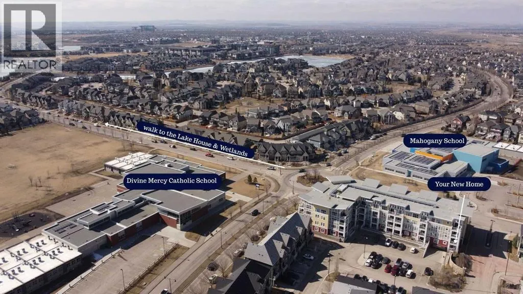 Welcome to Ebony in Mahogany, Built by Jayman this Condo offers a gym and easy walking access to the main beach in Mahogany. The community offers an incredible lifestyle with restaurants, cafes, shops, scenic pathways, year round access to Lake Mahogany with sandy beaches, paddle boarding, fishing, skating in winter. This luxuriously upgraded former Jayman Showhome is a bright end unit with abundant windows that fill the space with natural light. The main floor location offers convenient access to the generous covered southwest patio, perfect for relaxing outdoors or enjoying summer evenings, imagine reading a book on a rainy day. A private exterior gate provides direct access to the unit, making it especially convenient for those with dogs or guests arriving directly from outside. Meticulously cared for, this home is truly move in ready with new carpets and a dishwasher replaced within the past year. The modern kitchen showcases rich espresso cabinetry, sleek dark granite countertops and a striking mosaic tile backsplash. Stainless steel appliances and abundant cabinetry create a highly functional workspace while the oversized island with seating invites casual dining and conversation. Contemporary lighting enhances the space and the window over the kitchen sink allows additional natural light while offering a pleasant outlook outside. The living room offers a comfortable space where relaxing is key, with large windows that bring in beautiful natural light and create an ideal environment for plants to thrive. The spacious primary bedroom easily accommodates larger furniture and features a walk in closet along with a well appointed three piece ensuite with stone counter and stylish shower. The second bedroom is thoughtfully positioned on the opposite side of the kitchen, providing excellent privacy for guests, roommates or a home office. A four piece bathroom is conveniently located just outside the bedroom. The welcoming front entry offers space for guests to arriv e comfortably while the in suite laundry room includes additional shelving for practical storage. A window Air Conditioning unit provides welcome comfort during warm summer months. An exceptional opportunity to enjoy stylish living and the incredible Mahogany lifestyle. (id:27476)