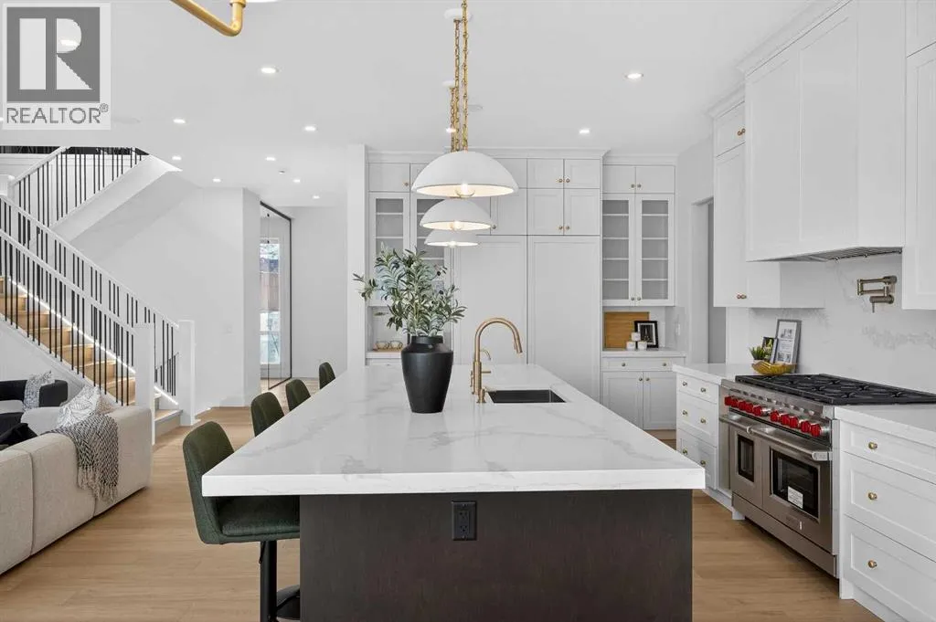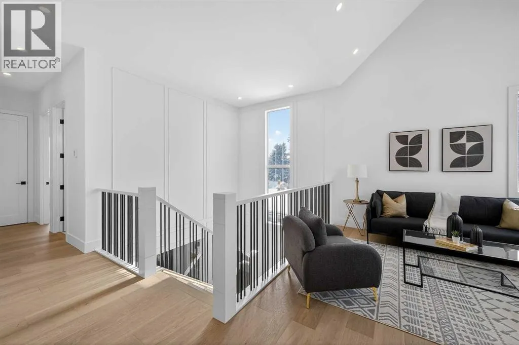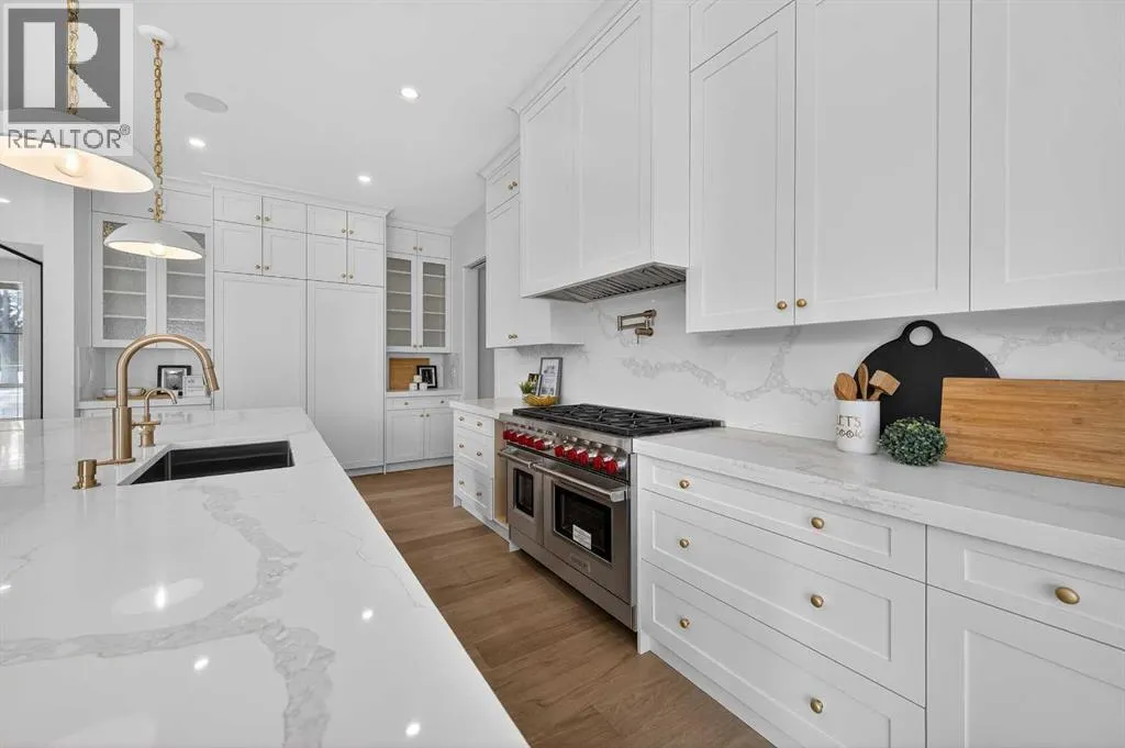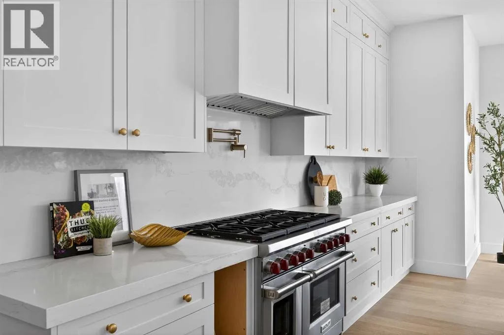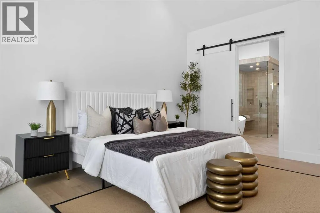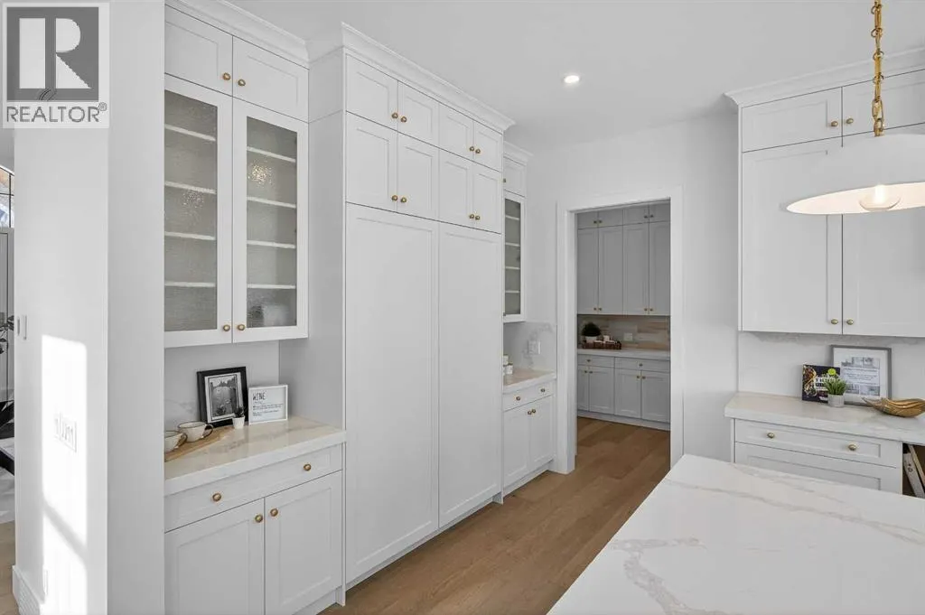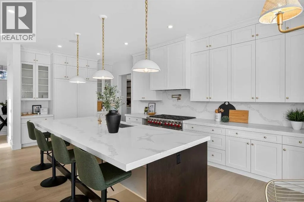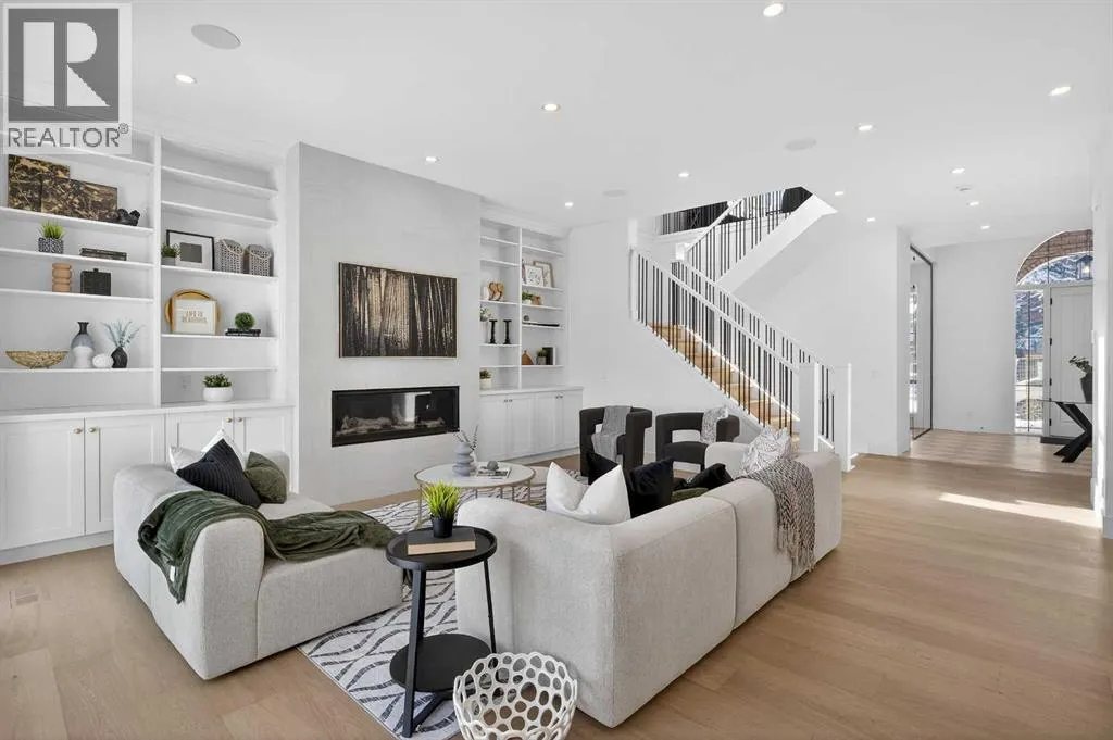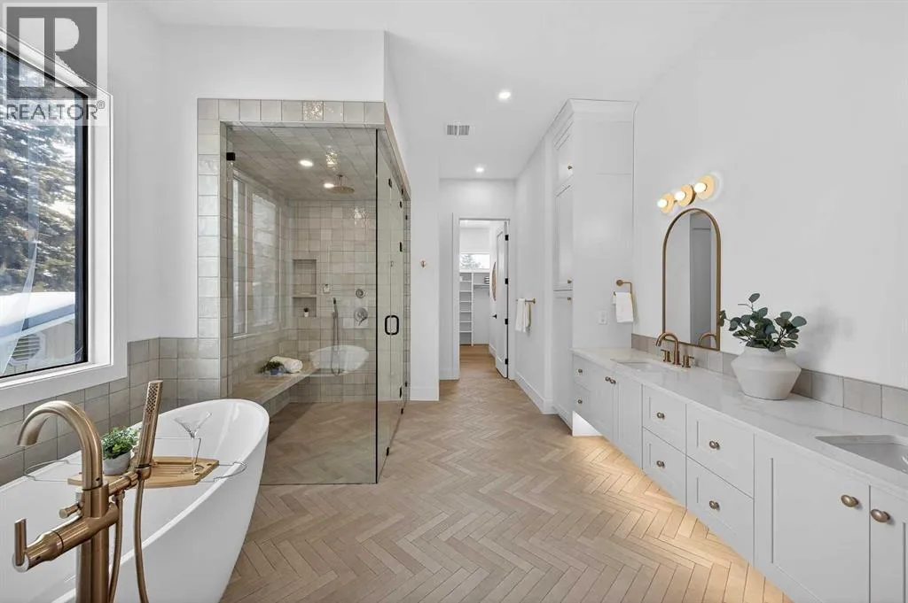 Introducing a stunning new-construction Modern Farmhouse estate that represents a sophisticated blend of transitional luxury and contemporary design. Captivating curb appeal is achieved through a striking neutral palette, a grand arched entryway, and an abundance of oversized, black-framed windows that create a dramatic, light-filled welcome. This residence boasts over 4,900 sq ft of total living space, including more than 3,300 sq ft on the upper levels, featuring 6 spacious bedrooms and 4.5 luxurious bathrooms. Experience true volume with 10-foot ceilings on the main and second levels, complemented by premium engineered hardwood flooring throughout the upper floors. The kitchen is a culinary masterpiece equipped with top-tier appliances, including a built-in Sub-Zero refrigerator and freezer, an 8-burner Wolf gas range, and a matching Wolf hood fan, while a dedicated butlerâs pantry with a sink adds further convenience for entertaining.The upstairs Primary Suite serves as a private sanctuary featuring a vaulted ceiling and a bespoke walk-in closet with a central island. The spa-like ensuite offers the ultimate in comfort with heated floors finished in a stunning herringbone pattern tile. For ultimate family convenience, every secondary bedroom on the second floor also includes its own private washroom and walk-in closet. The expansive lower level significantly extends the living space and features heated floors throughout for year-round comfort. This basement includes three additional spacious bedrooms, a luxurious 5-piece bathroom, and an incredible recreation area complete with a sprawling family room and a full bar, perfectly appointed for movie nights or hosting guests.Engineered for peak efficiency and performance, this home features the newest technology NTI boiler furnace integrated with flexible duct vent technology. The highly functional features continue with a cozy gas fireplace in the living room and a second gas fireplace located outside on the co ncrete patio for elegant outdoor entertaining. The main floor also includes a functional mudroom and a rough-in dog wash area, proving that this house truly has it all. Situated in prestigious Lakeview SW, this estate is surrounded by mature trees and offers phenomenal connectivity, located less than a 15-minute drive from Downtown Calgary. It is minutes away from Mount Royal University and Rockyview General Hospital, with immediate access to North Glenmore Park and elite Golf Clubs. This home sets a new standard for move-in-ready, transitional luxury living. An opportunity not to be missedâcall your favorite realtor today to book a private showing. The lockbox is hanging on the pole directly in front of the house for easy access. (id:27476)