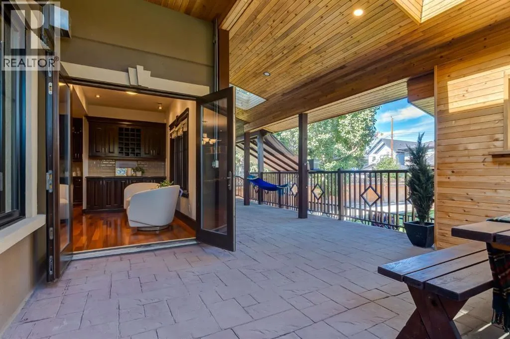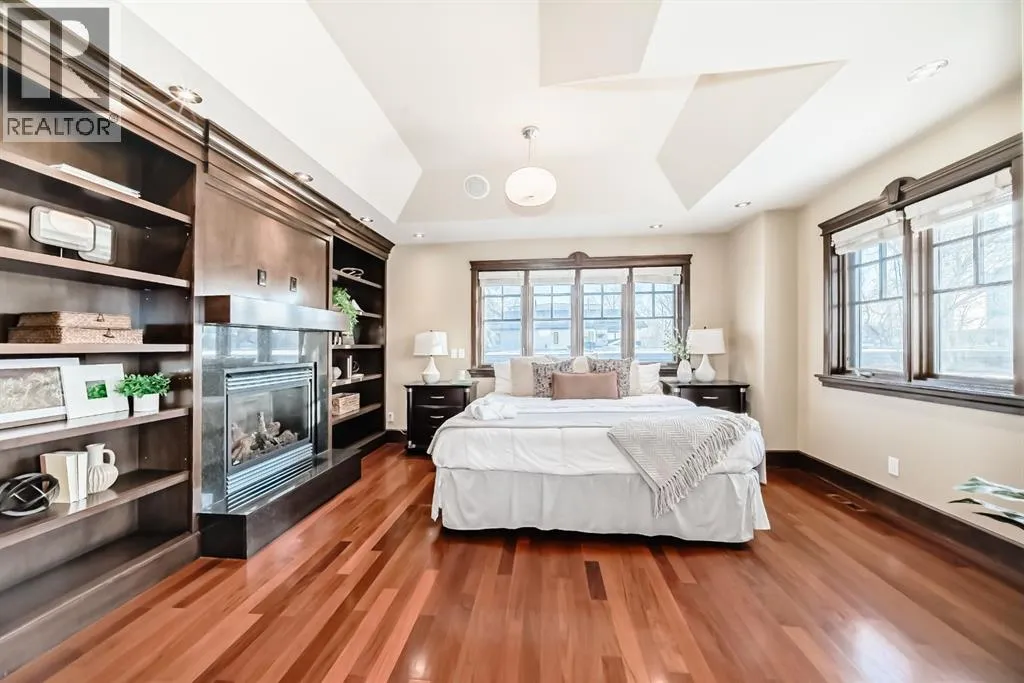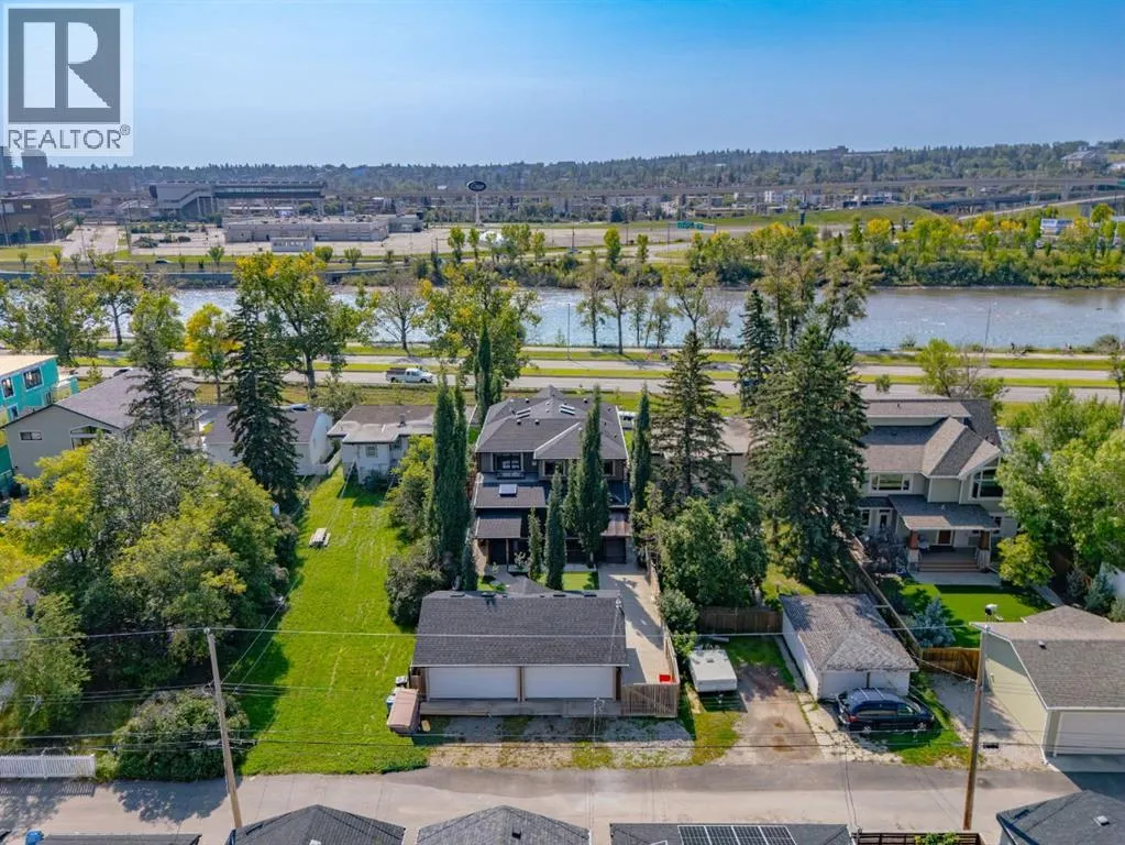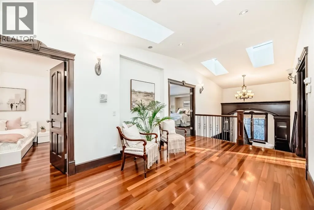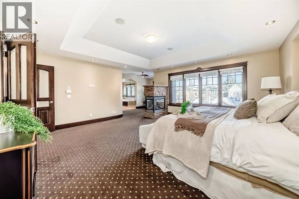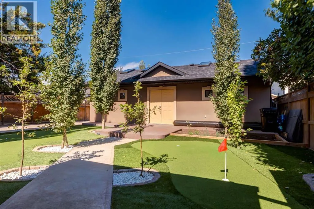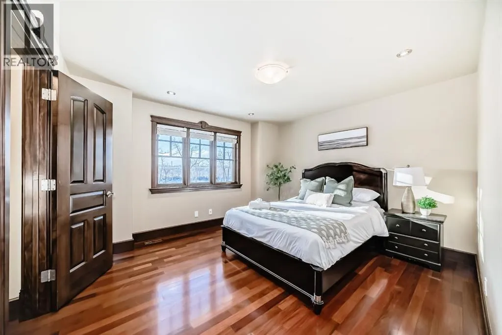 Welcome to this extraordinary custom riverfront estate positioned directly across from downtown Calgary, offering unobstructed Bow River and skyline views on a rare 179â deep lot in the heart of Hillhurst. Situated on an expansive ~8,300+ sq. ft. parcel, this one-of-a-kind residence offers over 5,200 sq. ft. of meticulously crafted living space plus more than 1,100 sq. ft. of covered outdoor living, delivering exceptional scale, craftsmanship, and enduring luxury. This custom-built home features over 8,000 board feet of handcrafted maple millwork, solid maple doors, Brazilian walnut flooring, and an extraordinary selection of exotic hardwoods including tigerwood, birdâs-eye maple, ebony, walnut, and cherry. Architectural details include curved moldings and archways, stone posts, wainscotting, in-stair lighting, built-in speakers, over 200 pot lights, and 11 skylights, creating a warm, timeless ambiance throughout. The main floor is thoughtfully designed for both everyday living and elegant entertaining, highlighted by a front-facing primary bedroom with spa-inspired ensuite featuring in-floor heating, jetted tub, and shower. A formal dining room or executive office complements the showpiece chefâs kitchen, equipped with a 36â Wolf gas range with pot filler, Sub-Zero refrigerator, Bosch dishwasher, walk-in pantry, beveled granite countertops, curved cabinetry, and a custom removable island table. The adjoining living room centers around a fireplace and opens seamlessly to expansive covered decks with cedar ceilings and stamped concrete flooring for year-round indoor-outdoor living. The upper level hosts four additional bedrooms, including two luxurious primary suites with fireplaces and spa-inspired ensuites. The main upper retreat offers a fireplace, sitting area, walk-in closet, steam shower, air-jetted tub, heated floors, and refined finishes. Two additional bedrooms share a Jack-and-Jill bath, alongside a wet bar, second-storey balcony with breathtaking river and skyline views, and a dedicated laundry room. The fully developed walk-out basement features in-floor heating, a recreation room, full kitchenette, two additional bedrooms, and two bathrooms, ideal for extended family, guests, or future income potential. Outdoor living is exceptional, with newly landscaped grounds, and two private putting greens. The real-stone exterior, stamped-concrete driveway, rear alley access, finished four-car garage, 66â RV pad, and parking for up to eleven vehicles complete this rare offering. Recent upgrades include a new roof, downspouts, central A/C, updated mechanicals, and a pre-poured foundation provides a ready-to-build addition (with city of Calgary Permit Approval). Energy-efficient features include triple-pane windows, thicker plywood sheathing, and premium construction materials, enhancing comfort, durability, and lowering utilities. Steps from river pathways, downtown, UofC, SAIT, and Foothills Hospital, this is a rare riverfront estate that truly stands apart. (id:27476)