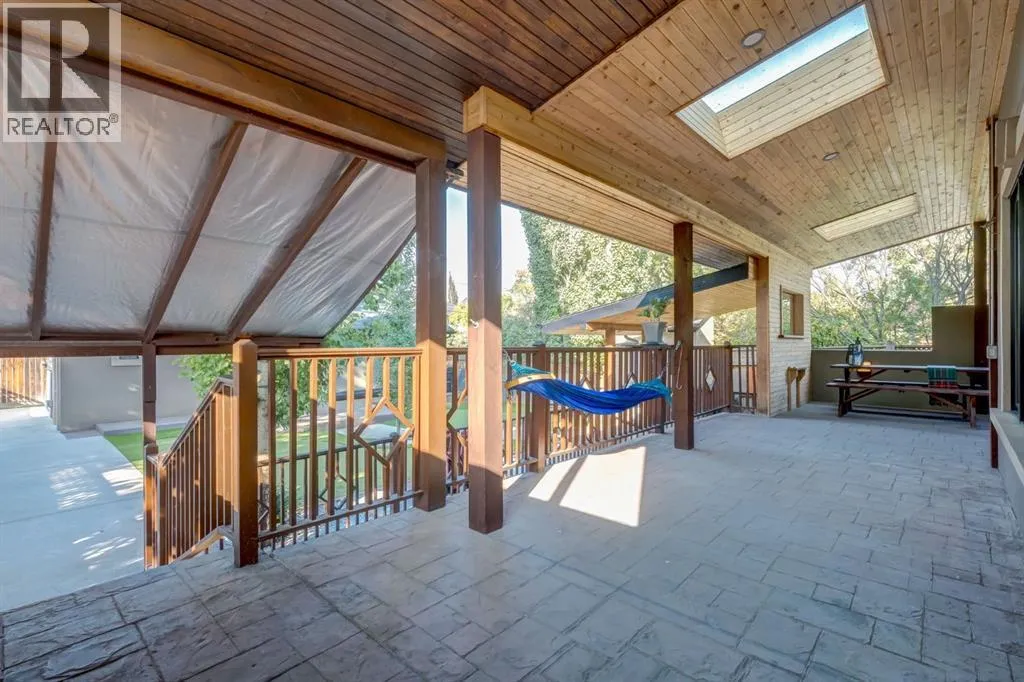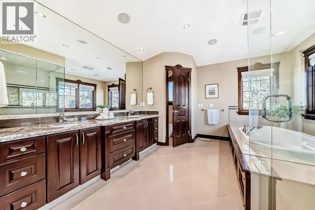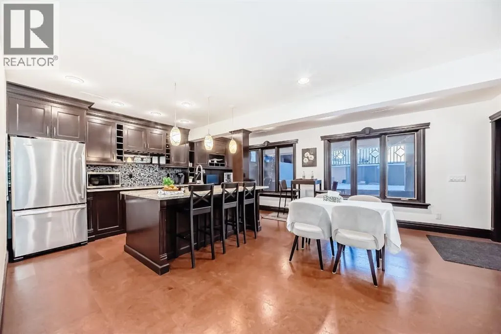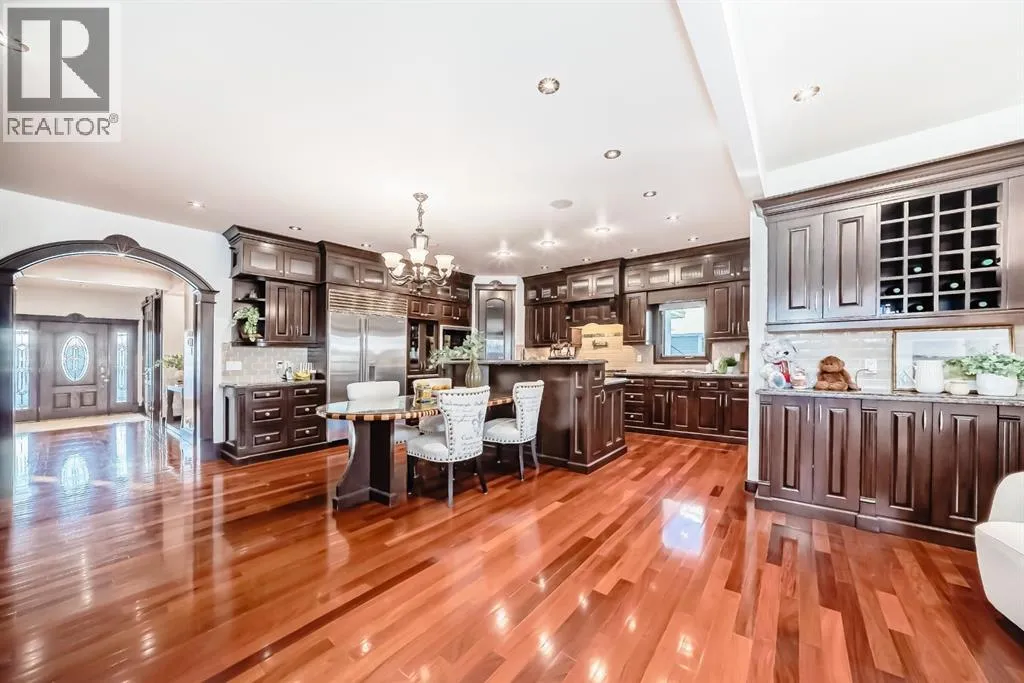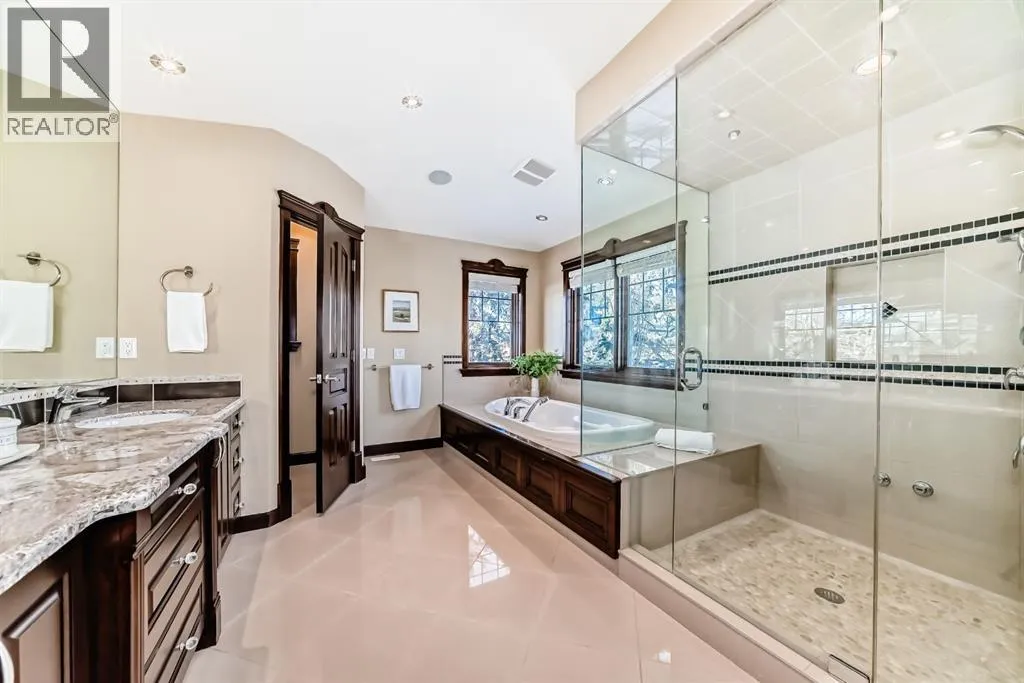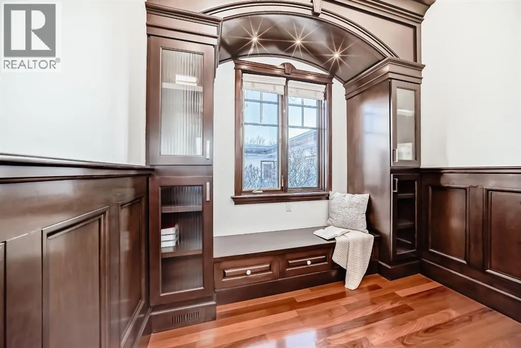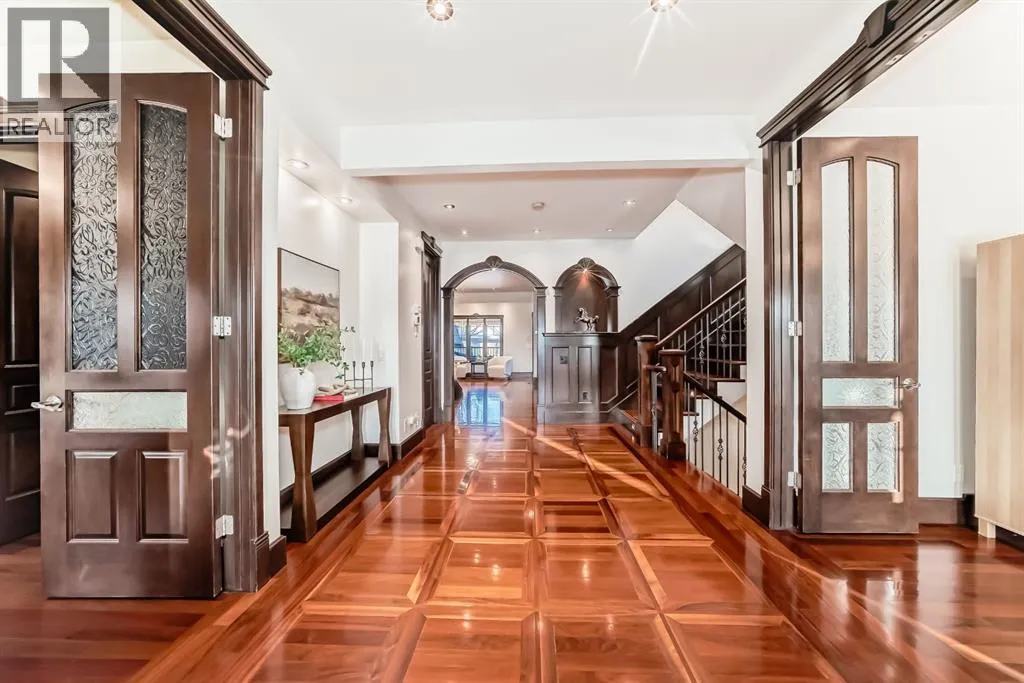 Welcome to this extraordinary custom riverfront estate positioned directly across from downtown Calgary, offering unobstructed Bow River and skyline views on a rare 179â deep lot in the heart of Hillhurst. Situated on an expansive ~8,300+ sq. ft. parcel, this one-of-a-kind residence offers over 5,200 sq. ft. of meticulously crafted living space plus more than 1,100 sq. ft. of covered outdoor living, delivering exceptional scale, craftsmanship, and enduring luxury. This custom-built home features over 8,000 board feet of handcrafted maple millwork, solid maple doors, Brazilian walnut flooring, and an extraordinary selection of exotic hardwoods including tigerwood, birdâs-eye maple, ebony, walnut, and cherry. Architectural details include curved moldings and archways, stone posts, wainscotting, in-stair lighting, built-in speakers, over 200 pot lights, and 11 skylights, creating a warm, timeless ambiance throughout. The main floor is thoughtfully designed for both everyday living and elegant entertaining, highlighted by a front-facing primary bedroom with spa-inspired ensuite featuring in-floor heating, jetted tub, and shower. A formal dining room or executive office complements the showpiece chefâs kitchen, equipped with a 36â Wolf gas range with pot filler, Sub-Zero refrigerator, Bosch dishwasher, walk-in pantry, beveled granite countertops, curved cabinetry, and a custom removable island table. The adjoining living room centers around a fireplace and opens seamlessly to expansive covered decks with cedar ceilings and stamped concrete flooring for year-round indoor-outdoor living. The upper level hosts four additional bedrooms, including two luxurious primary suites with fireplaces and spa-inspired ensuites. The main upper retreat offers a fireplace, sitting area, walk-in closet, steam shower, air-jetted tub, heated floors, and refined finishes. Two additional bedrooms share a Jack-and-Jill bath, alongside a wet bar, second-storey balcony with breathtaking river and skyline views, and a dedicated laundry room. The fully developed walk-out basement features in-floor heating, a recreation room, full kitchenette, two additional bedrooms, and two bathrooms, ideal for extended family, guests, or future income potential. Outdoor living is exceptional, with newly landscaped grounds, and two private putting greens. The real-stone exterior, stamped-concrete driveway, rear alley access, finished four-car garage, 66â RV pad, and parking for up to eleven vehicles complete this rare offering. Recent upgrades include a new roof, downspouts, central A/C, updated mechanicals, and a pre-poured foundation provides a ready-to-build addition (with city of Calgary Permit Approval). Energy-efficient features include triple-pane windows, thicker plywood sheathing, and premium construction materials, enhancing comfort, durability, and lowering utilities. Steps from river pathways, downtown, UofC, SAIT, and Foothills Hospital, this is a rare riverfront estate that truly stands apart. (id:27476)