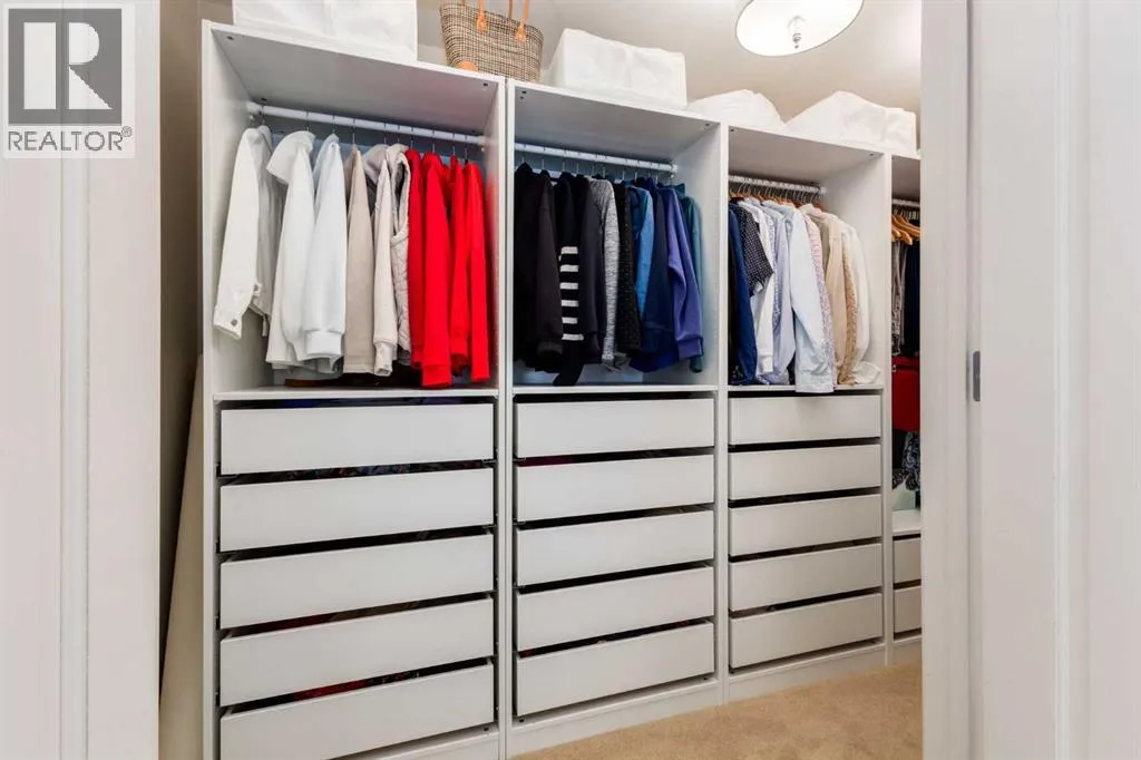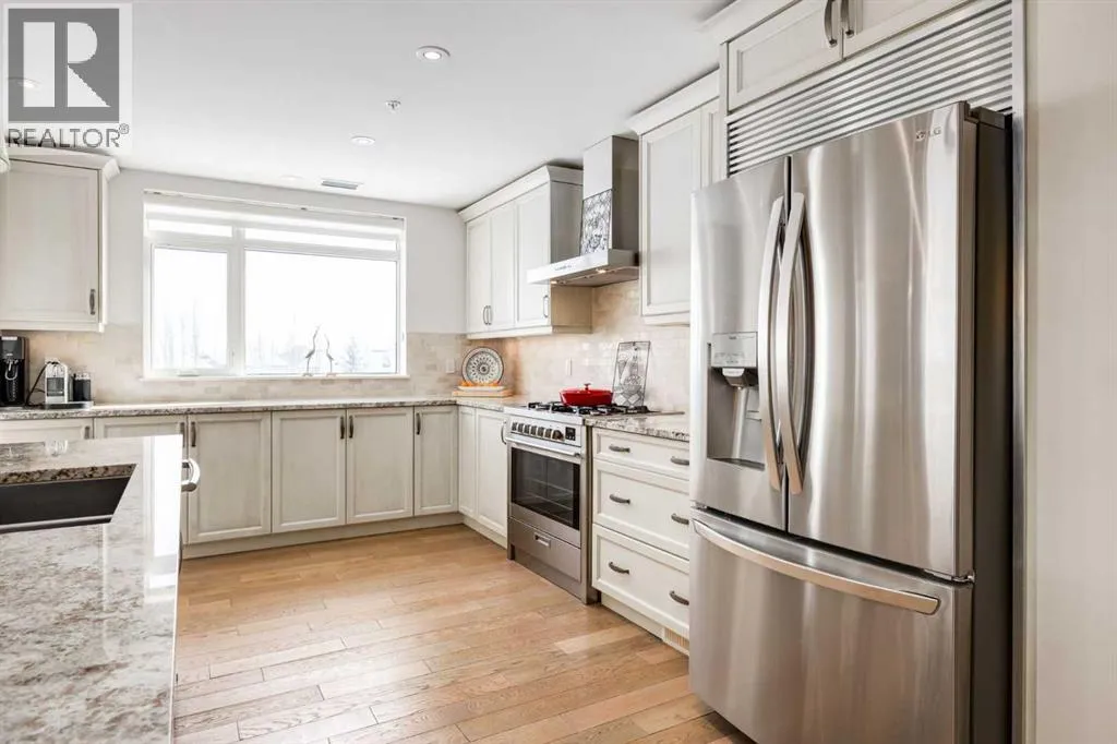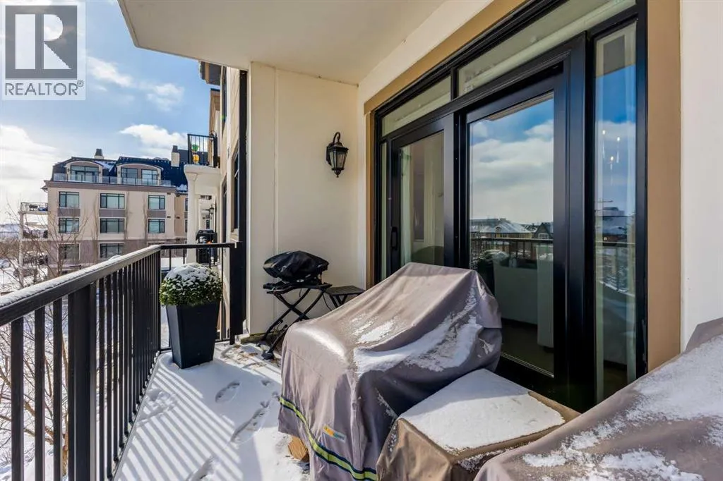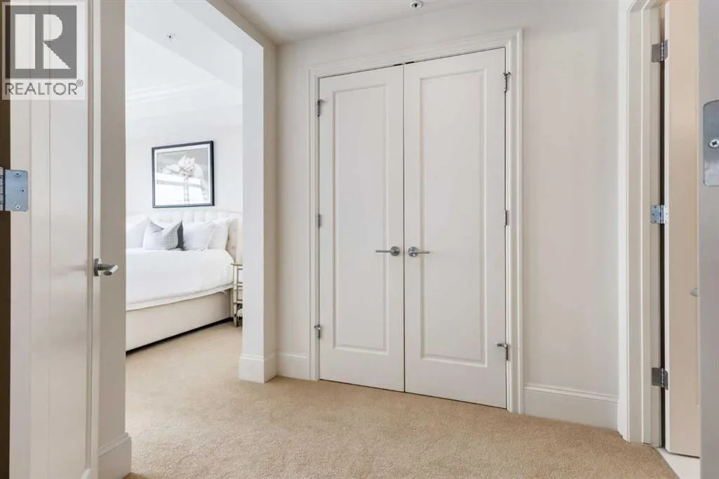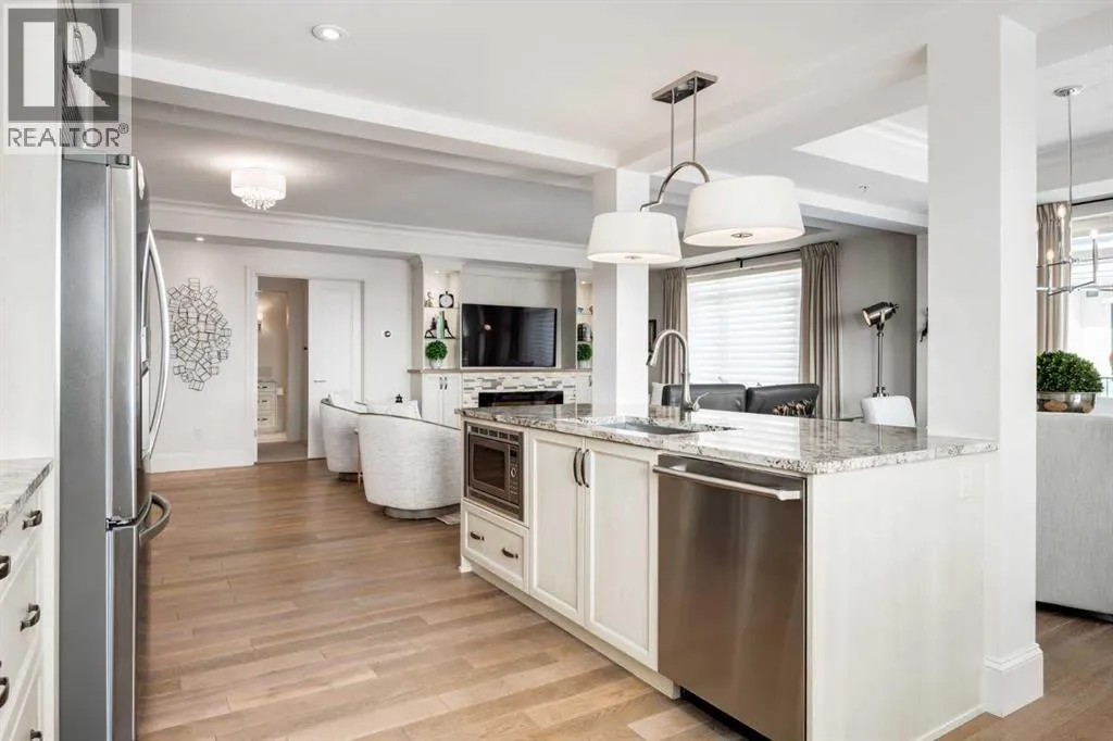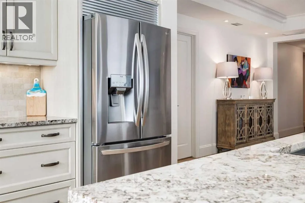 For some, luxury is an occasional indulgence. For others, it is a way of life. If every day luxury & refined living are what you desire, look no further than this outstanding CORNER suite at Champagne in Quarry Park. Offering 1631 SF of impeccably curated living space, with 9-foot ceilings that are flooded with natural light & serene tree top views. Every detail has been thoughtfully considered & the spacious floor plan is sure to delight. A gracious front entrance welcomes you into the suite, & offers a walk-in closet and custom built in cabinetry for your storage needs. The spacious living area with hardwood flooring throughout is sure to delight - a cozy fireplace surrounded by built-ins anchors the living room, sunny & bright dining area with windows on 2 sides is ready to host your family gatherings and provides patio door access to the east facing balcony. The show-stopping kitchen is a chefs dream â expansive island & granite counters, full tile backsplash, luxurious stainless steel appliances including a gas stove & new LG fridge with water/ice dispenser, and an abundance of cabinets providing ample storage including wire pull out racks â so convenient! The serene primary retreat is generously proportioned & offers space for a king-sized bedroom suite & sitting area, while the 5 piece ensuite bath delivers a spa-like experience worthy of a luxury hotel â featuring a relaxing soaking tub, separate shower, granite counters & dual sinks. The walk in closet features a new custom closet system. Second bedroom, equally well-appointed, provides dual aspect windows with beautiful river views & a 3 piece ensuite bath. Additional features include central air conditioning, coffered ceilings, estate millwork, solid core doors, new LG wash/dryer tower with steam function, new composite decking installed on the balcony, new carpet in both bedrooms, Hunter Douglas blinds throughout (black out blinds in the bedrooms), custom drapery in this non-smoking, pet-free home. TWO t itled, side by side underground parking stalls are included, located very close to the elevator, a rare & valuable convenience. Also included is a titled storage locker on the same level as the parking spots. Youâll appreciate the peace of mind that comes with Champagneâs reputation for exceptional maintenance & inherently quiet concrete construction. Additional building features include 2 car wash bays, bicycle storage, plenty of visitor parking & a peaceful courtyard. Plus itâs pet friending â 2 dogs or cats or combo of both, with board approval. The location canât be beat! Walk to Carburn Park, The Market at Quarry Park offers great amenities including Starbucks, The Park and Original Joeâs restaurants & Co-Op grocery, the Remington YMCA is just around the corner and of course the extensive river pathway system is just outside your door. Easy access to major traffic routes and numerous SE Calgary amenities. This unit shows like new and must be viewed in person to be fully appreciated! (id:27476)