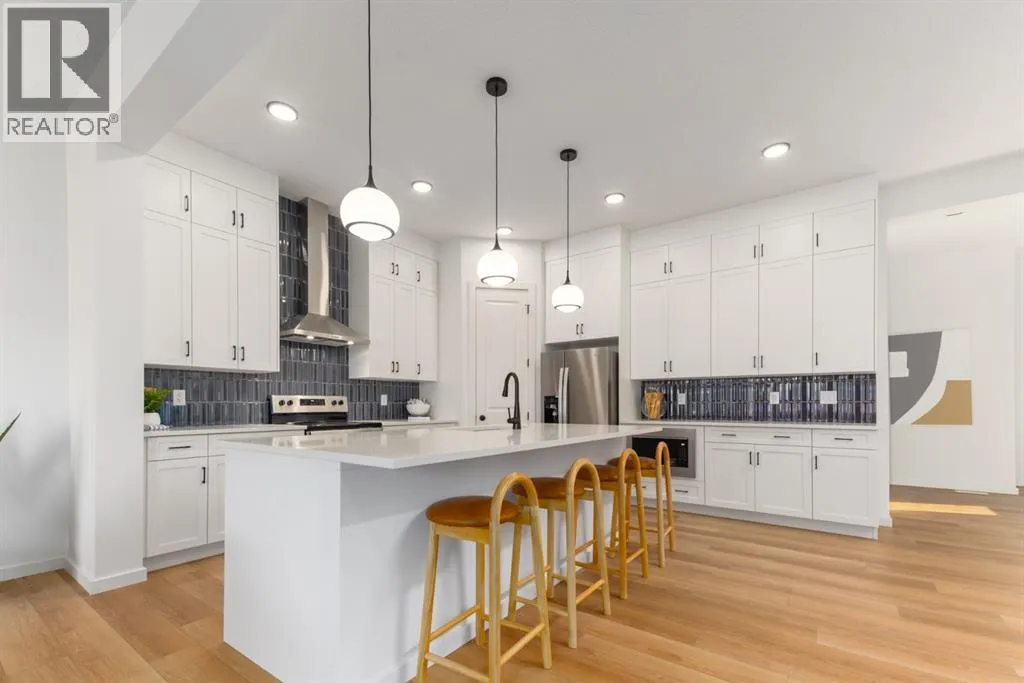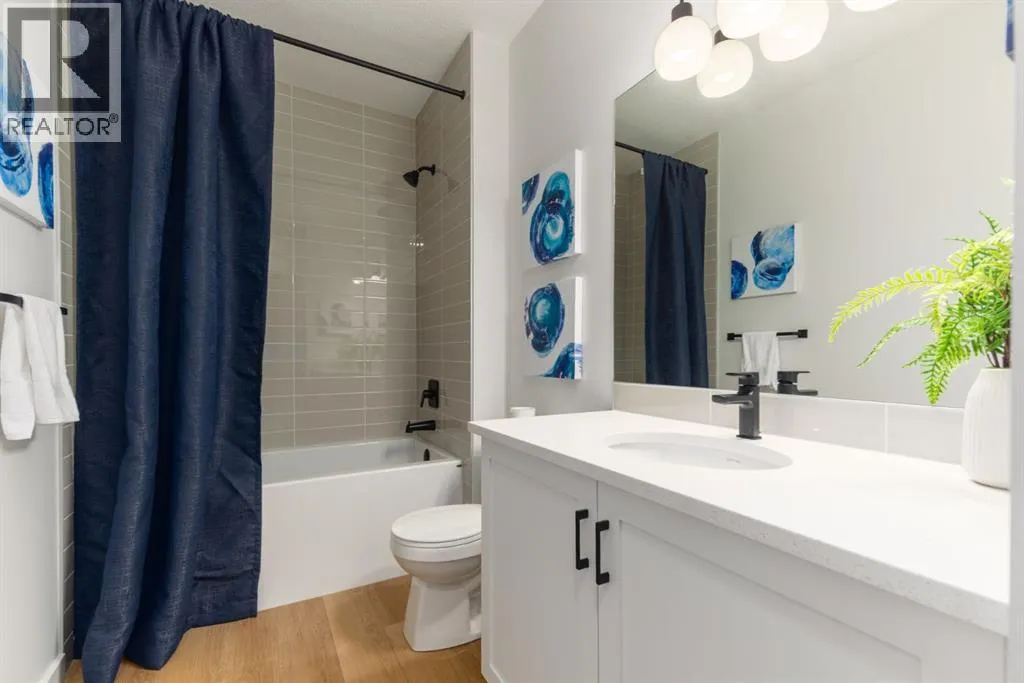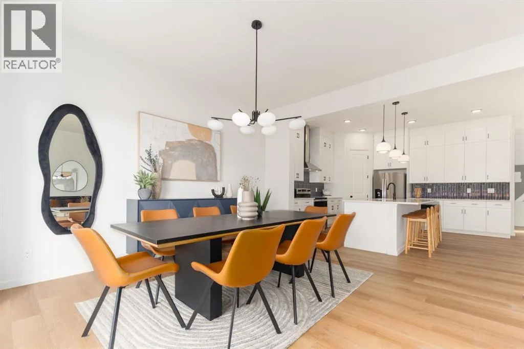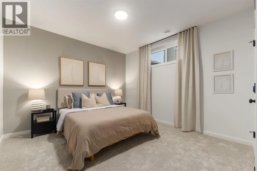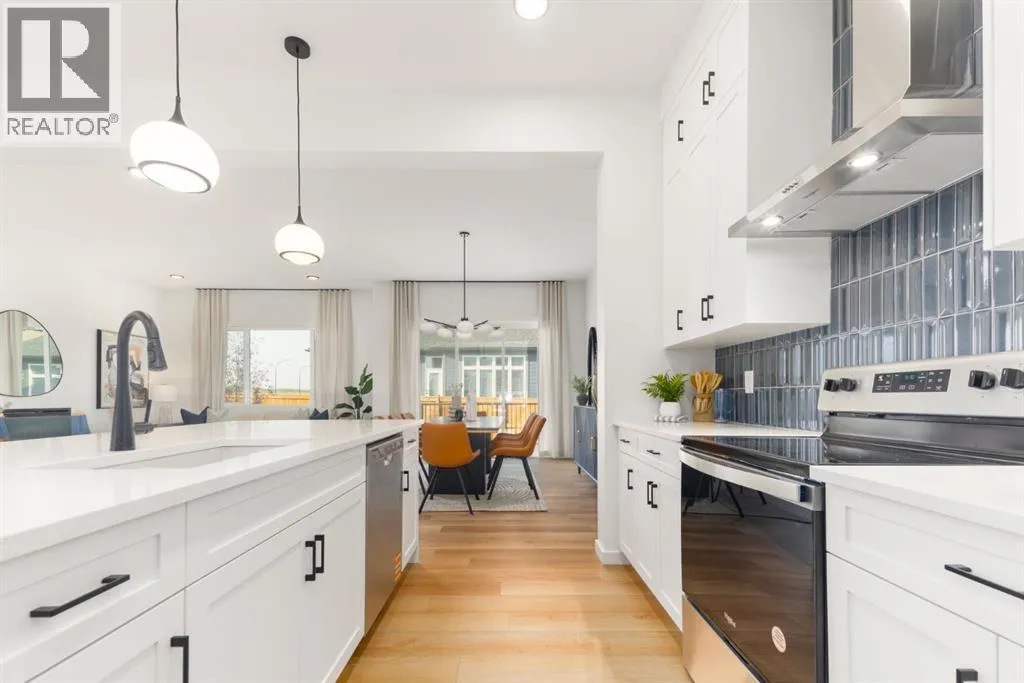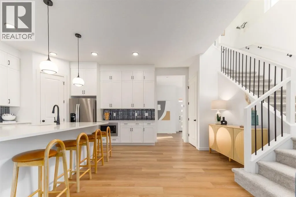This former Show Home exudes grandeur in every detail, with meticulously chosen materials curated to create an atmosphere that captivates from the moment you enter. Inspired by modern Scandinavian design, it embraces cozy hygge vibes while offering the space and functionality families desire today. The main floor welcomes you with soaring 10-foot ceilings and an airy, open layout that feels both warm and impressive. At its heart is a beautifully upgraded kitchen, finished to the ceiling with crisp white cabinetry, quartz countertops, a brand-new stainless steel appliance package, and a spacious walk-in pantry. The open-concept design flows seamlessly into the living room, where a modern fireplace creates both a stylish focal point and a sense of comfort. A large dining area overlooks the private backyard, with glimpses of the rolling hills beyond. Completing this level is a flexible room that can adapt to your needs â whether as a home office, guest bedroom, mudroom, or playroom. Upstairs, 9-foot ceilings and expansive windows flood the home with natural light. Double doors lead to the serene primary bedroom, a true retreat featuring a spa-inspired ensuite with dual vanities, a soaker tub, and a generous walk-in closet. In the opposite wing, two additional bedrooms â each with their own walk-in closet â share a well-appointed family bath. A convenient laundry room is thoughtfully designed to keep life organized. At the center of it all sits a dramatic bonus room with a vaulted ceiling and striking blue feature wall, perfectly suited for movie nights, games, or quiet relaxation while also offering a natural separation between the primary suite and secondary bedrooms. The lower level continues the sense of openness with 9-foot ceilings and a beautifully executed side entrance, providing the a space for in-laws. A dedicated wellness room and a spacious recreation area enhance the lifestyle appeal, while an additional bedroom and full bathroom make this level ideal for guests, older children, or extended family. Outside, mountain-inspired architecture with timber accents blends seamlessly into the surroundings. With full landscaping and a finished deck already complete, this turnkey home is ready to be enjoyed from the moment you arrive. Nestled in Southwest Calgary, the community of Sirocco offers everything from scenic golf course views to vibrant local amenities and over 5 km of connected pathways. Honoring its heritage while embracing modern convenience, Sirocco is a place where rolling foothills and nearby trails bring the peace of country living within easy reach of the city. Don't miss on experiencing this spectacular well thought out home. (id:27476)