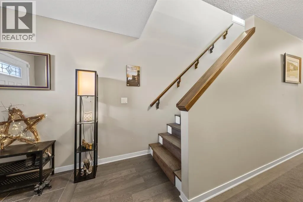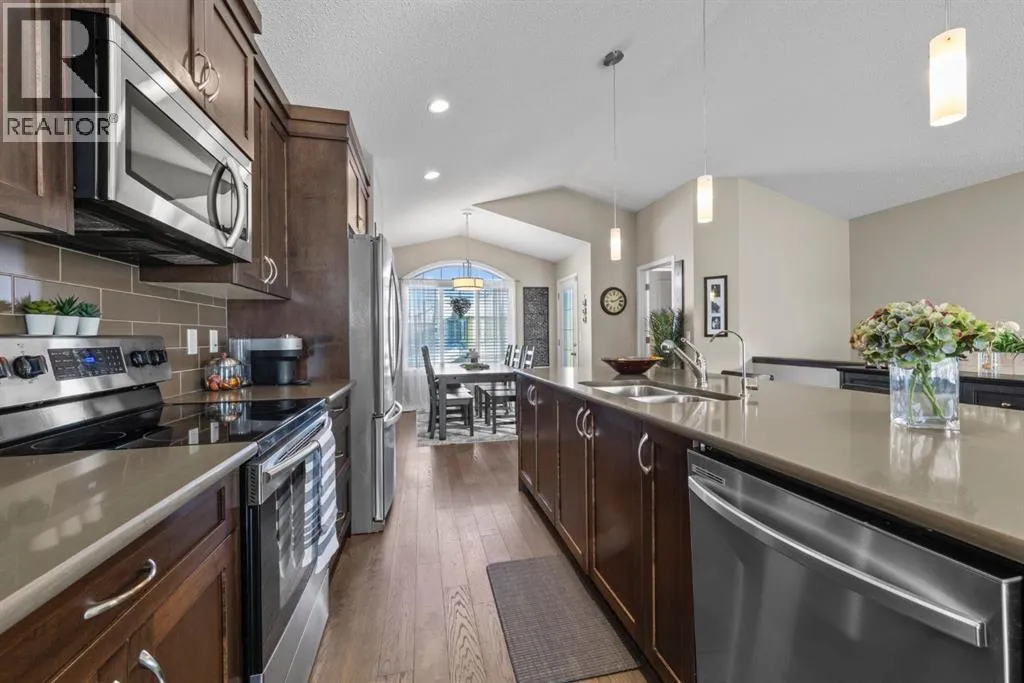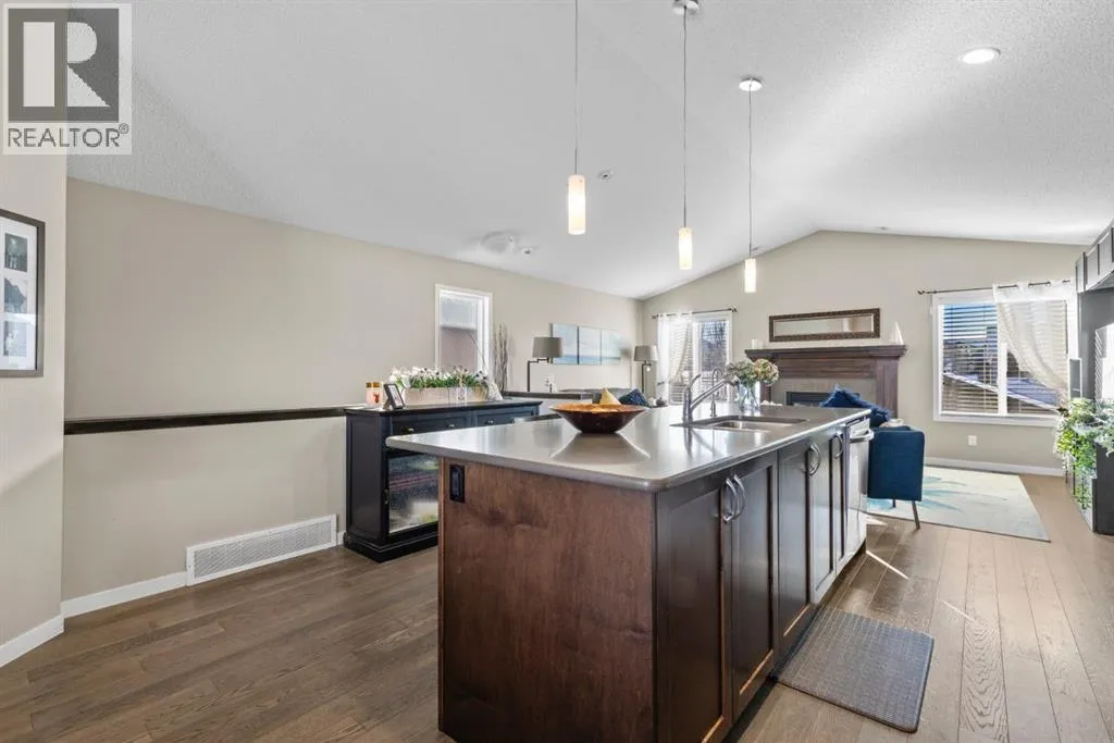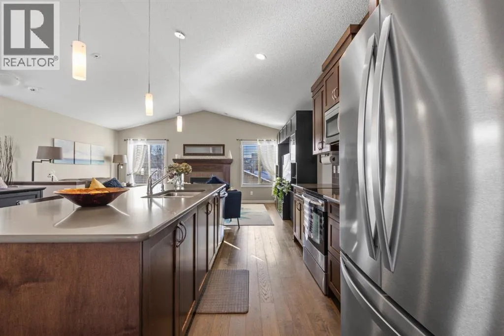 Welcome to this absolutely stunning custom-built âreverse 2-storeyâ home, thoughtfully designed with both style and functionality in mind. From the moment you step inside, youâll appreciate the spacious front entry featuring durable tile flooring and a warm, inviting atmosphere.The main level offers a unique and practical layout, with bedrooms conveniently located on this floorâan ideal setup for those who run a home-based business, allowing you to keep your work and living spaces comfortably separated. The primary suite is a true retreat, complete with a walk-in closet and a beautifully finished ensuite featuring quartz countertops and tile flooring. Down the hall, youâll find a second generously sized bedroom, also boasting its own walk-in closet and private ensuite, ideal for guests, family members, or even a dedicated office or client space. This level also includes a convenient laundry and mudroom with access to the backyard and detached garage.Upstairs, the home truly shines. The bright and open living space features soaring vaulted ceilings, rich hardwood flooring, and a striking fireplace that anchors the room. The kitchen is designed to impress, showcasing a large quartz island, stainless steel appliances, tile backsplash, pantry, and ample cabinet and counter space. The adjoining dining area is perfect for entertaining, while the upper balcony provides a great spot to relax and enjoy the natural light that pourThe main level offers a unique and practical layout, with bedrooms conveniently located on this floor. The primary suite is a true retreat, complete with a walk-in closet and a beautifully finished ensuite featuring quartz countertops and tile flooring. Down the hall, youâll find a second generously sized bedroom, also boasting its own walk-in closet and private ensuite, ideal for guests or family members. This level also includes a convenient laundry and mudroom with access to the backyard and detached garage.Upstairs, the home truly shines. The bright and open living space features soaring vaulted ceilings, rich hardwood flooring, and a striking fireplace that anchors the room. The kitchen is designed to impress, showcasing a large quartz island, stainless steel appliances, tile backsplash, pantry, and ample cabinet and counter space. The adjoining dining area is perfect for entertaining, while the upper balcony provides a great spot to relax and enjoy the natural light that pours in from both sides of the home. A convenient half bathroom completes this level.The fully finished basement adds even more versatility, offering a third bedroom, a spacious recreation area, and an additional full bathroom, perfect for guests, a home office, or extra living space.Outside, youâll find a well-sized detached garage, a great deck for outdoor enjoyment, air conditioning, and beautifully landscaped grounds with mature trees that provide both charm and privacy. Ideally located, this home combines comfort, style, and convenience and is truly a must-see. (id:27476)