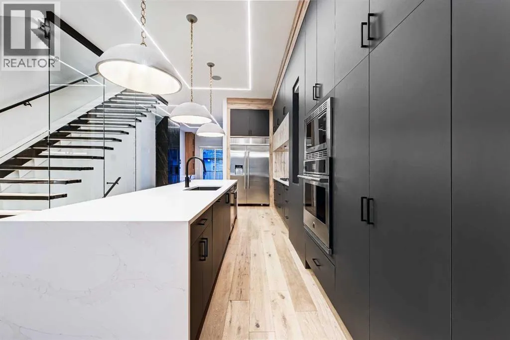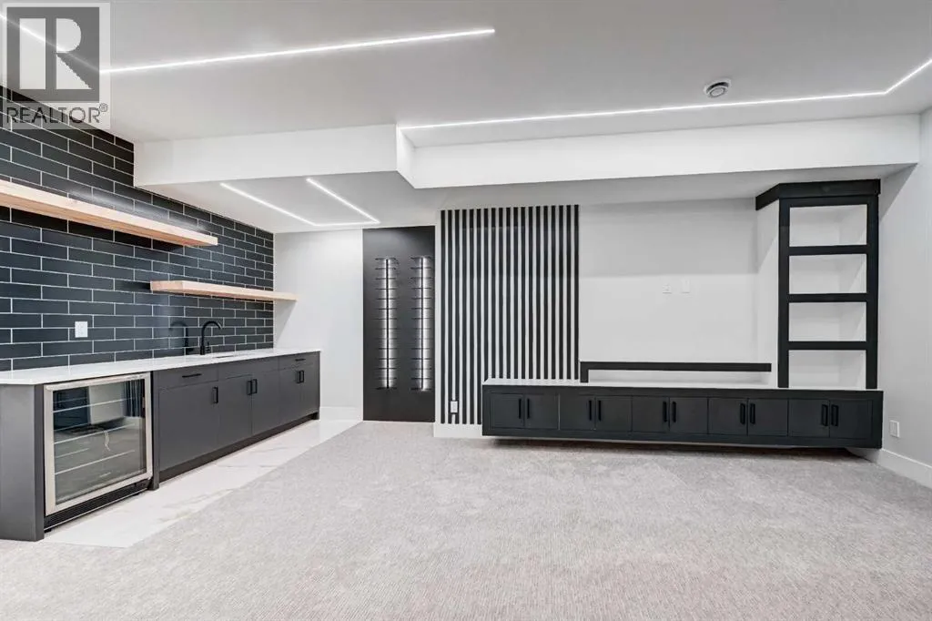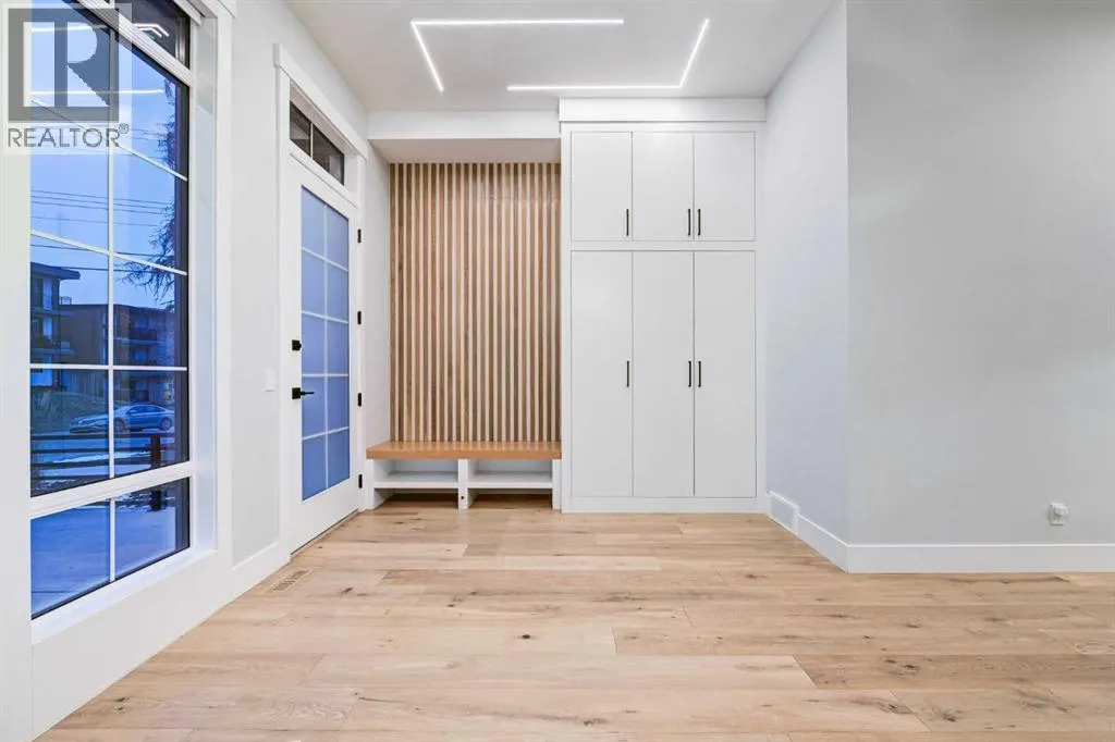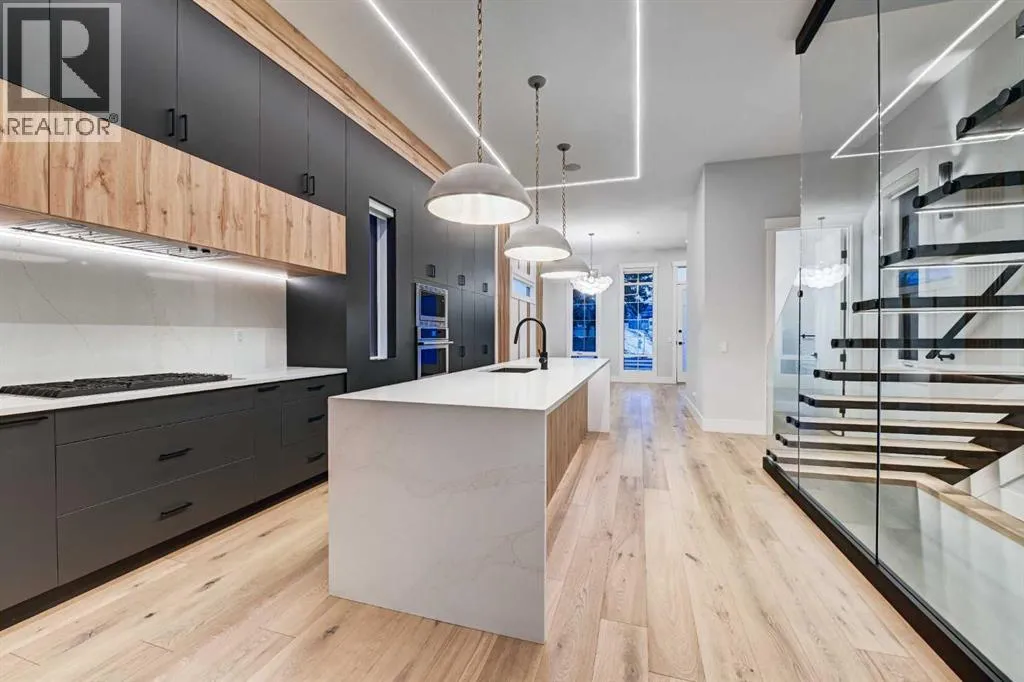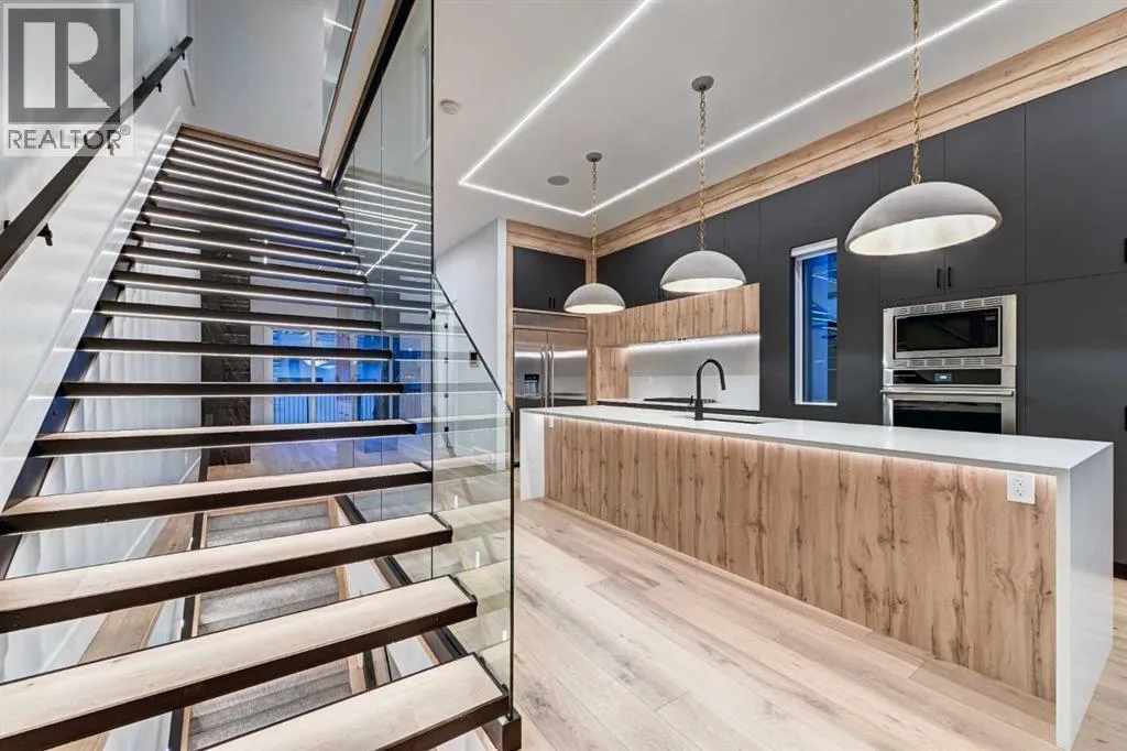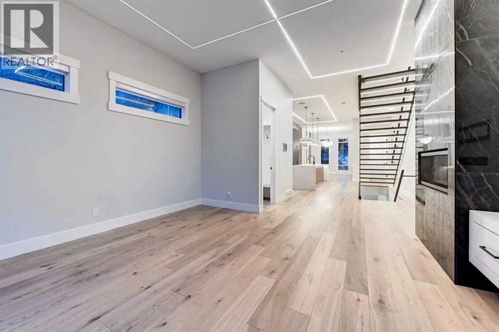 Set in one of Upper Mount Royalâs most prestigious pockets, this newly built residence delivers a refined blend of architectural elegance and modern design across more than 3,000 sq ft of meticulously crafted living space. With 3+1 bedrooms and a thoughtfully curated layout, this home captures the essence of upscale inner-city living while embracing the timeless character of the neighbourhood. A striking brick façade creates a lasting first impression, while the west-facing outdoor space invites warm afternoon light and effortless entertaining. Inside, the main level is defined by soaring 11-foot ceilings, wide-plank hardwood flooring, and an abundance of natural light that enhances every detail. A fully integrated smart home system elevates daily living with automated power blinds and customizable lighting, while upgraded designer light fixtures add an extra layer of sophistication throughout. The open-concept design seamlessly connects each space, complemented by a well-appointed mudroom and elegant powder room. At the heart of the home, the kitchen is designed to impressâfeaturing a massive waterfall quartz island, sleek custom cabinetry, and a high-end gas range that will appeal to both everyday living and elevated entertaining. The adjoining living room offers a stunning focal point with its tiled fireplace and custom-built media centre, while large sliding glass doors create a seamless transition to the backyard. A statement floating staircase leads to the upper level, where 10-foot ceilings continue the sense of openness. Here, youâll find three generously sized bedrooms, a beautifully finished 4-piece bathroom, and a fully equipped laundry room with sink and ample storage. The primary suite is a true retreat, offering a spacious walk-in closet and a spa-inspired 5-piece ensuite complete with a freestanding soaker tub, oversized glass shower, and dual vanity. The fully developed lower level expands the homeâs versatility with 9-foot ceilings and the option fo r in-floor heating. Designed for both relaxation and recreation, it features a large family room with a wet barâperfect for movie nights or hosting guestsâalong with a dedicated exercise space, a fourth bedroom, and an additional 4-piece bathroom.Additional highlights include air conditioning, a rear deck with a BBQ gas line, and a heated double detached garageâideal for Calgaryâs winter monthsâensuring comfort and convenience year-round. Located just moments from the vibrant energy of 17th Avenue SW, as well as top-rated schools, parks, and transit, this home offers an exceptional lifestyle with quick access to the downtown core via 14th Street SW. A rare opportunity to own a brand-new luxury home in one of Calgaryâs most iconic communitiesâwhere timeless location meets contemporary living. (id:27476)