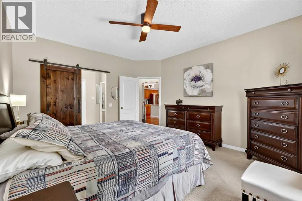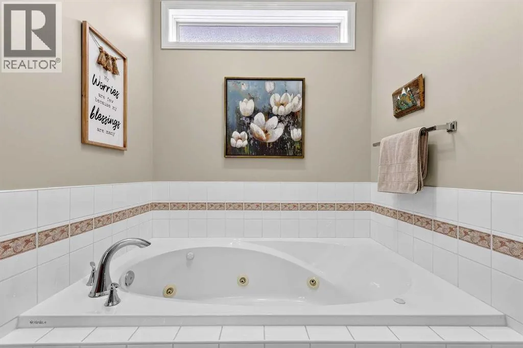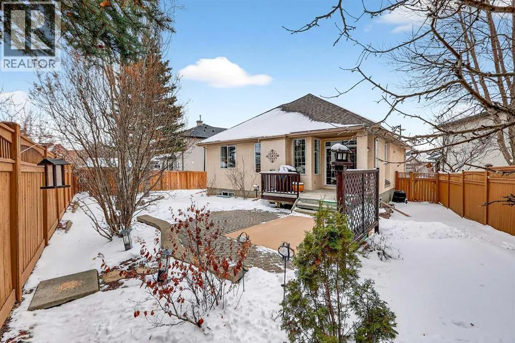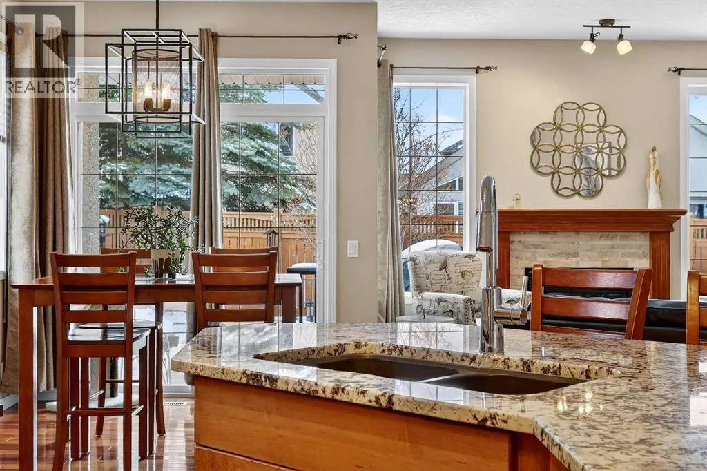 Enter a home that seamlessly blends spacious, sunny interiors with relaxing outdoor living. Custom decor, privacy, spa-inspired features, and beautiful perimeter gardens provide a standout choice for anyone seeking a functional, yet luxurious sanctuary in the heart of Cranston. This immaculate 4-bedroom, 2.5-bathroom bungalow, with nearly 2900 sqft of developed living area is perfectly situated on a spacious 6675 sqft pie lot just steps from Cranston Ridge, mountain views and the Bow River pathways. Designed throughout for comfort and functionality, you'll first step up to a generous formal dining area or versatile front room. The main living space features rich Brazilian cherry hardwood flooring and an open-concept layout that flows into a finely appointed kitchen. This chef-inspired space is anchored by updated granite countertops and a massive island, complemented by premium Bosch appliances and a spacious corner pantry. The adjacent eating area and living room includes a cozy gas fireplace, walking directly out to an elevated deck - two steps down to a meticulously manicured and landscaped back yard. The primary bedroom suite offers ample space for a king-sized bed, with a large walk-in closet, and a spacious recently-renovated 5-piece ensuite complete with a dual vanity and jetted tub A second bedroom on the main floor provides the perfect layout for a dedicated home office or den. Practicality is found in the tiled main landing, which includes a 2-piece powder room and a large laundry room, entering from the attached double garage featuring a new garage door.The fully developed lower level adds another 1266 sqft of developed living space, starting with a massive recreation room, highlighted by new marble floor to ceiling fireplace and a convenient wet bar for entertaining or peaceful relaxation. This level includes a sunny large third bedroom that shares a convenient 4-piece Jack and Jill bathroom, with a functional 4th bedroom space. The bathroom featur es a custom Finnish cedar wet sauna, providing a full spa experience.Outdoor living is the true highlight, featuring a large private yard anchored by a spacious deck that steps down to a custom stone patio, all surrounded by beautiful perimeter gardens, including apple and other fruit trees and flowering bushes. The expansive pie lot also allows room for a future RV pad alongside the house and includes a spacious shed. Located close to the City pathway system, schools, and Cranstonâs community amenities, your next home offers a priceless combination of light, space and quality finish in one of Cranston's most desirable locations. (id:27476)