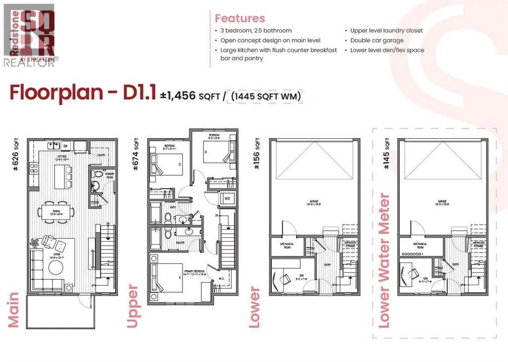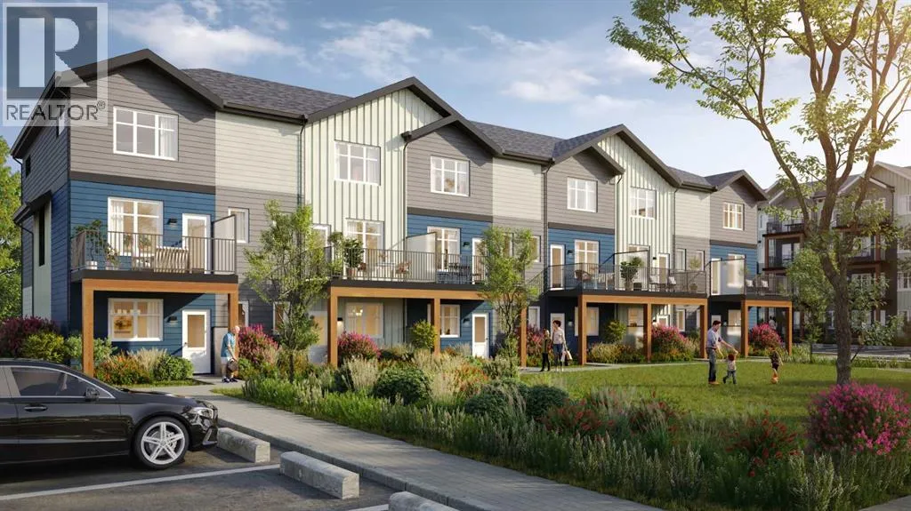 StreetSide proudly presents this exceptionally popular interior-unit townhome, where expansive living areas meet modern comforts and sophisticated finishes. The thoughtfully designed floorplan features three spacious upper-level bedrooms and two and a half well appointed bathrooms, complemented by a versatile lower-level den perfect for a home office or quiet retreat. The heart of the home is an inviting open-concept main floor, anchored by a large gourmet kitchen featuring a functional breakfast bar for casual dining. This bright living space transitions seamlessly to a private balcony, offering a perfect setting for outdoor relaxation. The interior showcases high end craftsmanship, including modern dark slab-style cabinetry with a full bank of drawers for maximum storage. The kitchen is further elevated by polished white quartz countertops and a full suite of premium stainless steel appliances. Durable luxury vinyl flooring runs throughout the primary living areas, while the stairs and upper level are finished with plush carpet over an 8lb underlay for superior comfort. Additional conveniences include an attached double car garage, professionally maintained landscaping, and a lifestyle defined by maintenance free living. Located within Redstone Square this home places you at the heart of the dynamic Redstone neighborhood. Enjoy the ease of a convenient location with quick access to major routes, including Stoney Trail, ensuring you are never far from the city's best. The community is strategically positioned near future commercial developments, promising shops, services, dining, and entertainment options just moments from your doorstep. Please note photo is a rendering of the building. (id:27476)