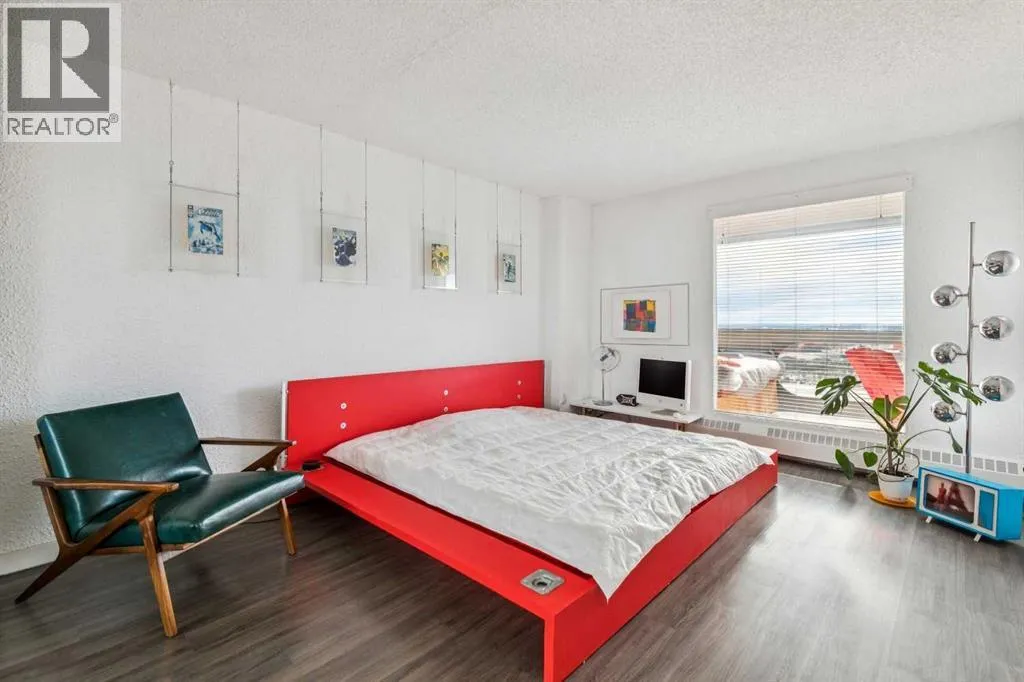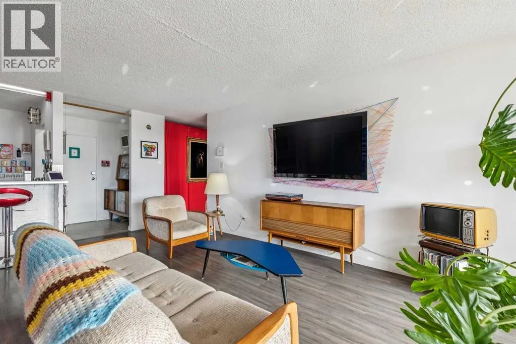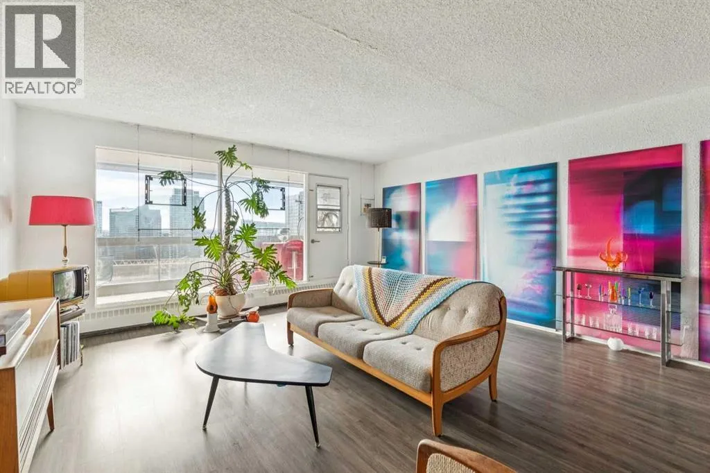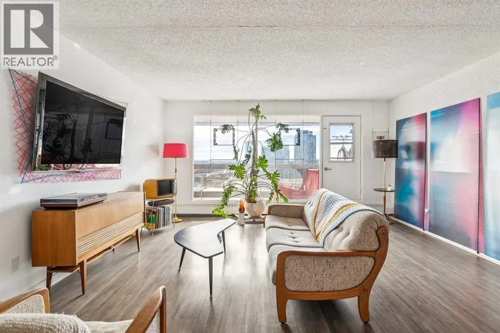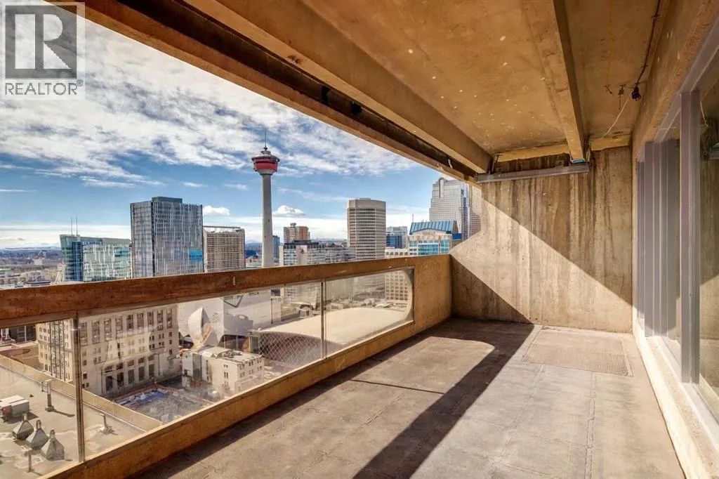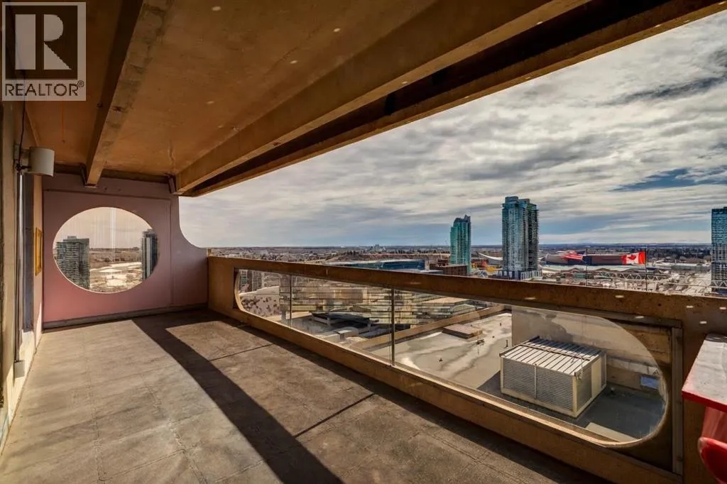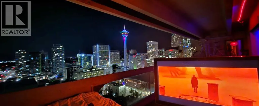 Perched on the "almost" top floor corner, this rare offering delivers unobstructed, panoramic views with a coveted south exposure and an expansive private deckâperfect for taking in Calgaryâs ever-changing skyline. This large one-bedroom unit features polished concrete floors, an updated bathroom, and a minimalist mid-century kitchen that complements the buildingâs striking design. Selected as an inspirational creative space, the home was chosen for its architectural character and truly exceptional vantage points. Wake up to sweeping views of the Rockies visible right from bed, and enjoy the dynamic glow of the Calgary Tower lighting up the night sky without ever lifting your head from the pillow. The southwest exposure showcases peak skyline vistas, while the living room continues the experience with uninterrupted mountain views. One of only three units in the building offering a remarkable 270-degree perspective, the outlook begins with a uniquely framed circular view toward East Village, delivering unforgettable sunrise moments. A secure, heated parking stall is included. Set within a solid concrete buildingâwhere high-floor units like this rarely come to marketâthis home also includes a den or office (currently used as storage), along with free coin laundry conveniently located on the same floor. The building is exceptionally secure and ideally situated next to the U.S. Consulate. An incredible opportunity to own a distinctive, design-forward space with some of the best views in the cityâall at an outstanding price point. (id:27476)