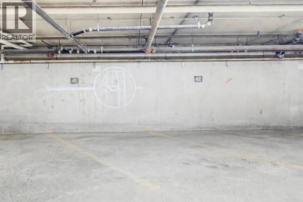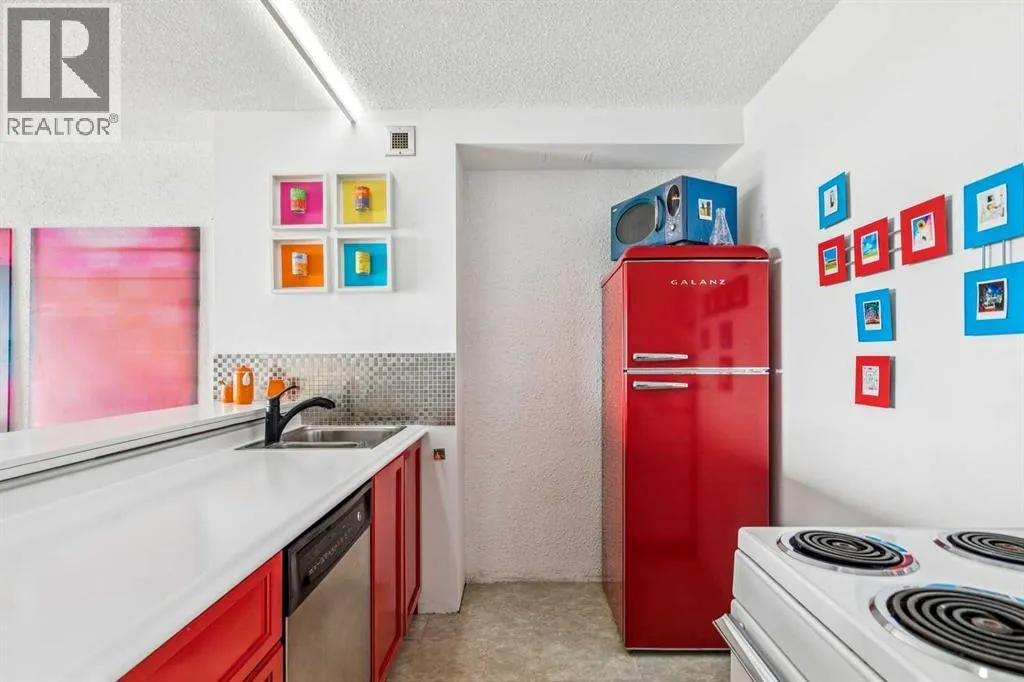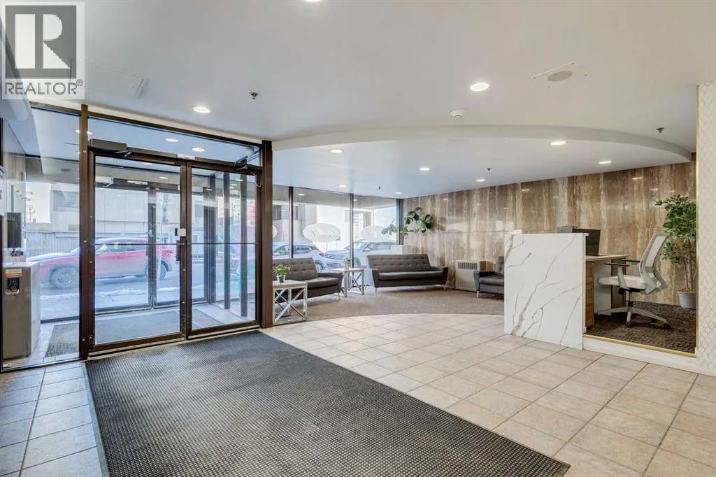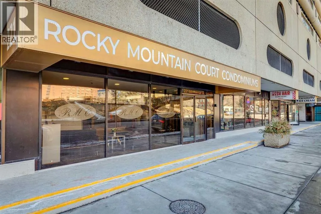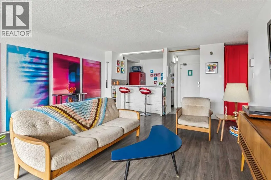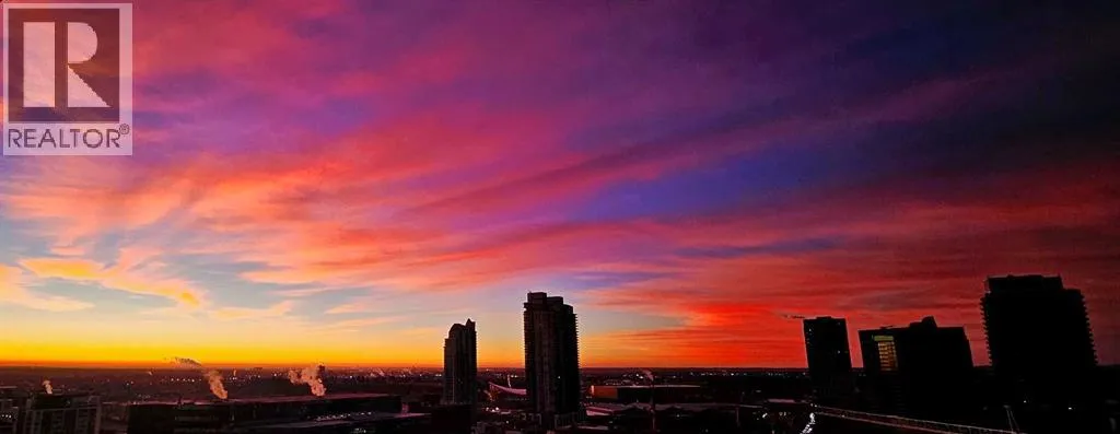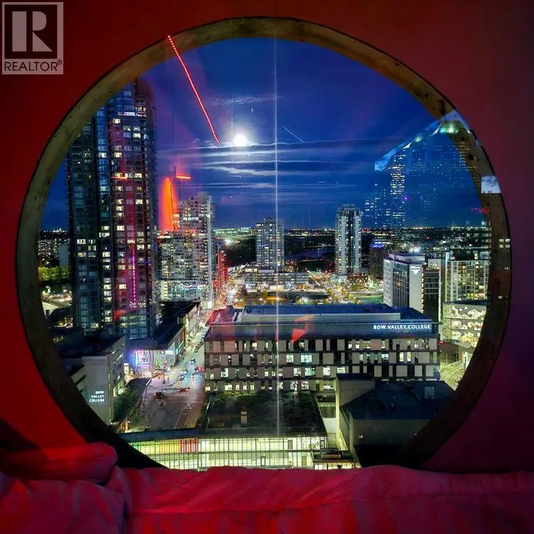 Perched on the "almost" top floor corner, this rare offering delivers unobstructed, panoramic views with a coveted south exposure and an expansive private deckâperfect for taking in Calgaryâs ever-changing skyline. This large one-bedroom unit features polished concrete floors, an updated bathroom, and a minimalist mid-century kitchen that complements the buildingâs striking design. Selected as an inspirational creative space, the home was chosen for its architectural character and truly exceptional vantage points. Wake up to sweeping views of the Rockies visible right from bed, and enjoy the dynamic glow of the Calgary Tower lighting up the night sky without ever lifting your head from the pillow. The southwest exposure showcases peak skyline vistas, while the living room continues the experience with uninterrupted mountain views. One of only three units in the building offering a remarkable 270-degree perspective, the outlook begins with a uniquely framed circular view toward East Village, delivering unforgettable sunrise moments. A secure, heated parking stall is included. Set within a solid concrete buildingâwhere high-floor units like this rarely come to marketâthis home also includes a den or office (currently used as storage), along with free coin laundry conveniently located on the same floor. The building is exceptionally secure and ideally situated next to the U.S. Consulate. An incredible opportunity to own a distinctive, design-forward space with some of the best views in the cityâall at an outstanding price point. (id:27476)