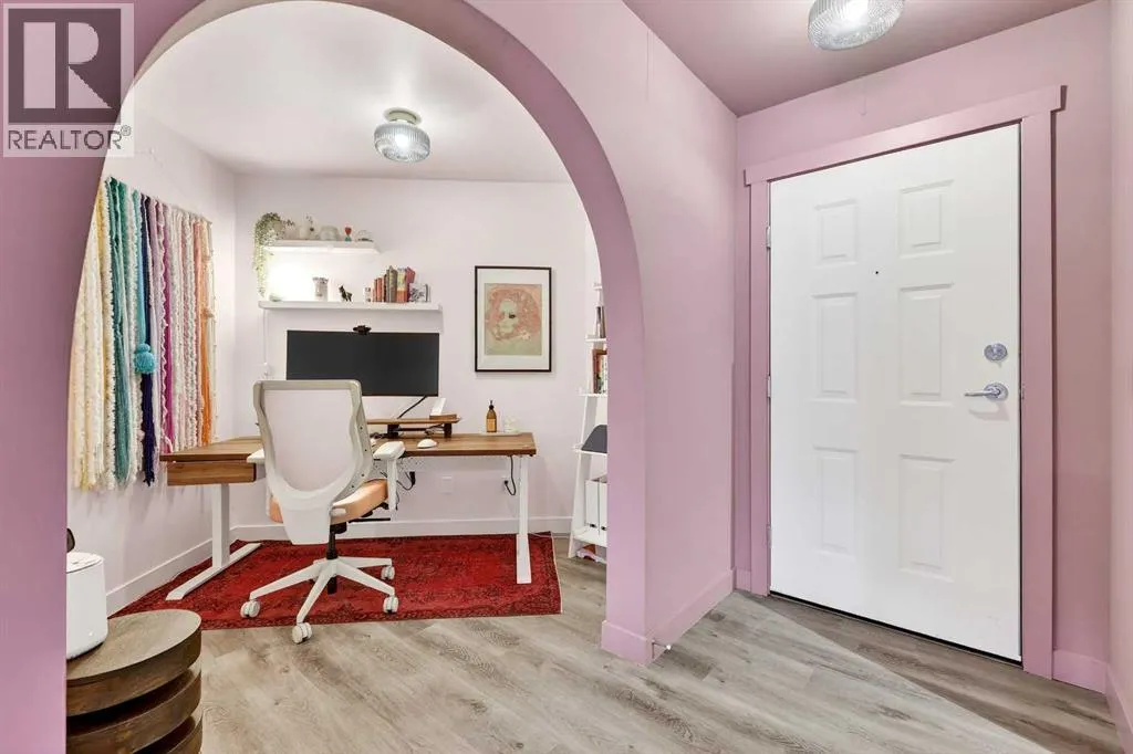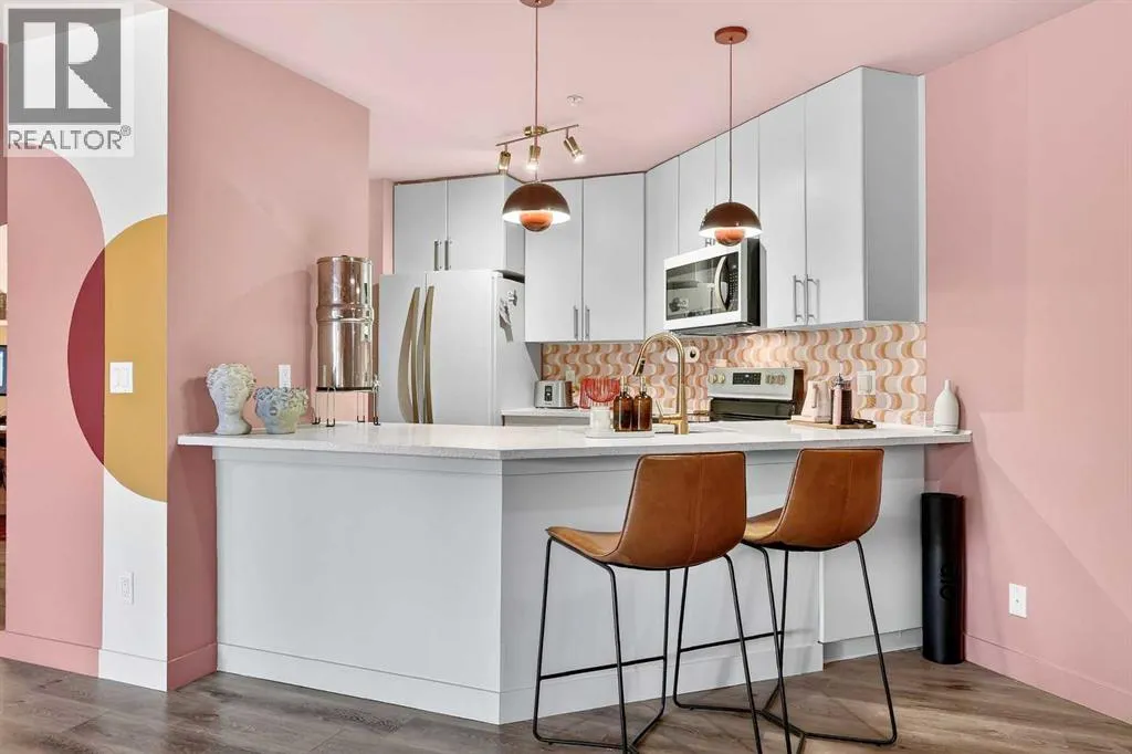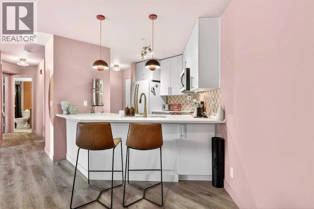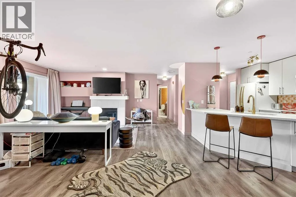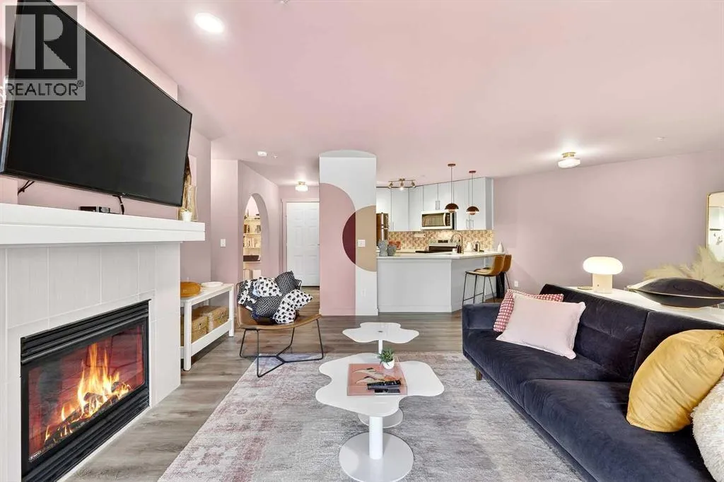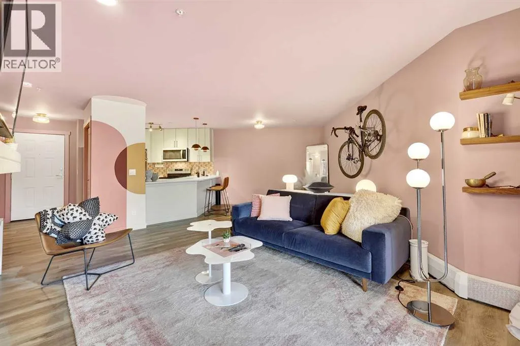 Style meets function in this fully upgraded, one-of-a-kind condo in the heart of Lincoln Park!This bright and beautifully updated 1-bedroom + den unit in Laurel House at the Park is bursting with personalityâperfect for someone who loves a home with character. From the custom paint and statement wallpaper to the eye-catching light fixtures, this space delivers serious retro-inspired charm with a modern twist.Step inside to an open-concept layout featuring newer laminate flooring and a stunning, fully renovated kitchen complete with crisp white quartz countertops, updated appliances, and elegant satin brass hardware. Whether youâre hosting friends or enjoying a quiet night in, this space is as functional as it is stylish.The spacious living and dining areas are flooded with natural light, thanks to large patio doors that lead to your private balcony overlooking a peaceful courtyardâyour own little escape in the city.Down the hall, a versatile den framed by a custom archway creates the perfect home office, reading nook, or creative studio. The beautifully updated 4-piece bathroom showcases a new vanity, tile work, tub surround, and bold designer wallpaper. The primary bedroom continues the vibe with a custom walk-in closet, retro sliding door, and more curated design touches.Additional features include in-suite laundry, titled underground parking, and storage for ultimate convenience.This well-managed building offers fantastic amenities including a fitness centre, party room, and secure underground parking. Tucked away on a quiet cul-de-sac, youâre just steps from MRU, local favourites, shopping, transit, and major roadways.If youâre looking for a home that stands out from the crowd and reflects your unique styleâthis is it. (id:27476)