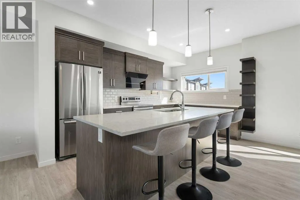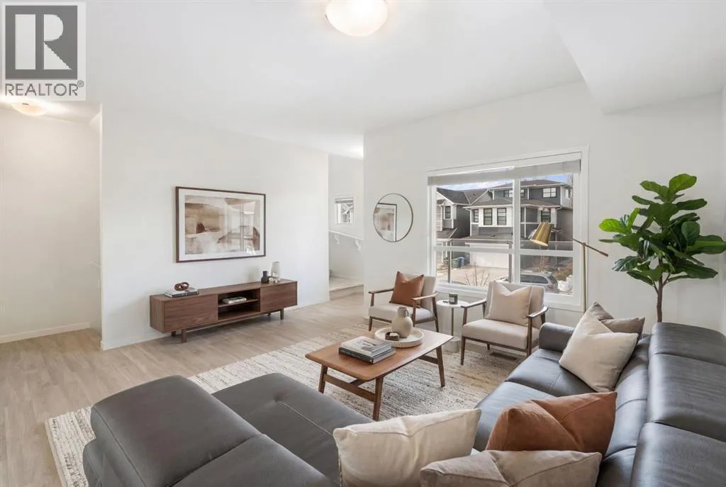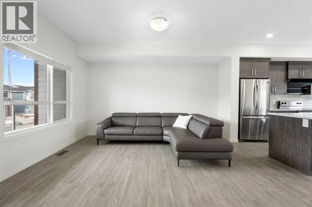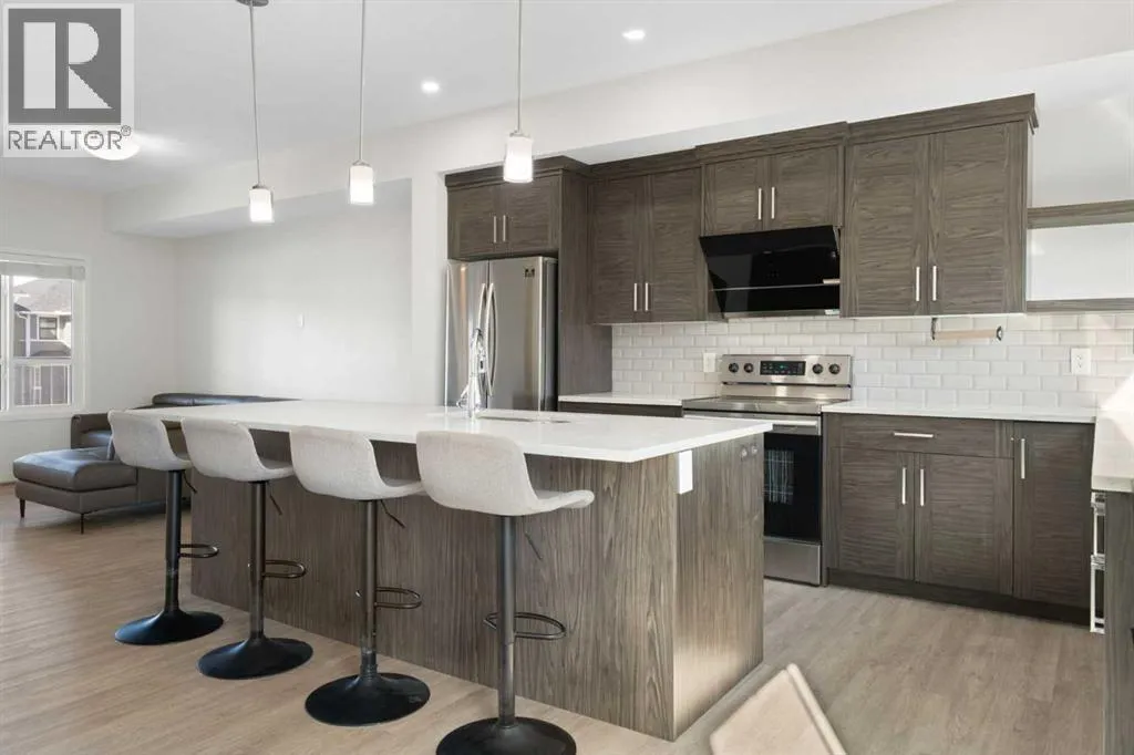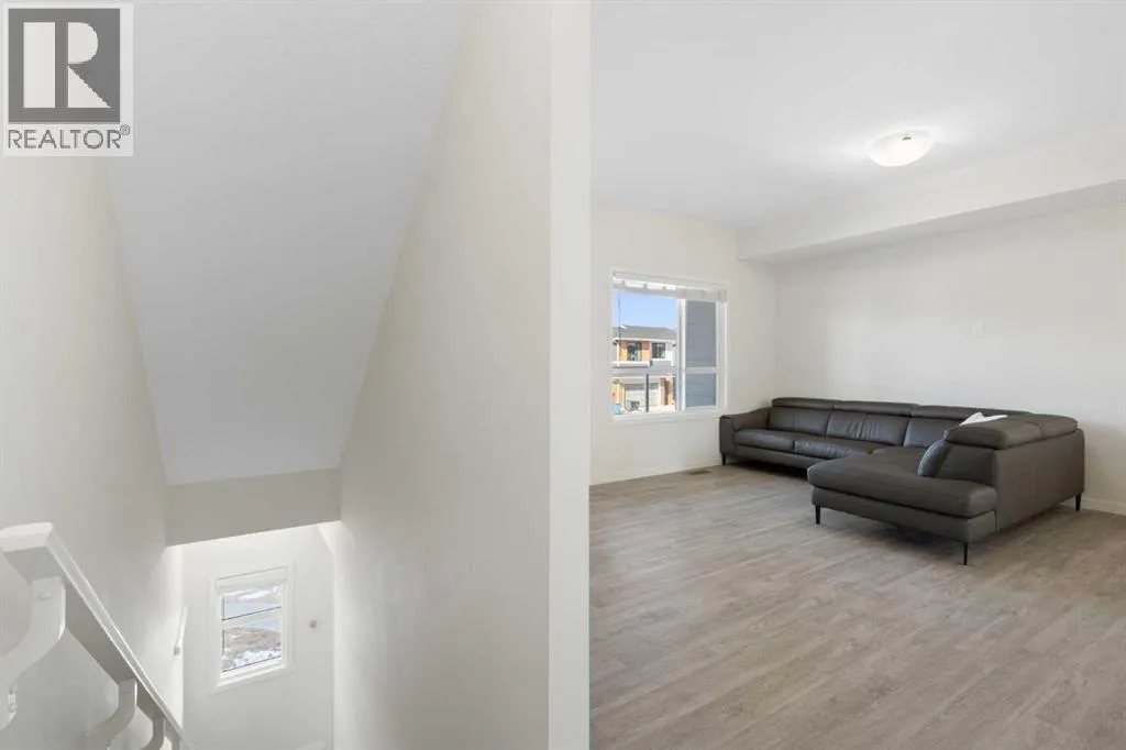 Secure this premium, move-in-ready 3-bedroom townhome in the heart of Harvest Hills! Built by Cedarglen Living, this well maintained 1,700 sq. ft. home offers the perfect blend of award-winning design and modern upgrades.Step into a spacious foyer featuring a double attached side-by-side garage and a versatile flex roomâcomplete with a stylish barn doorâmaking it the ideal private gym or home office. The main level boasts 9-foot ceilings and durable LVP flooring throughout a seamless open-concept layout. The chefâs kitchen is built for hosting, fully equipped with full-height cabinetry, quartz countertops, a central island, and stainless steel appliances.While many townhomes struggle with summer heat, you will enjoy year-round comfort with full central air conditioning. The upper level offers a primary suite with a walk-in closet and a double-vanity ensuite, alongside two additional bedrooms and a dedicated laundry area with side-by-side machines for maximum utility. Located minutes from Deerfoot Trail, YYC Airport, schools, and parks, this no-carpet, premium-spec home wonât last. Recent Upgrades include (LVP - NO carpet home 2023, Upgraded hood fan) Contact your favorite Realtor to book a showing today! (id:27476)