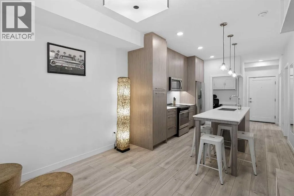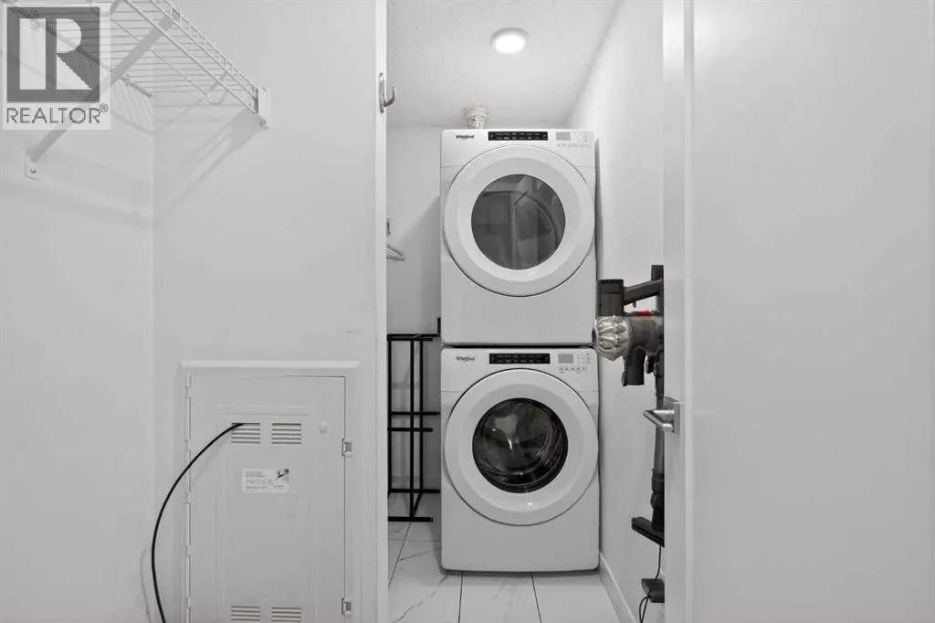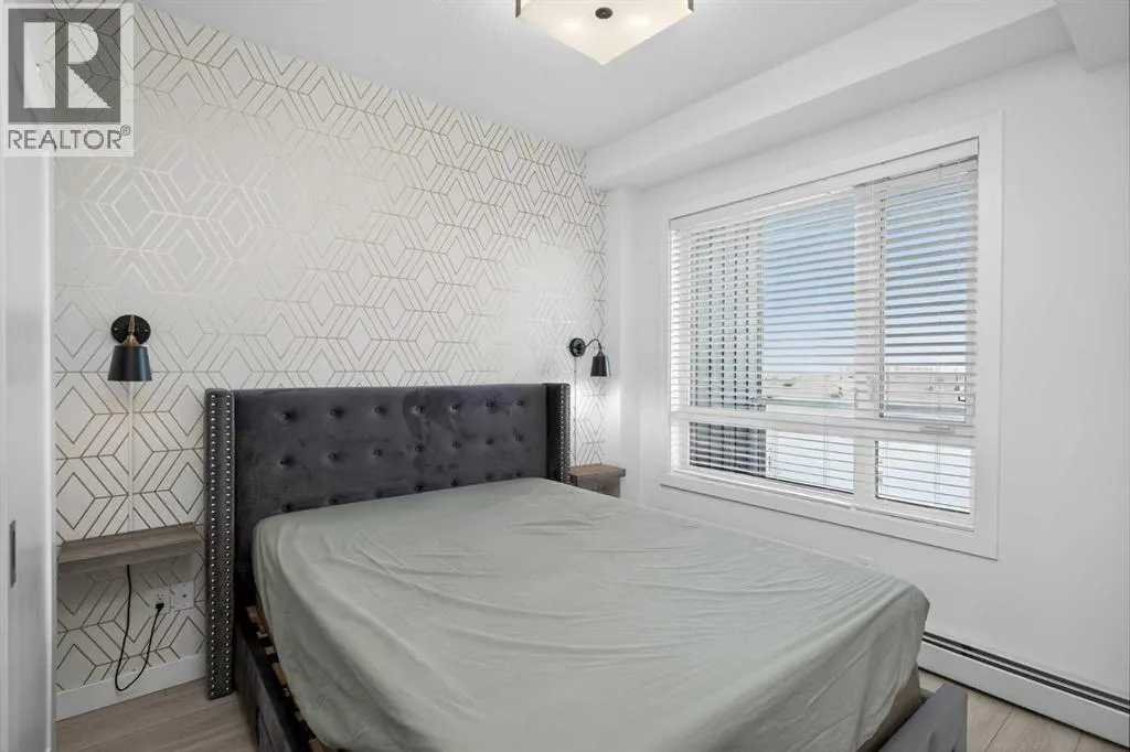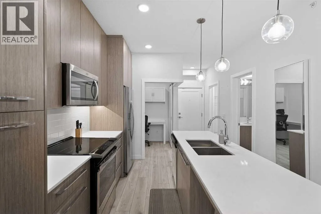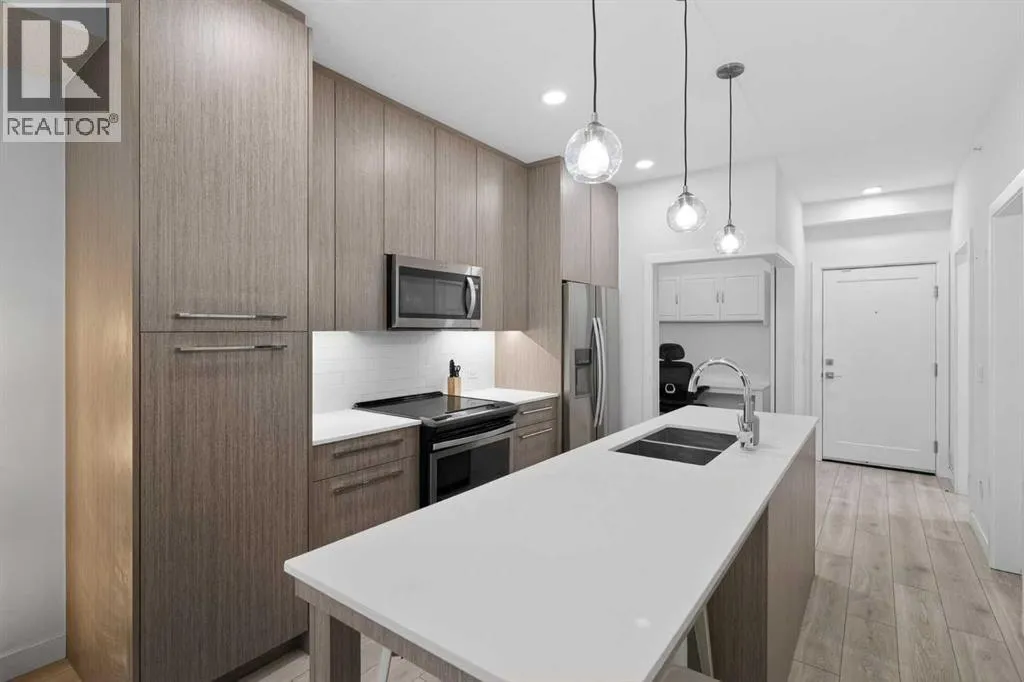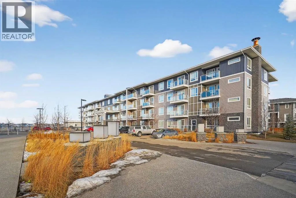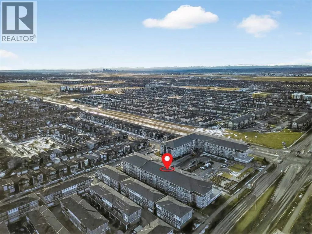 Experience the pinnacle of apartment living in the vibrant, highly sought-after community of Cornerstone. As a premier top-floor residence, this home offers a level of quiet, privacy, and natural light that is simply unmatched. Boasting the tallest ceiling height in the entire building, the space feels exceptionally airy, open, and executive-grade.The "Top Floor" AdvantageBeing positioned on the top level means no neighbors above you and an abundance of natural light pouring through oversized windows. The open-concept layout is designed for modern flow, seamlessly connecting the gourmet kitchen, dining area, and living room.Chefâs Kitchen: A modern centerpiece featuring sleek quartz countertops, premium stainless steel appliances, and ample workspace for culinary creativity.Strategic Flex Space: Beyond the main living area, this unit features a dedicated office space. Whether you need a quiet work-from-home setup, a guest retreat, or organized additional storage, this flex room provides ultimate versatility.Organized Living: Practicality is built-in with a full laundry room and custom shelving throughout, ensuring every inch of the home is maximized for efficiency.Your Private RetreatThe primary bedroom serves as a peaceful sanctuary, supported by a modern, full-feature bathroom. Step outside onto your private balcony to take in the neighborhood views and enjoy the fresh air from your high-vantage point. This pet-friendly property also includes the added security of one underground parking stall and a dedicated storage locker.World-Class Amenities: The "Private Club" ExperienceLife at Cornerstone offers a lifestyle typically reserved for luxury hotels. Residents enjoy exclusive access to:Fitness & Wellness: A fully equipped gym, plus dedicated yoga and spin studios.Entertainment: A high-end private theatre and an elegant owners' lounge.Community & Nature: A quiet library, a dedicated kids' playroom, a community garden, and inviting outdoor pi cnic areas.Unbeatable ConnectivityIdeally located for the modern professional, this home offers rapid access to major routes, ensuring your commute to the airport, downtown, or the rest of the city is effortless.Top Floor. Extra-Tall Ceilings. Dedicated Office. Underground Parking. This is more than a condo; it is a high-performance lifestyle opportunity in North Calgary. Experience the top-floor differenceâbook your private showing today. (id:27476)