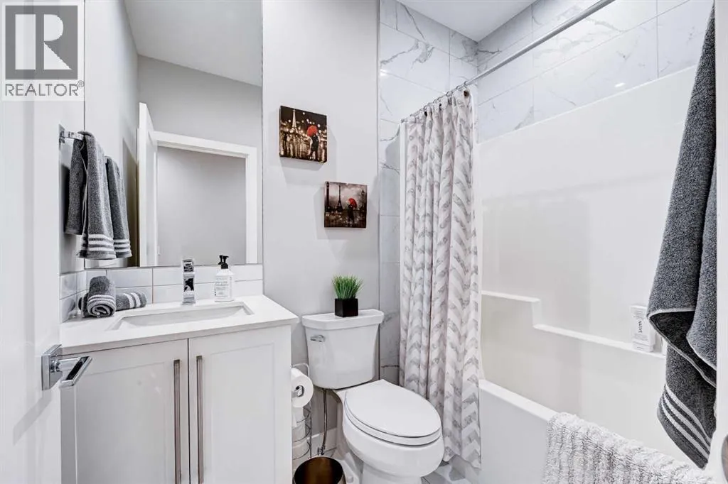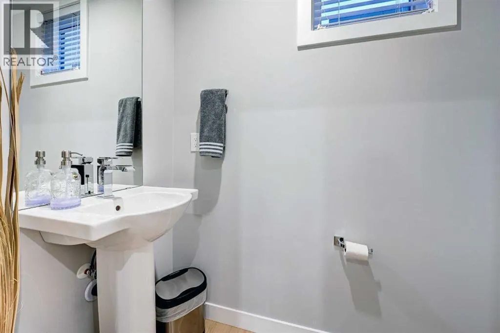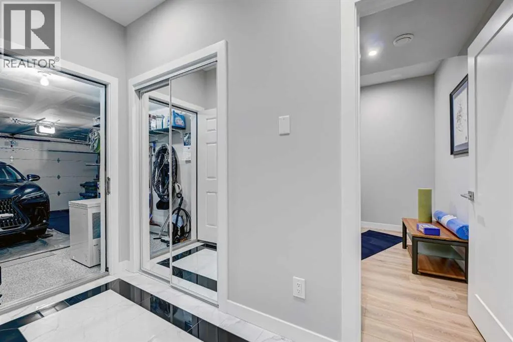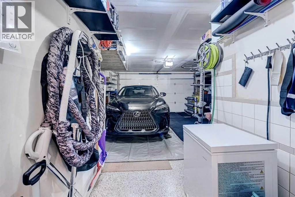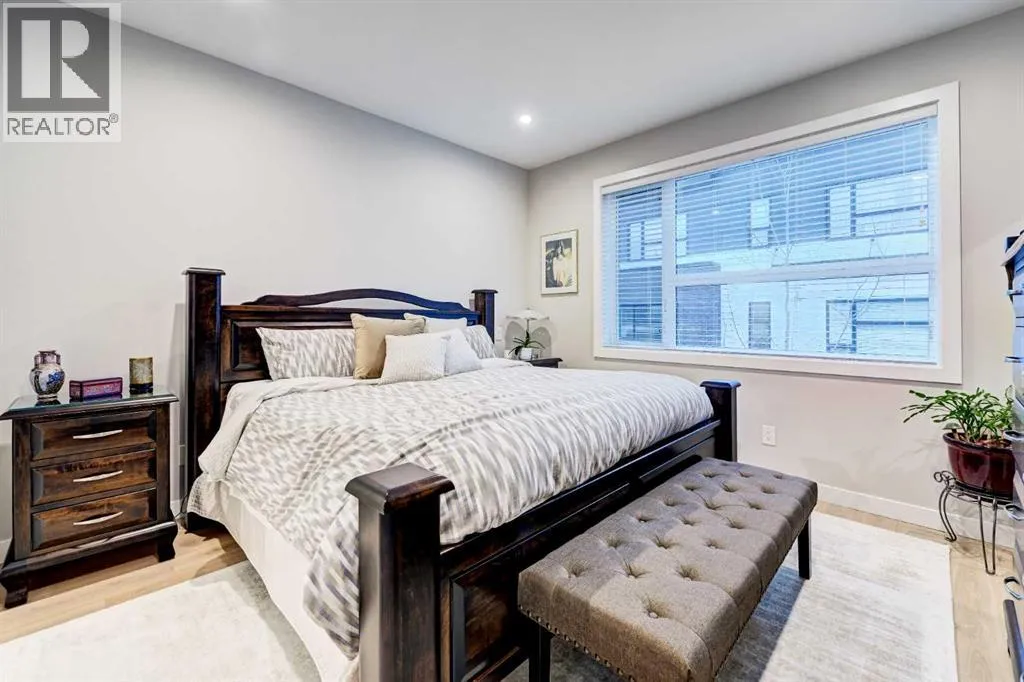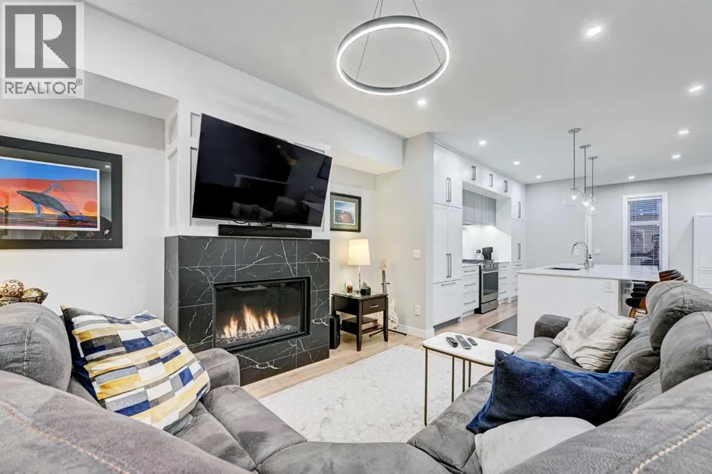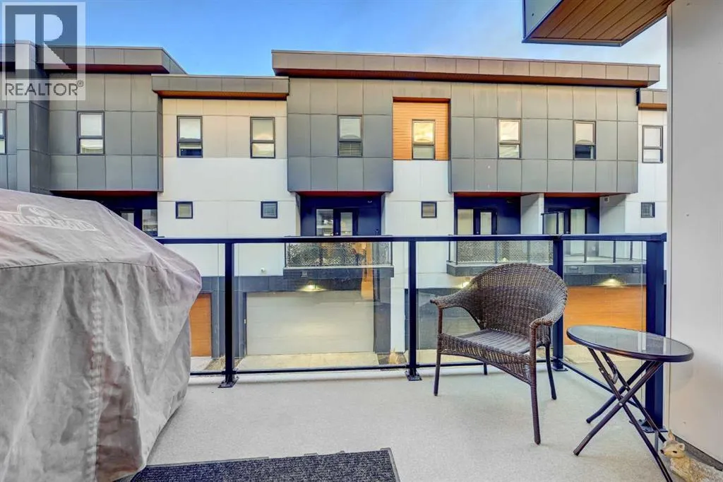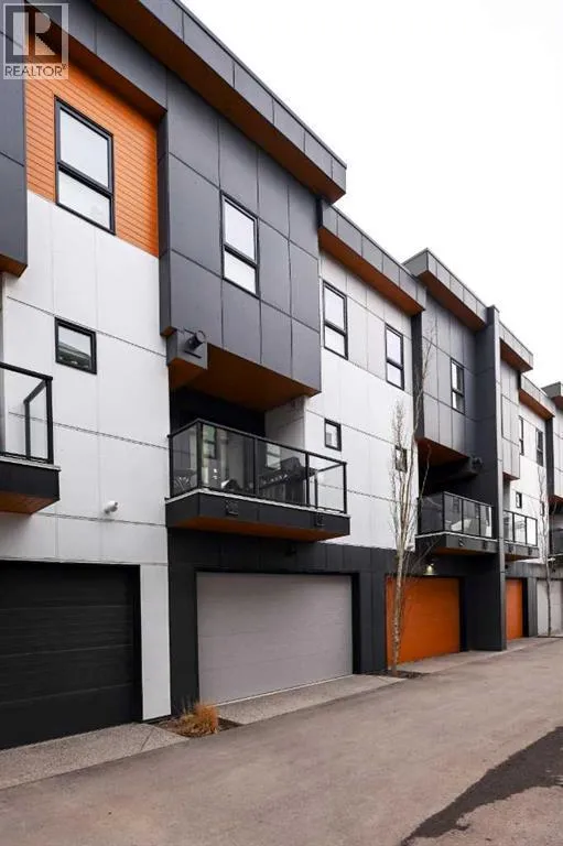 This modern, chic townhome offers 1,768 sq ft of beautifully developed space and is in impeccable condition with a thoughtfully designed floor plan and 9-ft ceilings on both the main and upper levels. The main floor is bright and wide open, highlighted by an expansive kitchen with a gas range, built-in fridge, and quartz countertops, flowing seamlessly into comfortable dining and living areas. Step outside to a spacious deck complete with a gas BBQ outletâperfect for entertaining. Upstairs, youâll find three generously sized bedrooms, including a primary retreat with a large walk-in shower and double sinks, plus the convenience of upper-floor laundry. The lower level adds valuable flexibility with an additional room ideal for a gym or home office. The double attached garage is insulated, heated, and finished with an epoxy floor, with all shelving included. This is also one of the rare units in the complex equipped with air conditioning. Located in West Districtâa vibrant and highly walkable community with a growing list of amenities, this home offers exceptional convenience. Enjoy nearby parks, including a dog park, walking paths, and quick access to Stoney Trail and Bow Trail for an easy commute anywhere in the city. Truly an exceptional home that is expected to sell quickly. (id:27476)