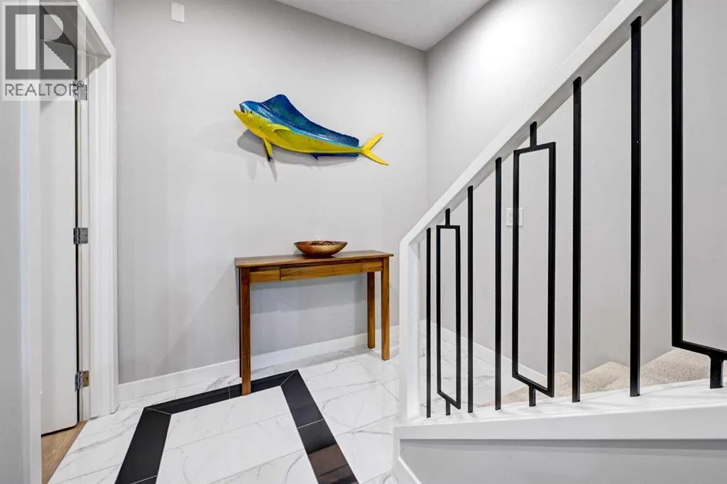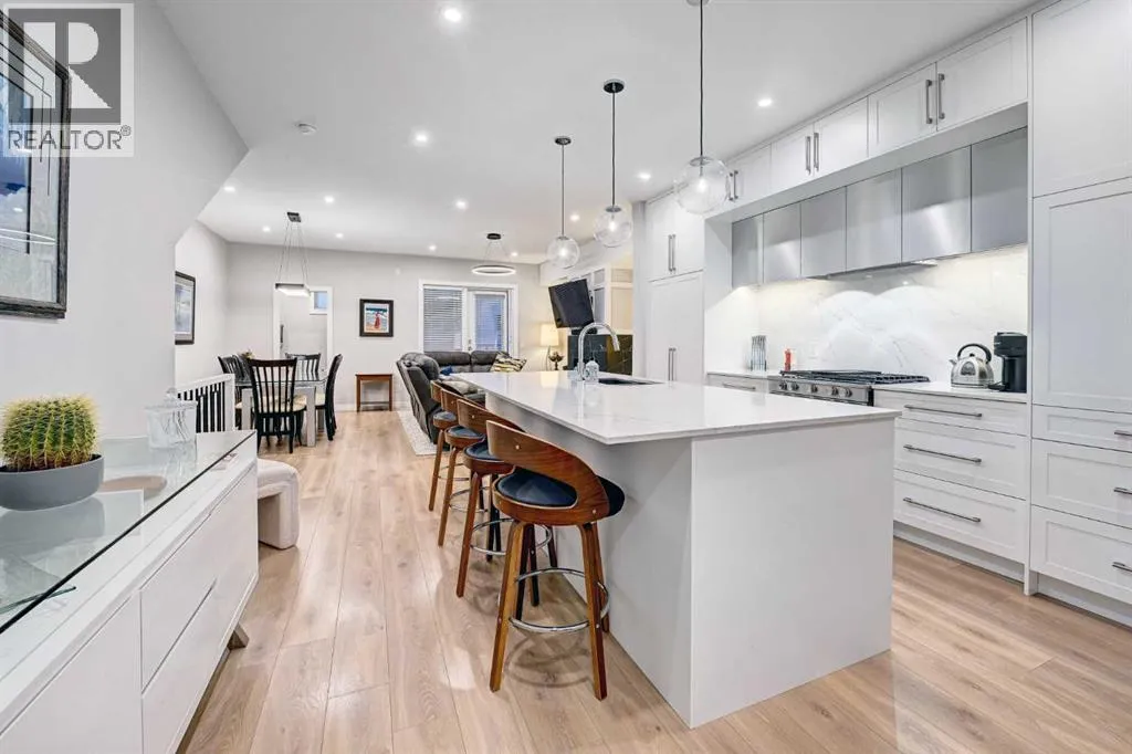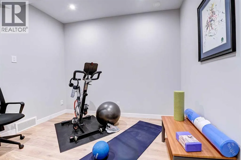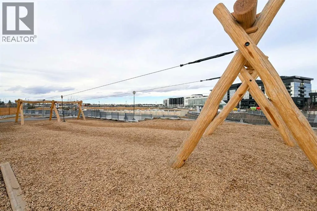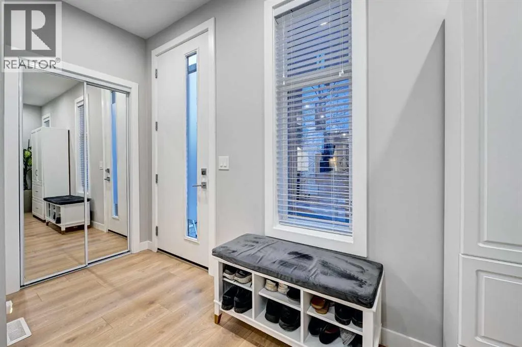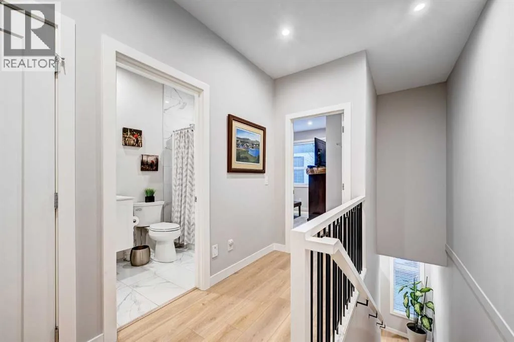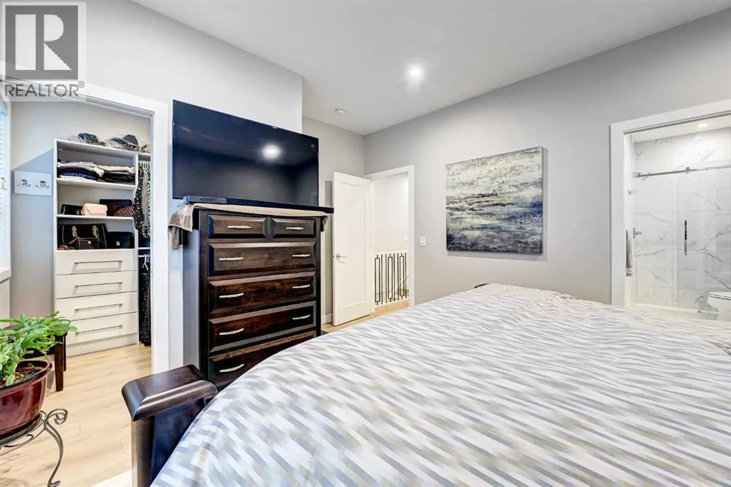 This modern, chic townhome offers 1,768 sq ft of beautifully developed space and is in impeccable condition with a thoughtfully designed floor plan and 9-ft ceilings on both the main and upper levels. The main floor is bright and wide open, highlighted by an expansive kitchen with a gas range, built-in fridge, and quartz countertops, flowing seamlessly into comfortable dining and living areas. Step outside to a spacious deck complete with a gas BBQ outletâperfect for entertaining. Upstairs, youâll find three generously sized bedrooms, including a primary retreat with a large walk-in shower and double sinks, plus the convenience of upper-floor laundry. The lower level adds valuable flexibility with an additional room ideal for a gym or home office. The double attached garage is insulated, heated, and finished with an epoxy floor, with all shelving included. This is also one of the rare units in the complex equipped with air conditioning. Located in West Districtâa vibrant and highly walkable community with a growing list of amenities, this home offers exceptional convenience. Enjoy nearby parks, including a dog park, walking paths, and quick access to Stoney Trail and Bow Trail for an easy commute anywhere in the city. Truly an exceptional home that is expected to sell quickly. (id:27476)