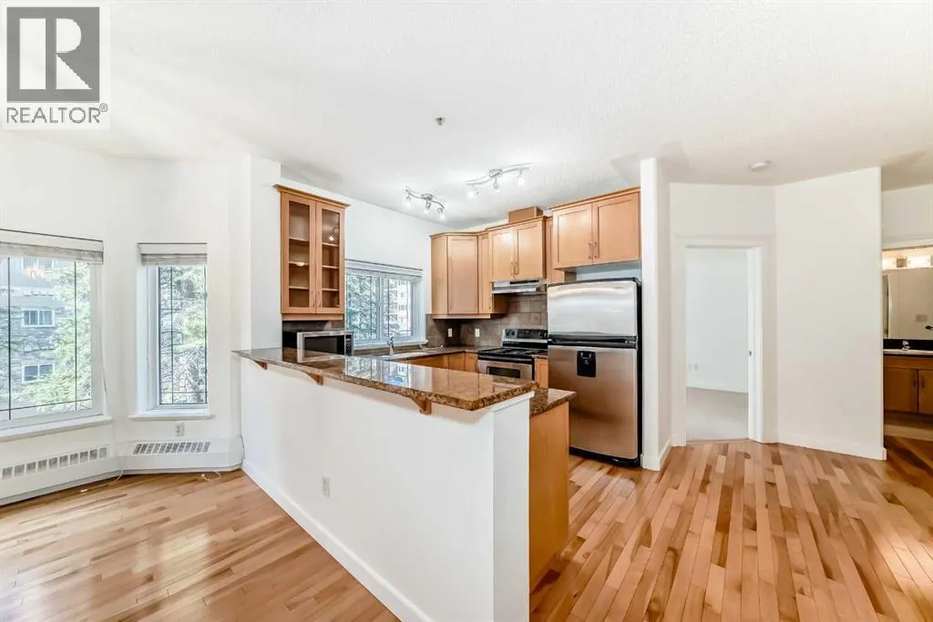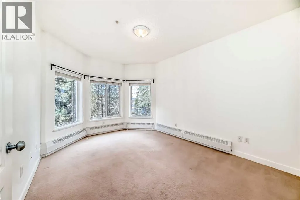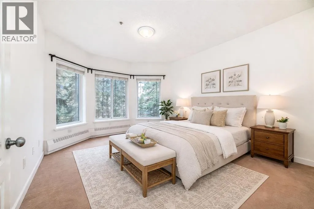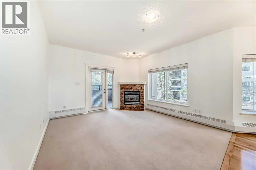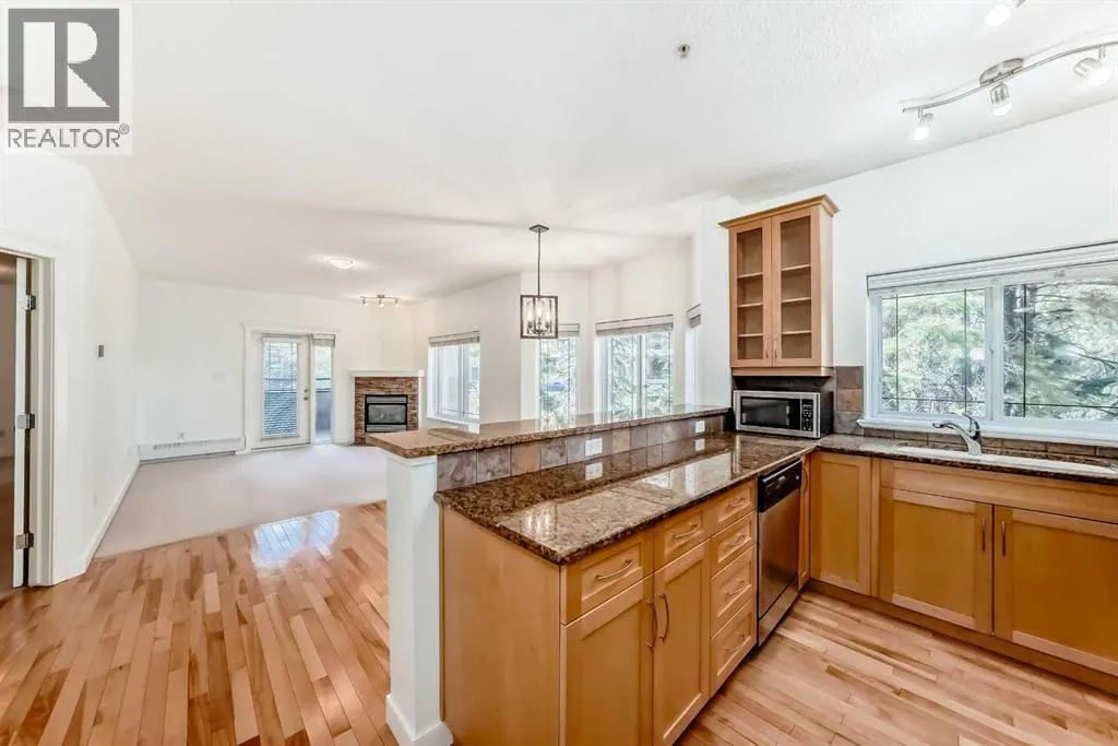 Welcome home to one of the most beautifully located condominiums Calgary has to offer, tucked into a serene setting surrounded by towering trees, endless walking paths, and almost completely encircled by the natural beauty of Griffith Woods. Opportunities like this are rare, where peaceful surroundings and urban convenience come together so effortlessly. Offering over 1300 square feet of living space, this is a standout unit that delivers both size and function in a way that is hard to find in todayâs market. As you enter, you are welcomed by a charming large foyer before heading into an inviting main living area. Just off of the entrance, a thoughtfully positioned den provides the perfect private space for working from home, studying, or simply enjoying a quiet area to read. The kitchen features solid wood cabinetry, granite countertops, and a pantry, offering both durability and style. It opens seamlessly into the expansive living and dining areas, creating an ideal layout for entertaining or relaxing. Large windows fill the space with natural light and showcase the stunning views in every direction. The living room is anchored by a cozy corner gas fireplace and provides direct access to your private patio, where you can unwind while taking in the surrounding greenery. The clever layout places the two bedrooms on opposite sides of the unit, offering exceptional privacy for guests, roommates, or family members. The secondary bedroom is highlighted by beautiful bow windows and enjoys immediate access to a well appointed three piece bathroom. A dedicated laundry room keeps everything neatly tucked away and adds to the overall convenience. The primary suite is truly impressive in both size and comfort. This expansive retreat easily accommodates king sized furniture and even offers space for an additional sitting area or home office. The large walk-in closet is a dream for anyone needing generous storage, while the ensuite features a deep soaker tub, separate shower, a nd an oversized vanity. Additional features include secure indoor parking to keep your vehicle warm and protected year round, as well as extra storage space. Residents also enjoy access to an on-site gym, and the condo fees include both electricity and heat. With two bedrooms, two full bathrooms, a den, 1330 square feet of living space, incredible views, and an unbeatable location, this is a home that truly has it all. (Some photos have been virtually staged.) (id:27476)