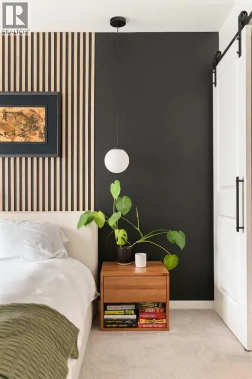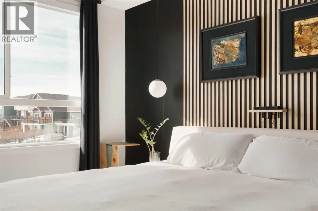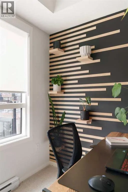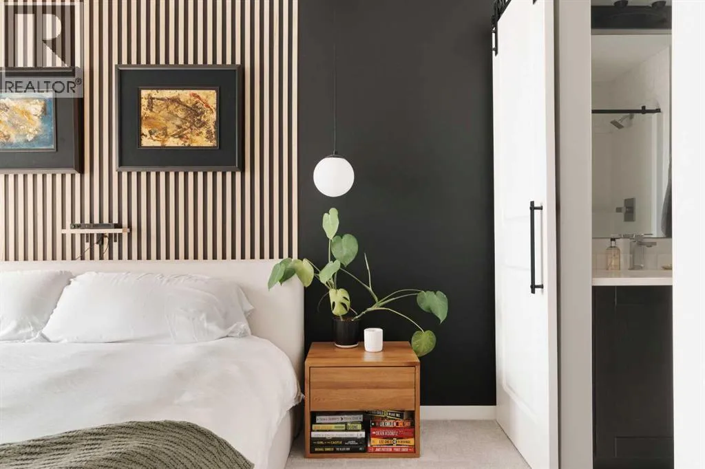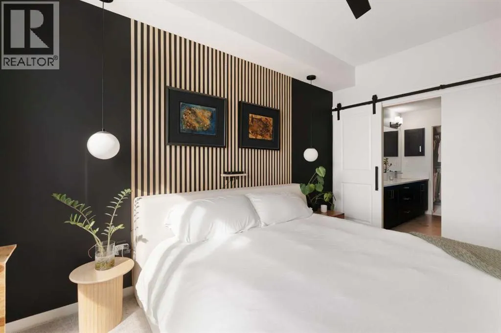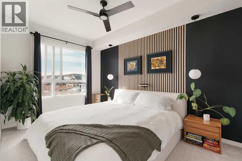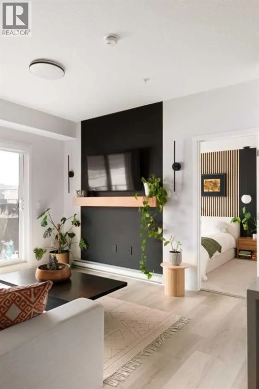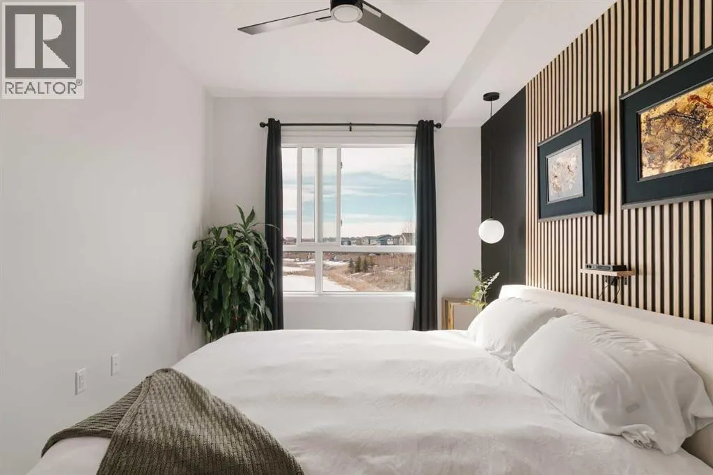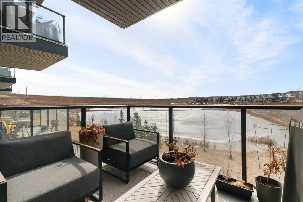 Welcome home to this stylish, meticulously upgraded 2-bedroom, 2-bathroom condo in the vibrant SE community of Cranston's Riverstone. With a thoughtfully designed living space and coveted south exposure, this unit is flooded with natural light year-round â and the serene views over the landscaped pond never get old.The open-concept main living area makes an immediate impression, anchored by a striking dark feature wall with floating shelves and seamlessly connected to a chef-inspired kitchen. The kitchen is a true standout, showcasing full-height dark shaker cabinetry, crisp white quartz countertops, a classic subway tile backsplash, stainless steel appliances, and a generous island with bar seating â perfect for entertaining. Industrial-style pendant lighting adds the finishing touch.Step through the sliding glass door to your private south-facing balcony and take in peaceful pond views â your own quiet retreat above the neighbourhood.The primary bedroom is a calm and elegant escape, featuring plush carpet, a vertical wood slat accent wall, a walk-in closet with custom built-ins, and a luxurious ensuite with double vanity, quartz countertops, undermount sinks, and a large frameless glass shower with subway tile surround. The second bedroom is equally well-appointed, offering flexibility as a guest room or home office, with its own accent wall, excellent natural light and walk in closet with custom organizers. A full second bathroom with dark cabinetry and white fixtures serves this space beautifully.Additional highlights include in-suite laundry with built-in storage shelving, light luxury vinyl plank flooring throughout the main living areas, a titled parking stall, and a well-maintained modern building with a welcoming stone-accented entrance.Located in one of Calgary's fastest-growing SE communities, with quick access to Stoney Trail, Deerfoot, South Health Campus, the Seton YMCA, and a full range of shops and restaurants. Whether you're a first-time buyer, downsizer, or savvy investor â this one truly has it all. (id:27476)