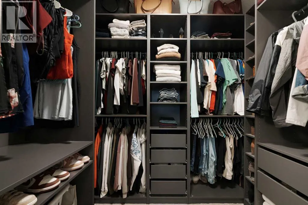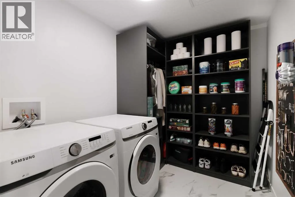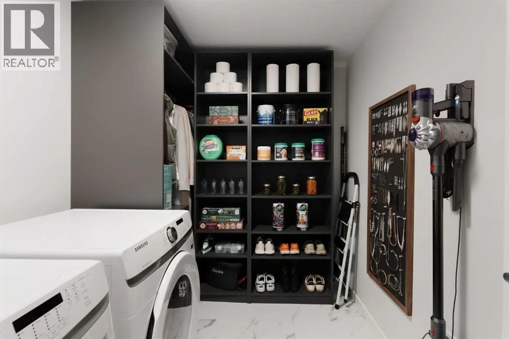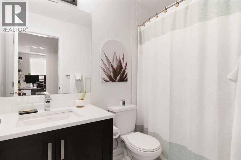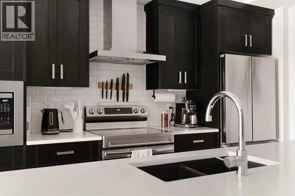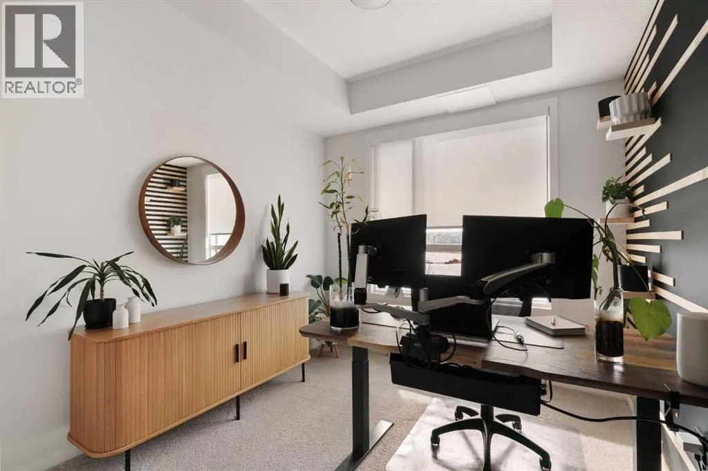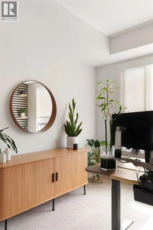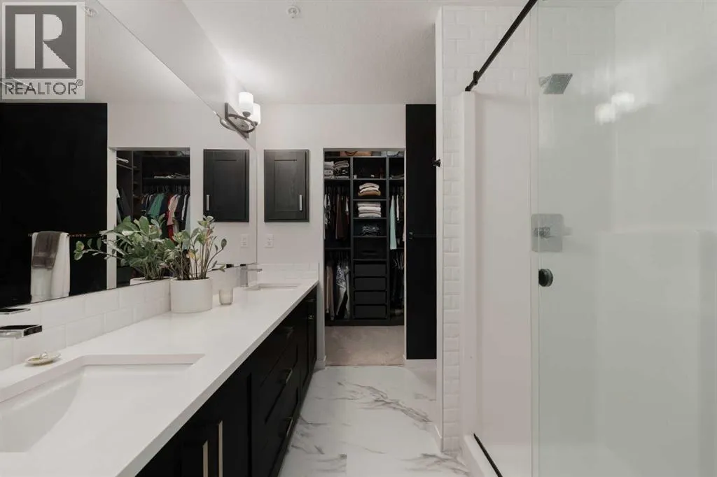 Welcome home to this stylish, meticulously upgraded 2-bedroom, 2-bathroom condo in the vibrant SE community of Cranston's Riverstone. With a thoughtfully designed living space and coveted south exposure, this unit is flooded with natural light year-round â and the serene views over the landscaped pond never get old.The open-concept main living area makes an immediate impression, anchored by a striking dark feature wall with floating shelves and seamlessly connected to a chef-inspired kitchen. The kitchen is a true standout, showcasing full-height dark shaker cabinetry, crisp white quartz countertops, a classic subway tile backsplash, stainless steel appliances, and a generous island with bar seating â perfect for entertaining. Industrial-style pendant lighting adds the finishing touch.Step through the sliding glass door to your private south-facing balcony and take in peaceful pond views â your own quiet retreat above the neighbourhood.The primary bedroom is a calm and elegant escape, featuring plush carpet, a vertical wood slat accent wall, a walk-in closet with custom built-ins, and a luxurious ensuite with double vanity, quartz countertops, undermount sinks, and a large frameless glass shower with subway tile surround. The second bedroom is equally well-appointed, offering flexibility as a guest room or home office, with its own accent wall, excellent natural light and walk in closet with custom organizers. A full second bathroom with dark cabinetry and white fixtures serves this space beautifully.Additional highlights include in-suite laundry with built-in storage shelving, light luxury vinyl plank flooring throughout the main living areas, a titled parking stall, and a well-maintained modern building with a welcoming stone-accented entrance.Located in one of Calgary's fastest-growing SE communities, with quick access to Stoney Trail, Deerfoot, South Health Campus, the Seton YMCA, and a full range of shops and restaurants. Whether you're a first-time buyer, downsizer, or savvy investor â this one truly has it all. (id:27476)