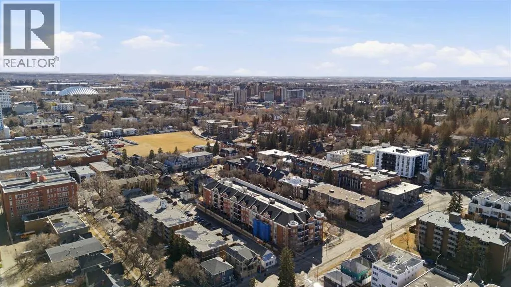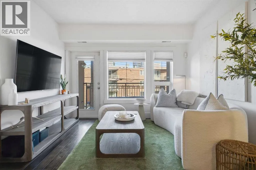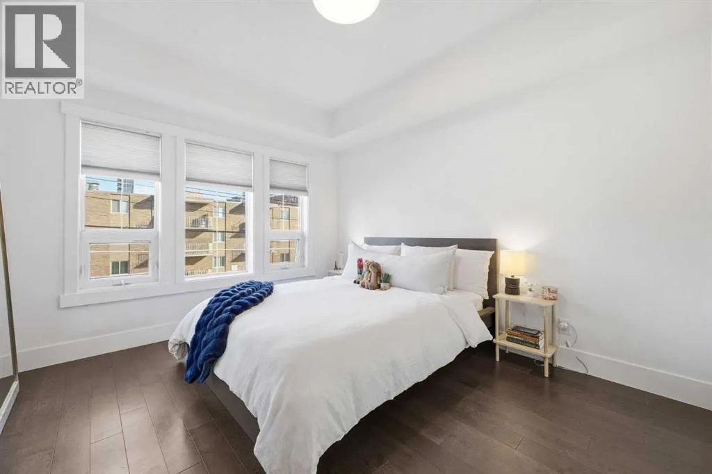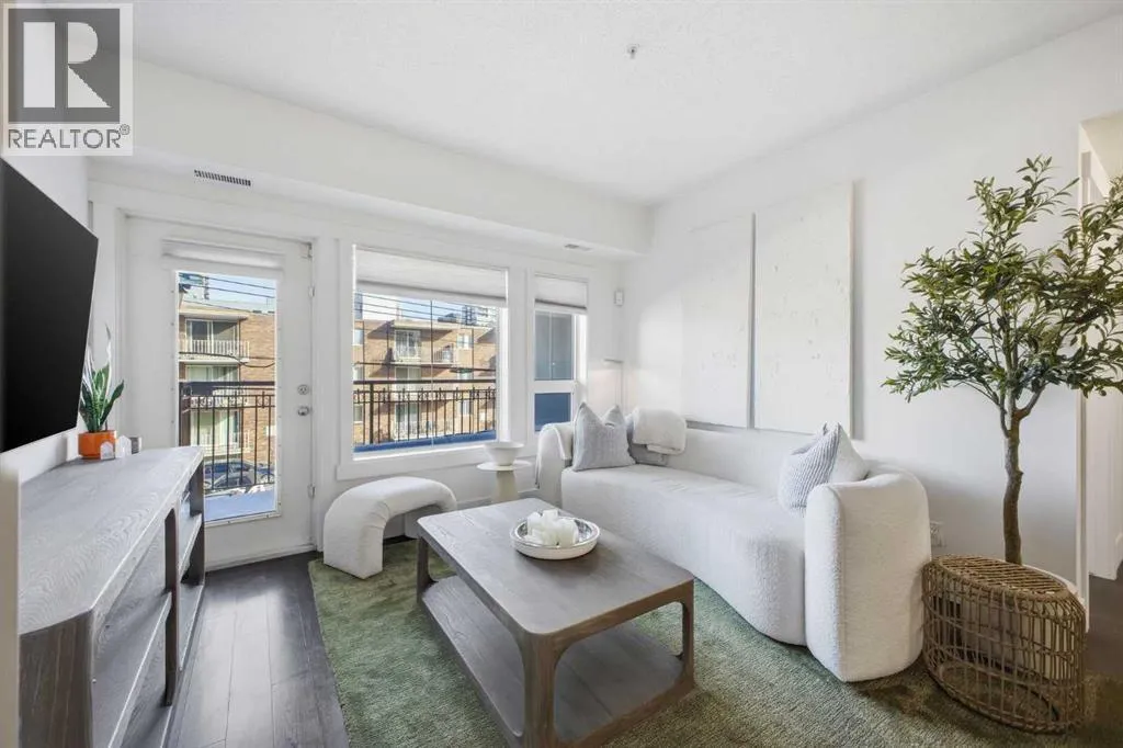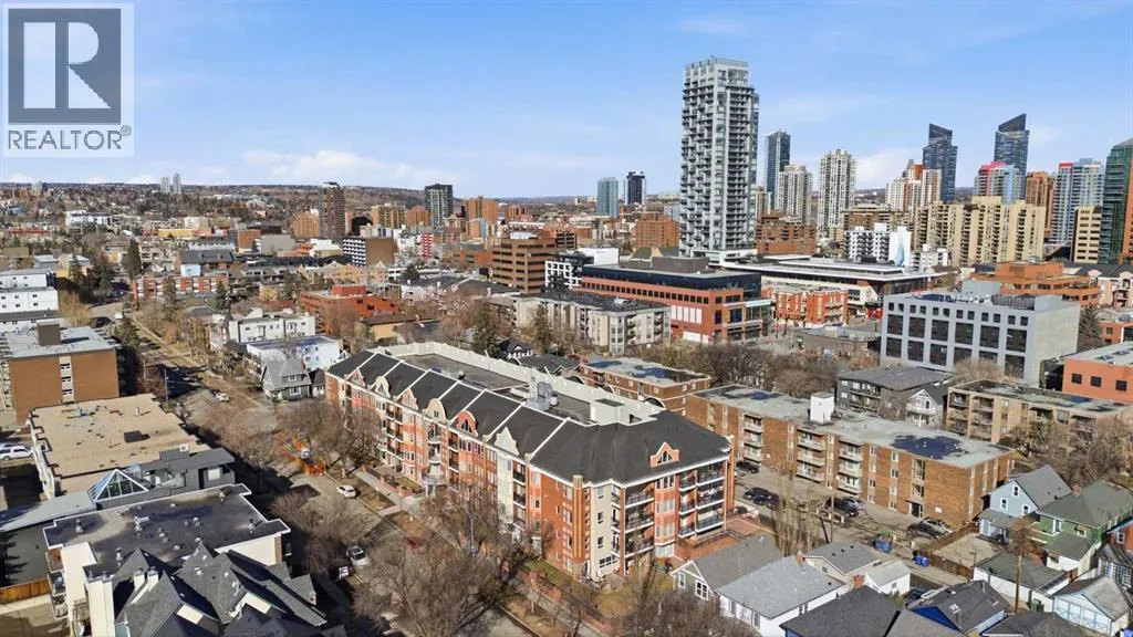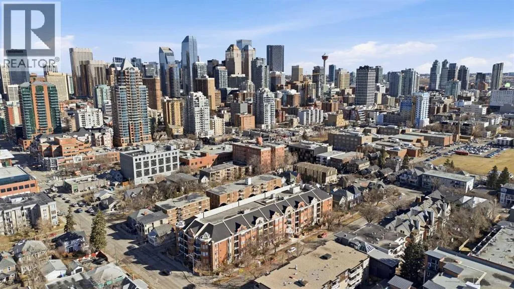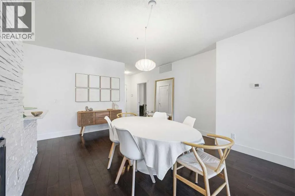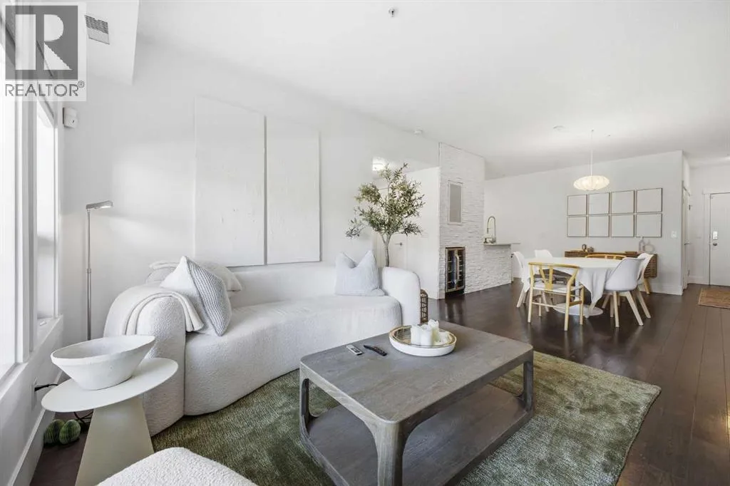 Bright and spacious, this 2-bedroom condo sits in the heart of Lower Mount Royal and offers an inviting blend of style and comfort. Espresso stained hardwood flooring and high ceilings create a warm, open feel throughout the main living spaces. The generous living area flows seamlessly into the dining space, where a feature stone wall with a built in wine fridge adds both character and function. The sleek kitchen is appointed with quartz countertops, crisp white cabinetry, and stainless steel appliances. The primary bedroom offers excellent closet space and a spa inspired 3 piece ensuite. A second bedroom and additional 4 piece bath provide ideal accommodations for guests or a dedicated home office. Additional highlights include Nest temperature control, in suite laundry, a private balcony, in suite storage, and a titled parking stall. All of this is set just steps from the vibrant shops and restaurants of 17th Avenue, close to the Bow River pathways, and within walking distance of the downtown coreâan unbeatable location for urban living. (id:27476)