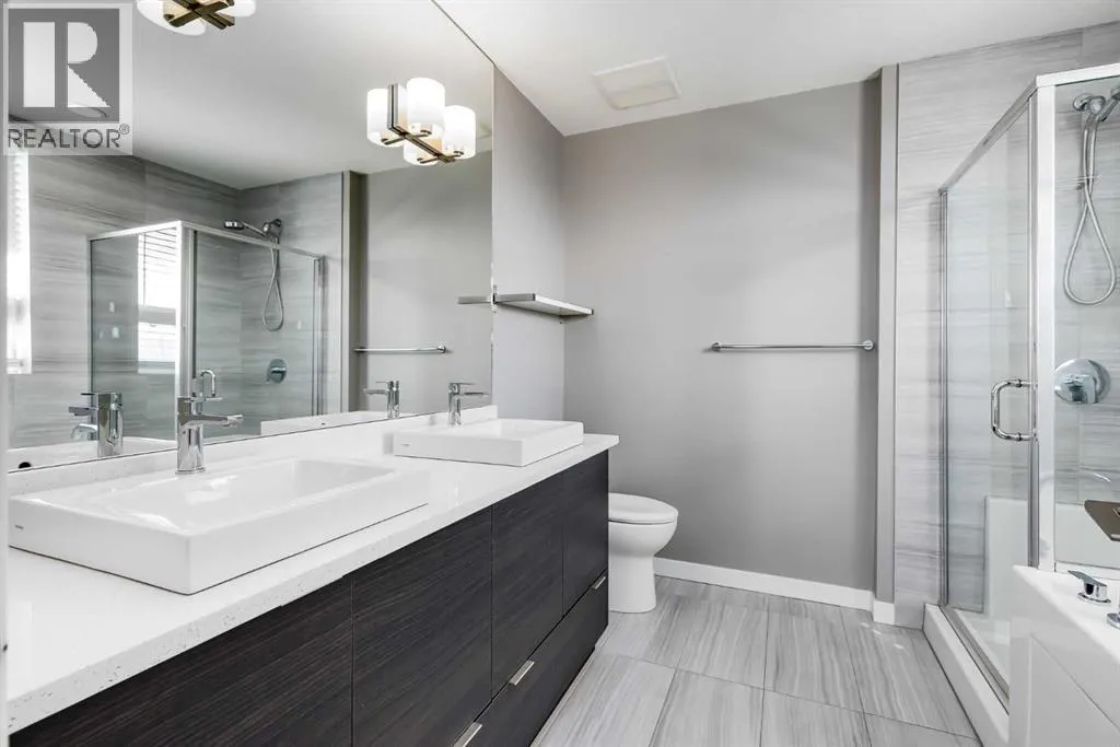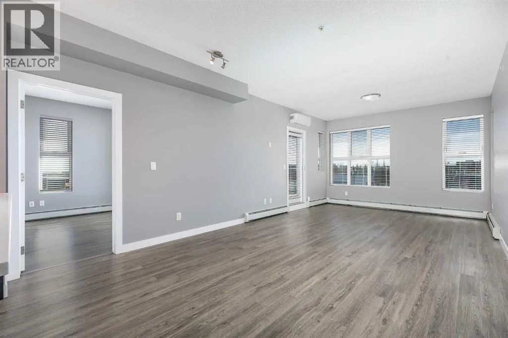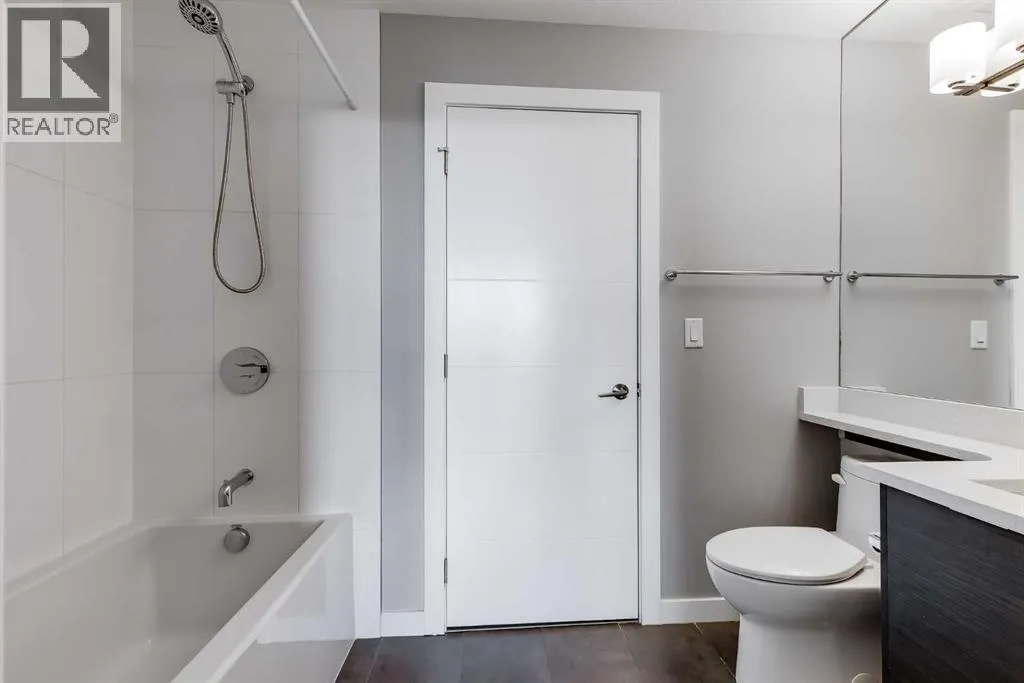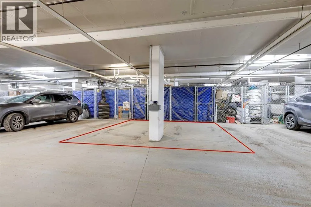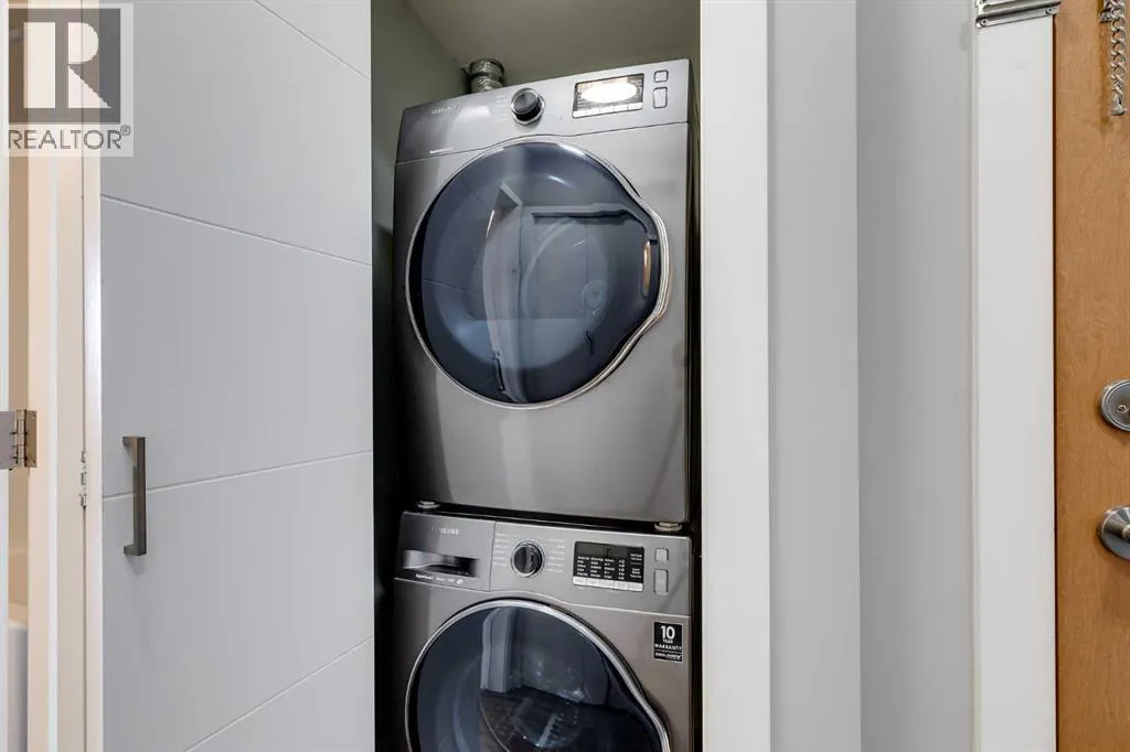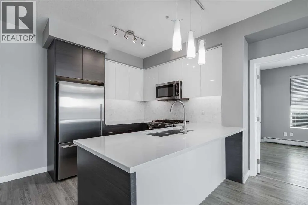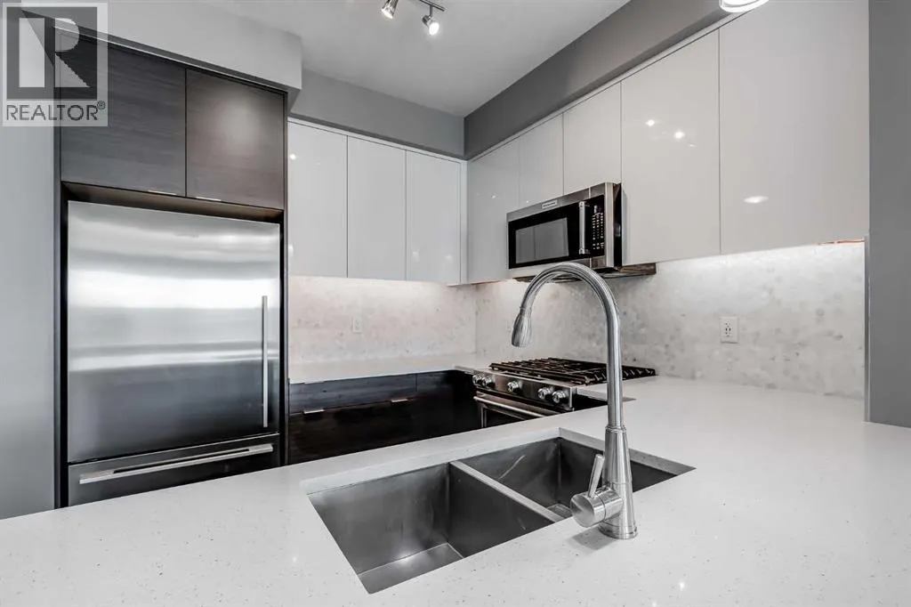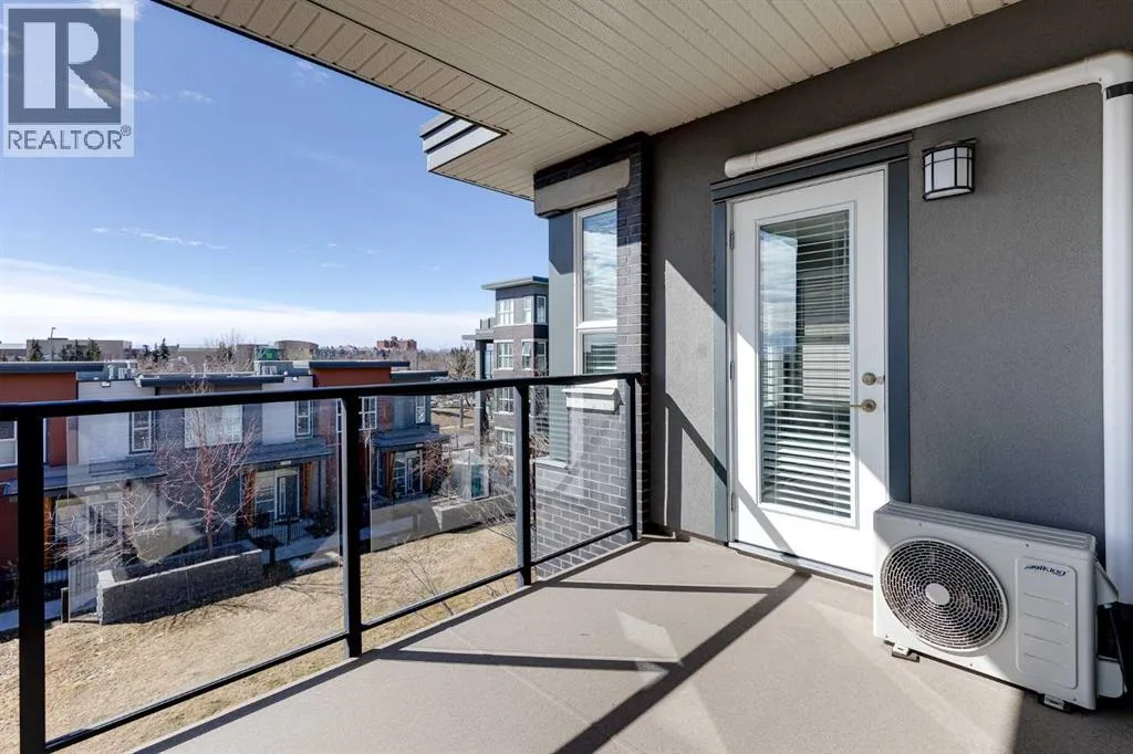 Welcome to this beautifully appointed 3rd-floor CORNER UNIT in the sought-after community of Currie Barracks - where larger corner units like this rarely come available! Enjoy the perfect blend of style, comfort, & convenience.Soaked in natural light, this bright and airy home features 950 sq ft with a sunny SOUTH-FACING balcony, 2 SPACIOUS BEDROOMS, 2 FULL BATHROOMS, AIR CONDITIONING, 2 TITLED UNDERGROUND PARKING STALLS, and 2 STORAGE UNITS - it is everything you want and more!The open-concept layout is thoughtfully designed for everyday living & effortless entertaining. You will immediately notice the elevated finishes throughout, including luxury vinyl flooring, 9â ceilings, neutral paint, and a stunning kitchen complete with quartz countertops, soft-close cabinetry, LED under-cabinet lighting, a stylish backsplash, and stainless steel appliances including a gas stove.The inviting primary retreat offers significant space with additional windows, a large walk-in closet and a luxurious 5-piece ensuite with dual sinks, a separate shower, & a relaxing soaker tub. The second bedroom is generously sized, offers direct access to the well appointed 4-piece bathroom, and is ideally positioned for privacy.Your in-suite laundry and entryway are neatly tucked away, adding to the homeâs thoughtful design and comfort.Step outside to your sunny balcony, perfectly positioned to take in the tranquil courtyard, partial mountain views, and complete with a gas line for easy outdoor living. Your two titled parking stalls include two full storage areas adding to your convenience.Further highlights of this incredible building include a car wash bay, bike storage, and ample visitor parking. The moment you enter, you can truly feel how special this building is.Ideally located just steps to Mount Royal University and minutes to parks, pathways, Marda Loop, Glenmore Park & Reservoir, shopping, restaurants, downtown, the mountains and more! This is an exceptional opportunity to own a premiere condo in one of Calgaryâs most desirable communities.Call your favourite Realtor and book your private showing today! This home is pristine and move-in ready! (id:27476)