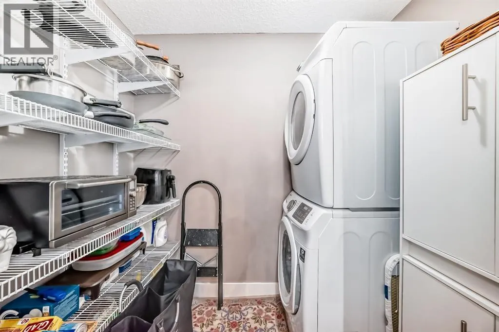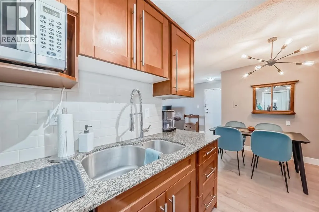 ONE OF THE BEST LOCATIONS IN THE VILLAGE OF WESTHILLS WITH DOWNTOWN VIEWS. Updated kitchen which includes Granite countertops throughout, Stainless Steel appliance package which includes a newer fridge, stove, dishwasher and microwave oven. Updated kitchen cabinets, sink and faucet. Large walk-in pantry. Engineered hardwood floor throughout. Most of the lighting has also been updated. Large master bedroom with plenty of room for a king size bed, double closets. Spacious living room with a fireplace. The sliding doors off the living room lead to a private balcony with a large separate storage room. This property is located close to downtown, parks, off lease areas, Edworthy Park and easy access to Stoney Trail. This home shows "Pride of Ownership" and has been very well maintained. (id:27476)