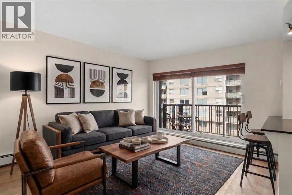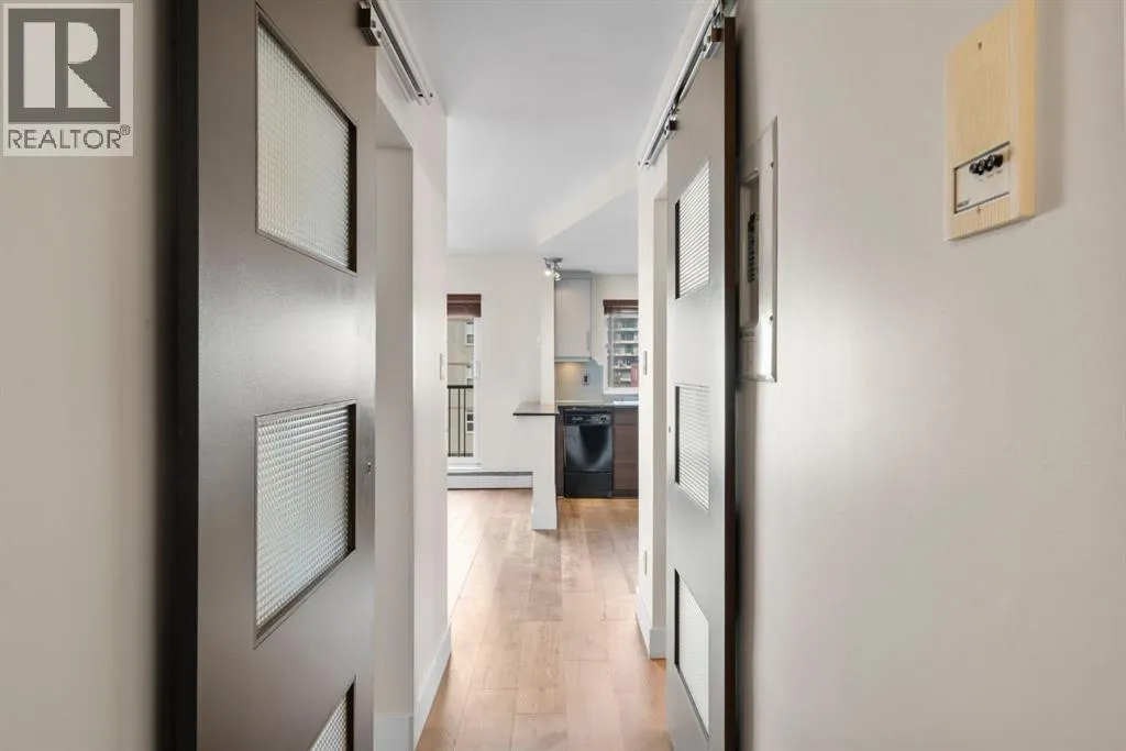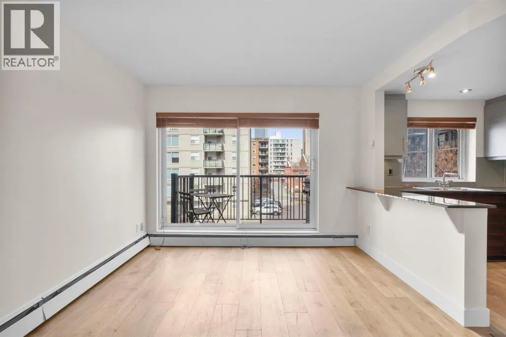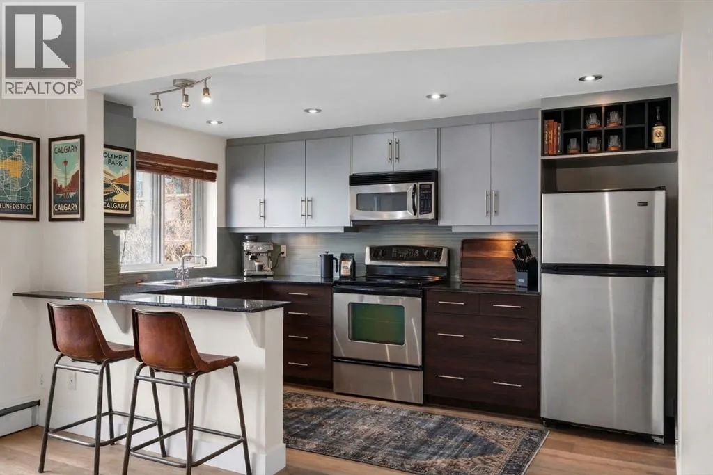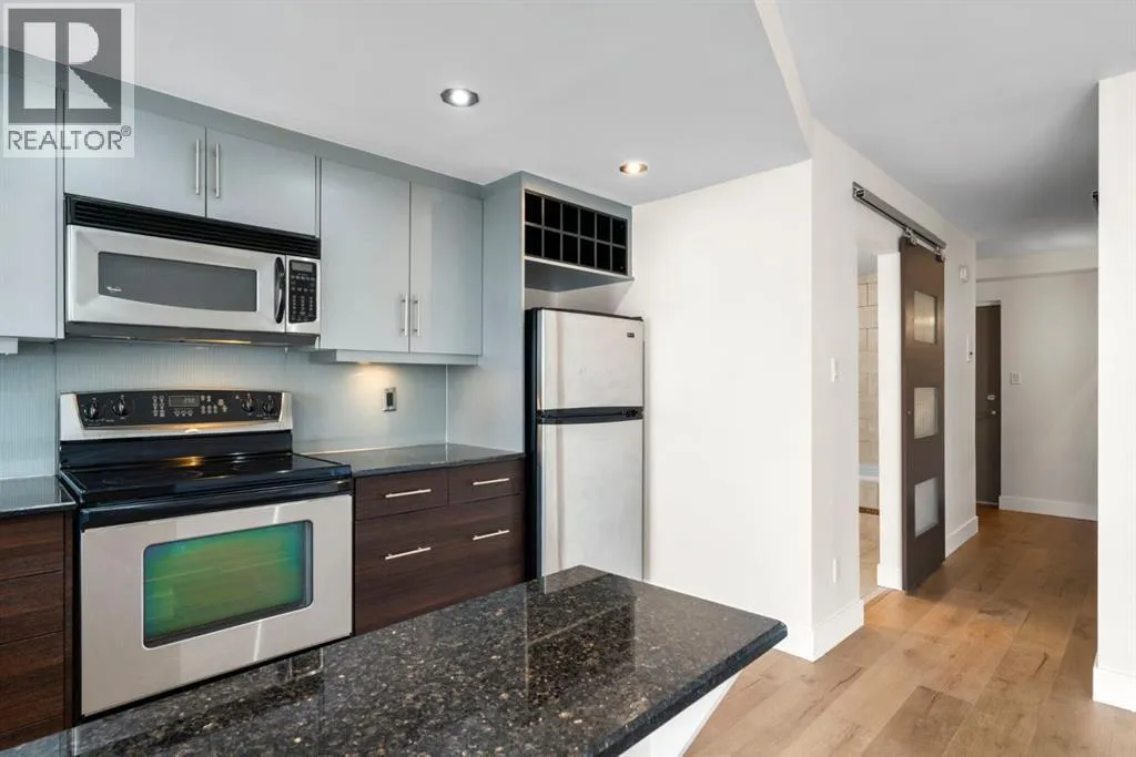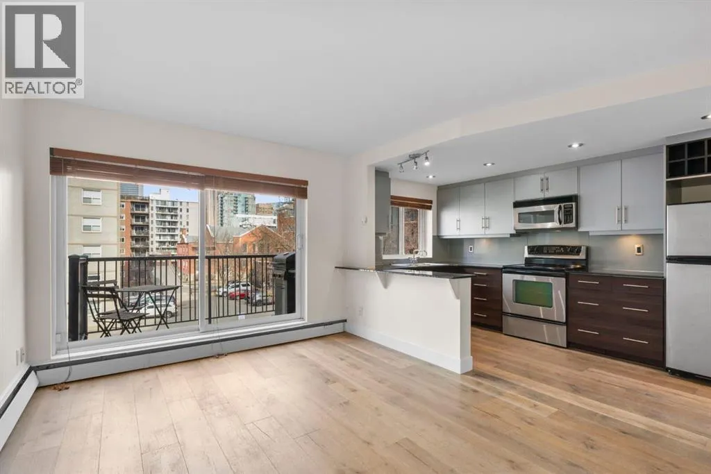 TOP-FLOOR CORNER UNIT - IN ONE OF DOWNTOWN'S BEST LOCATIONS - STEPS TO 17TH AVE! Set on one of the most desirable streets in the Beltline area, this location delivers unbeatable walkability. Just steps to 17th Avenue!! You will be surrounded by Calgaryâs top restaurants, cafés, fitness studios and boutiques - all within a 5-minute walk. Quiet, tree-lined and incredibly central, this building is on a street that offers both energy and calm. Located in a well-maintained small (only 16 units!) CONCRETE building, this TOP FLOOR, corner unit offers added privacy with no neighbours above you. This 4-level walk-up is known for its solid construction and quiet living. Secure FOB access gets you in the building. Inside, youâll find NEW HARDWOOD floors throughout, BIG closet at front entrance. This unit maximizes the space - 484 sq ft - and feels big and open! Functional 1 bedroom, 1 bathroom layout with TONS of natural light. Enjoy cooking in your kitchen with lots of counter space (GRANITE!) PLUS a great sized window above the sink! Open concept. BALCONY. Nice sized bedroom with AWESOME closet space and glass sliding doors. Barn doors, baseboards, lighting, handles and cabinet coloring - truly make this unit feel updated and modern! LAUNDRY IN THE UNIT! Brand new washer/dryer. Soaker tub. PET-FRIENDLY building (with board approval) - no size or breed restrictions - makes this a rare find for pet owners in the inner city!!! Condo fees include heat and water. An ideal opportunity for those seeking inner-city living with exceptional walkability, privacy and long-term value. Don't have a car? You can literally WALK/BIKE everywhere....But this unit comes with assigned parking! Work downtown? Enjoy the benefits of inner-city living - with reduced commute times = come home for lunch or take the dog out! Transit is close - 2 bus stops within a two min walk. Perfect for young professionals, first-time buyers or investors! STOP renting - pay your own mortgage i nstead!!!! NO POST TENSION CABLES! SHORT TERM RENTALS ALLOWED WITH BOARD APPROVAL! (id:27476)