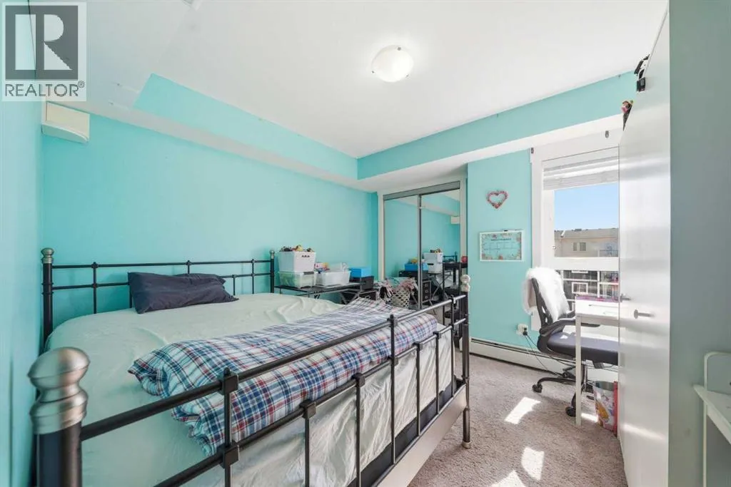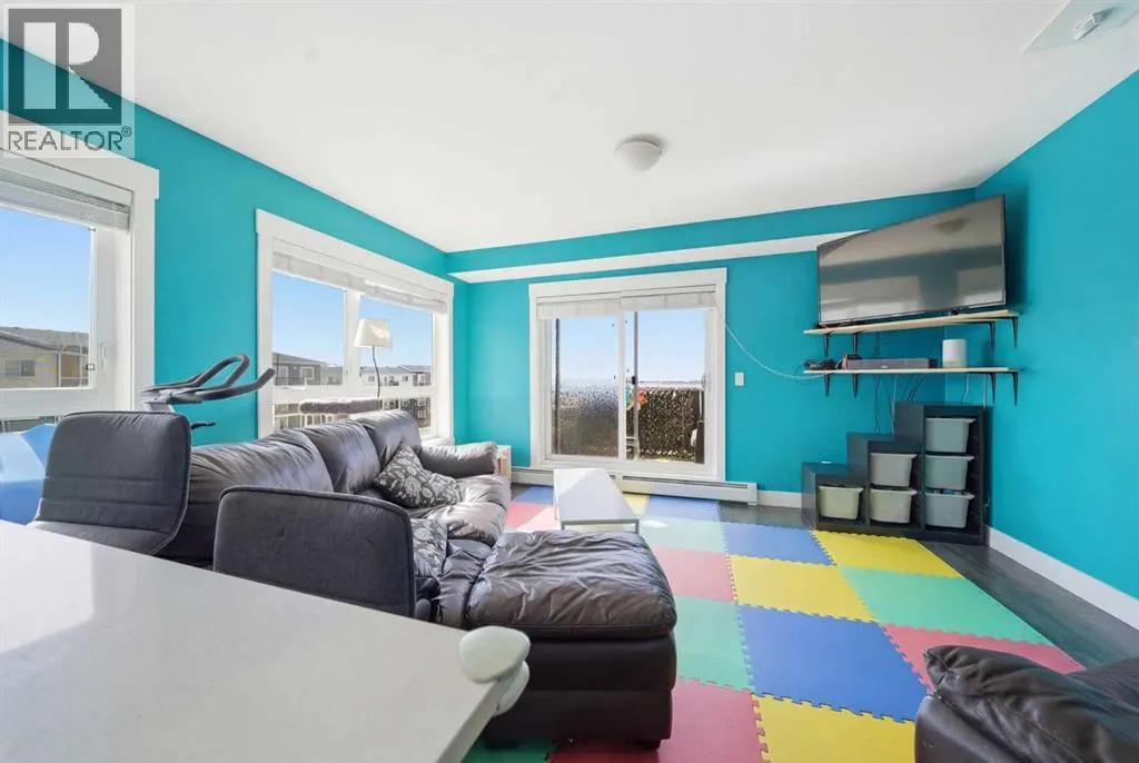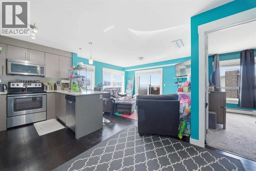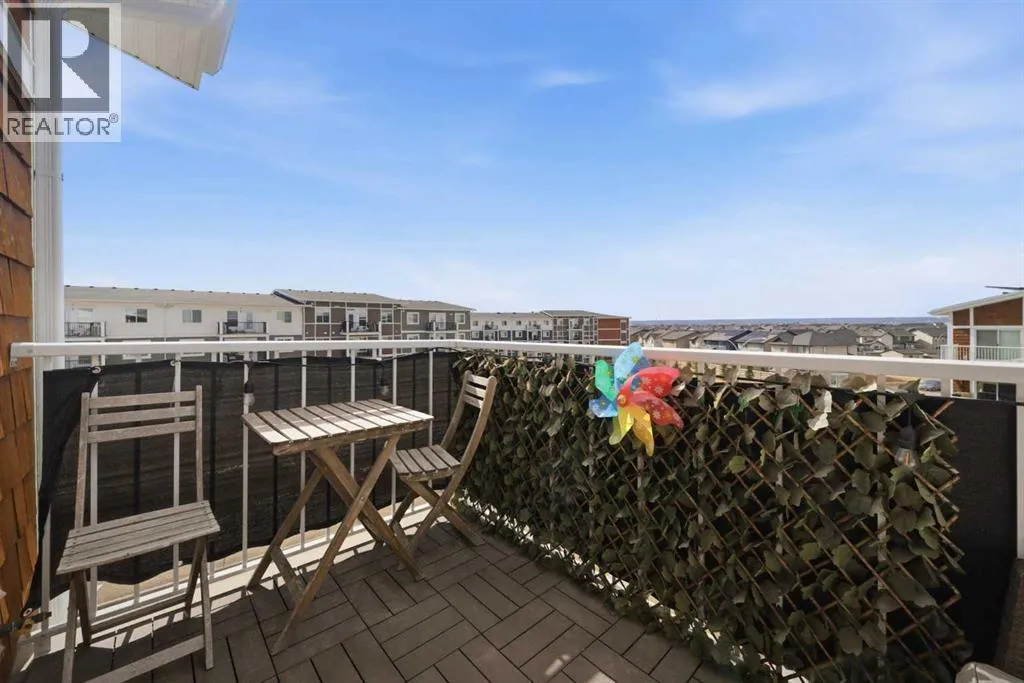Welcome to this top floor, corner unit in Skyview Ranch, because more light, more privacy, and no upstairs neighbors is always the move. This 2 bedroom, 2 bathroom condo features a bright open-concept layout with quartz countertops, modern cabinetry, and a large island thatâs perfect for everyday living and entertaining. The living area opens onto your private balcony, creating the perfect place to relax. The primary bedroom includes a walkthrough closet and private ensuite, while the second bedroom and full bathroom offer flexibility for guests or a home office. Complete with in-suite laundry, 1 underground parking stall, 1 above ground parking stall, and storage locker. This unit is located close to shopping, restaurants, and major routes! This is low-maintenance living done right. (id:27476)