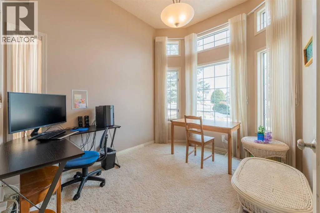 Welcome to this west-facing semi-detached bungalow (half duplex) in Signal Hill, offering a relaxing outdoor deck for evening sun and mountain views on clear days. Inside, soaring vaulted ceilings and abundant natural light set the tone for an inviting open-concept living and dining space anchored by a cozy gas fireplaceâideal for both everyday comfort and entertaining. The kitchen and dining area flow seamlessly to the deck for easy indoor-outdoor living.The main floor features a spacious primary bedroom with a walk-in closet and a 4-piece ensuite, plus a second bedroom, a dedicated office/den, an additional full bathroom, and convenient main-floor laundry.A true highlight is the fully finished walkout basementâbright, spacious, and highly functional. With direct access to the backyard, this level feels open and livable, not like a typical lower floor. Enjoy a large recreation/family area with its own gas fireplace, plenty of room for a home theatre, gym, kidsâ play zone, or guest setup, plus a third bedroom, another full bathroom, a flexible bonus room, and excellent storageâperfect for multi-generational living or a growing family.Mechanical highlights include dual boiler heating with separate zoning for the main level and basement, separate hot-water systems (dual hot water), central A/C, a fresh-air ventilation system (HRV/ERV), and a water softener.. Enjoy a prime westside location with walkable access to the public library, nearby parks and pathways, convenient shopping and dining at Westhills / Signal Hill Centre, transit options, and quick routes around the city. Designated to Ernest Manning High School, a well-regarded option on Calgaryâs west side (buyers to verify school designations and program eligibility). (id:27476)