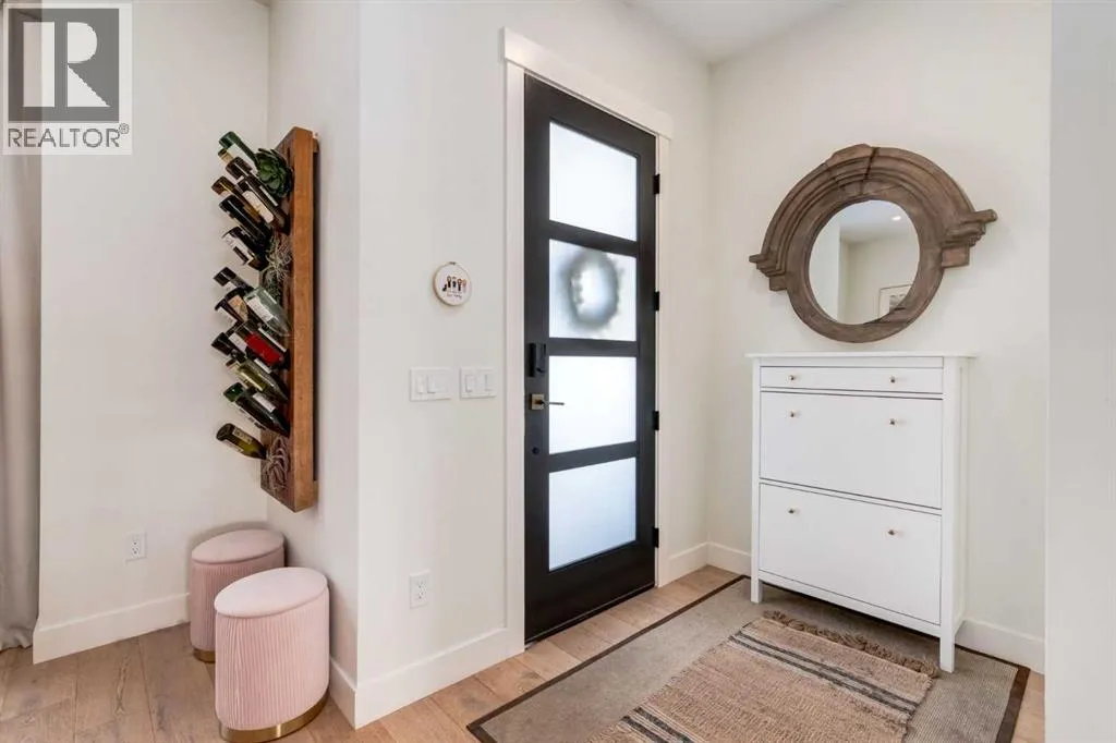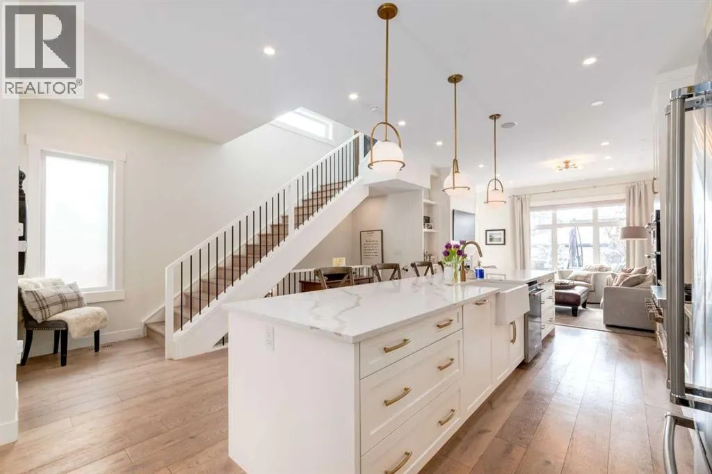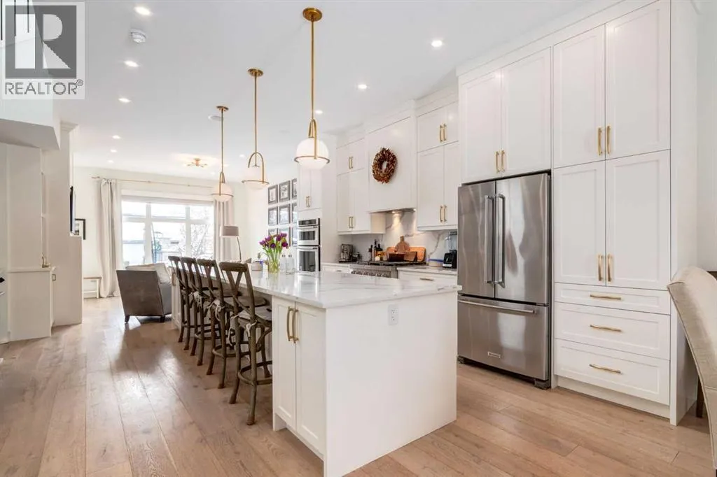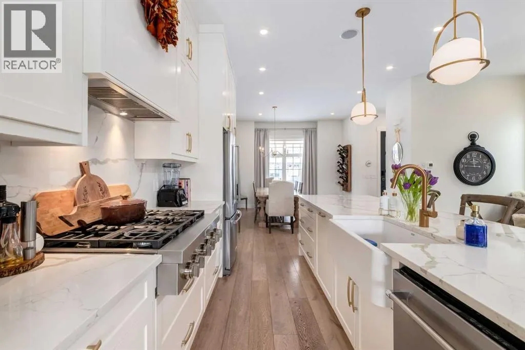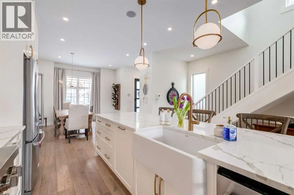 Not your average semi-detached home, but rather luxury living at its finest in the highly sought-after community of North Glenmore Park. This exceptional custom infill offers almost 3,000 sq ft of beautifully finished space with a modern farmhouse exterior, striking black mullioned windows, and professionally landscaped front and back yards designed for seamless indoor-outdoor living.The main level features 10-ft ceilings, wide-plank white oak flooring, and an open-concept layout. A chef-inspired kitchen anchors the space with a 12-ft quartz island, farmhouse sink, premium appliances, and custom cabinetry, flowing into a spacious dining area with floor-to-ceiling windows and an elegant living room with a custom built-in feature wall and gas fireplace.Upstairs offers a luxurious primary retreat with a spa-like ensuite, you need to see to appreciate, and a walk-in closet, plus two additional bedrooms, a full bath with a steam feature, and a well-appointed laundry room. The fully developed basement includes 9-ft ceilings, a large rec room with a wet bar, a fourth bedroom with a walk-in closet, and a full bathâideal for guests or extended living.The private backyard is a true highlight, featuring a built-in Napoleon BBQ, upper deck, lower patio with outdoor fireplace, water feature, and lush landscaping.Loaded with tons of upgrades, air conditioning, and built-in speakers, all just minutes to downtown, Marda Loop, Glenmore Reservoir, and endless parks and pathways. This one is a Must See!! (id:27476)