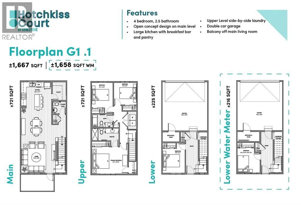 StreetSide proudly presents this highly desired interior-unit townhome that offers a sophisticated blend of expansive living space and elegant modern finishes. Designed with versatility in mind, the residence features four spacious bedroomsâincluding a convenient lower level bedroom ideal for guests or a home officeâand two and a half well appointed bathrooms. The heart of the home is an open-concept main floor that flows seamlessly onto a private balcony, perfect for indoor-outdoor entertaining. Culinary enthusiasts will appreciate the chef-inspired kitchen, which comes standard with modern white slab-style cabinetry, a full bank of storage drawers, polished white quartz countertops, and premium stainless steel appliances. The interior aesthetic is defined by contemporary durability, featuring luxury vinyl flooring throughout the primary areas and premium 8lb underlay carpet for added comfort on the stairs and upper level. Practicality meets luxury with a dedicated upper-level laundry room and an attached double car garage. Located in the vibrant community of Hotchkiss, where nature takes centre stage by boasting 80+ combined acres of green space and wetlands, providing a scenic backdrop for modern living. Enjoy proximity to Setonâs vibrant retail district, world-class healthcare, and easy highway access. As the community grows to include its own school and daycare, Hotchkiss remains the premier choice for those seeking a balanced, well-connected lifestyle. Please note that photos used are renderings. (id:27476)