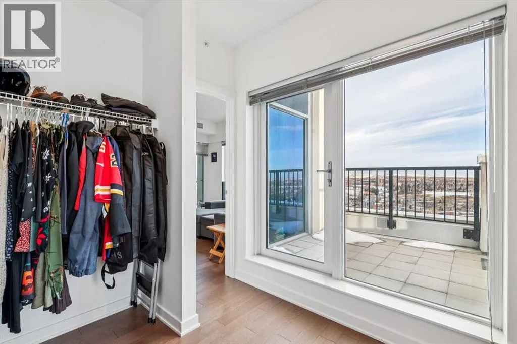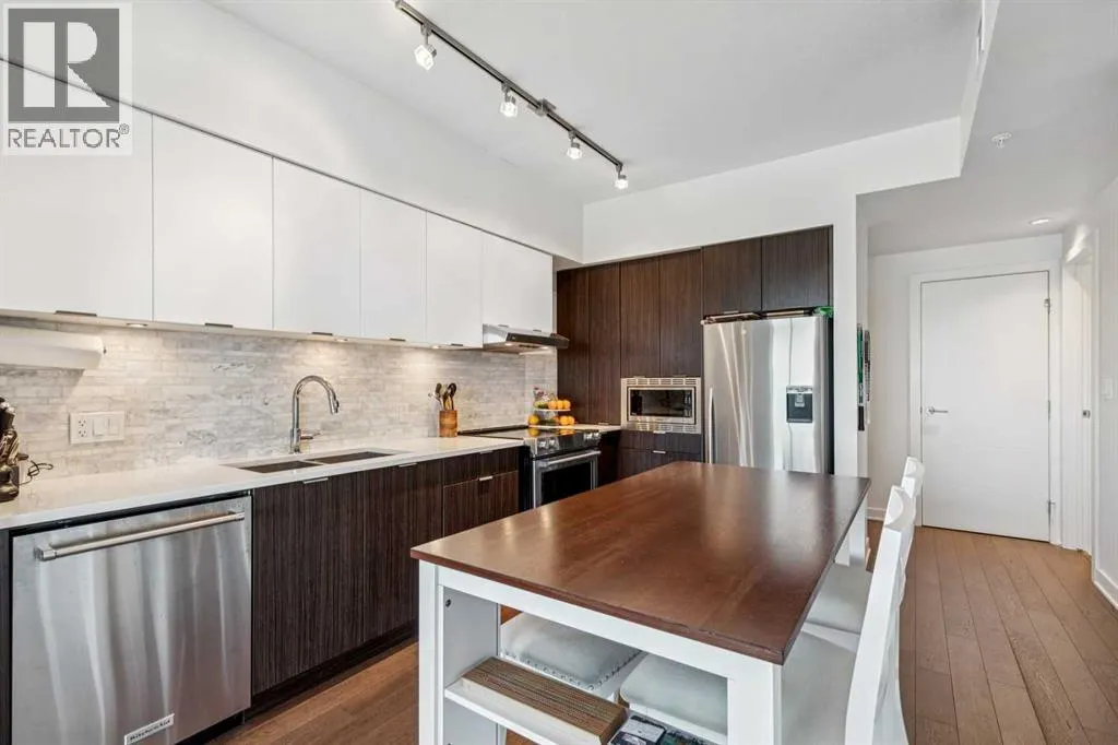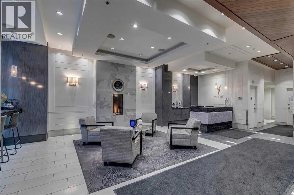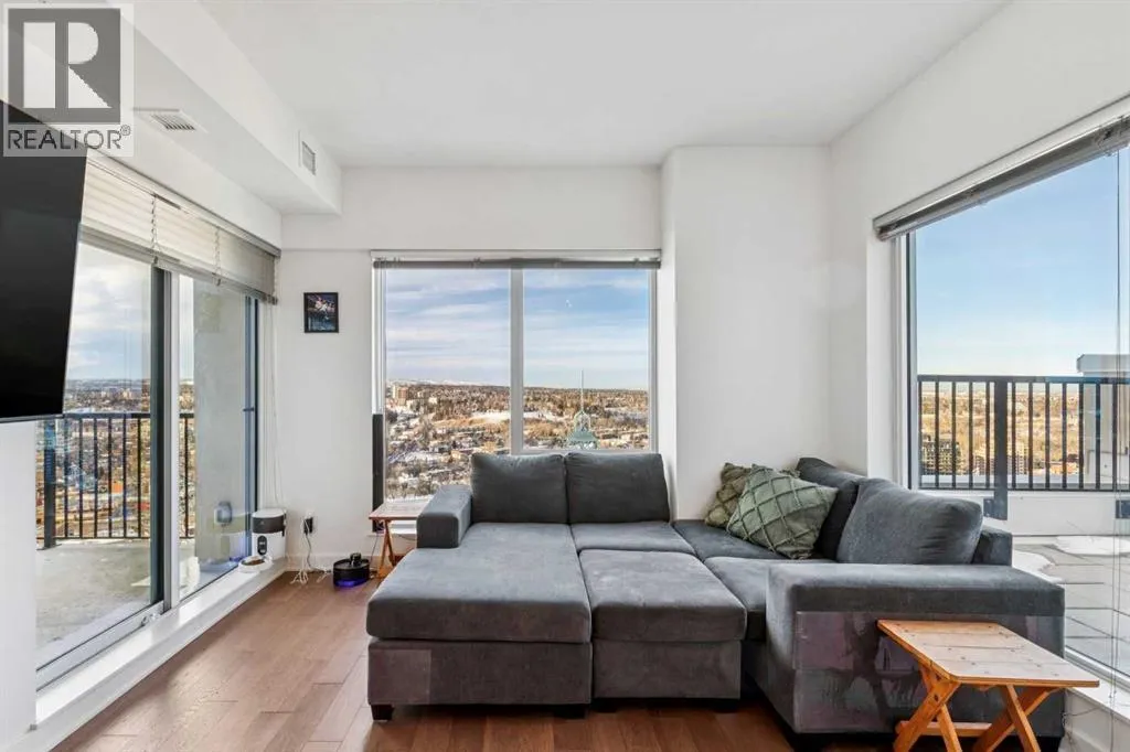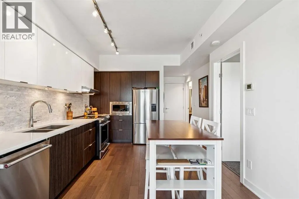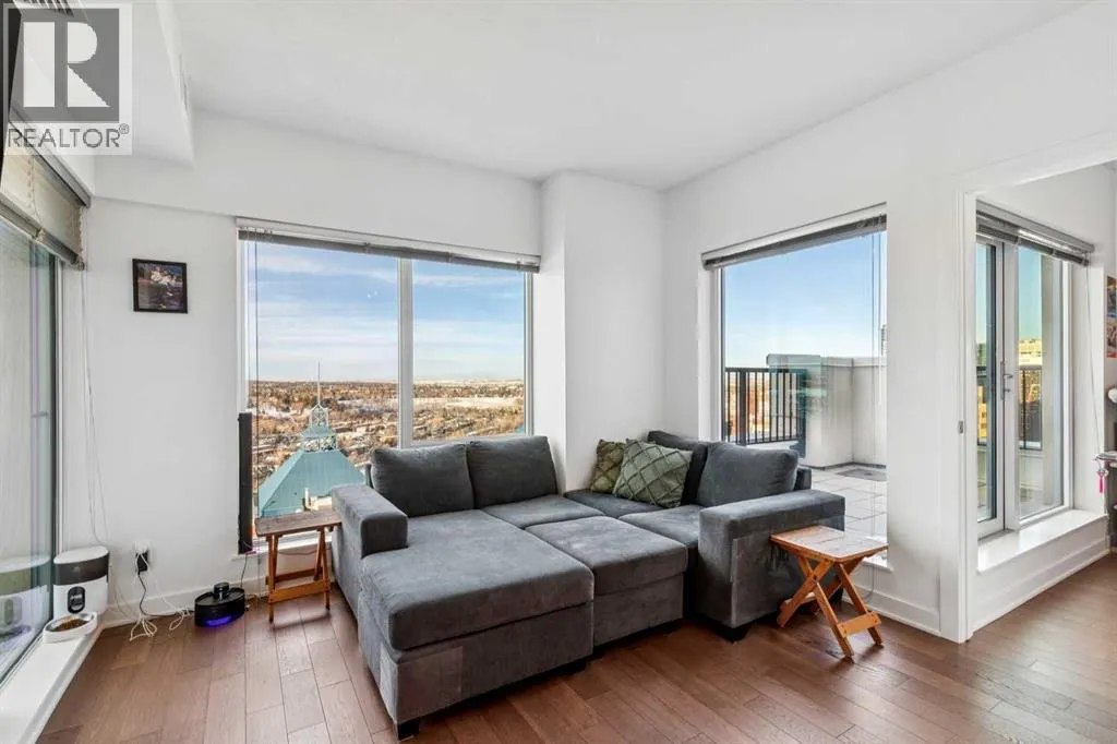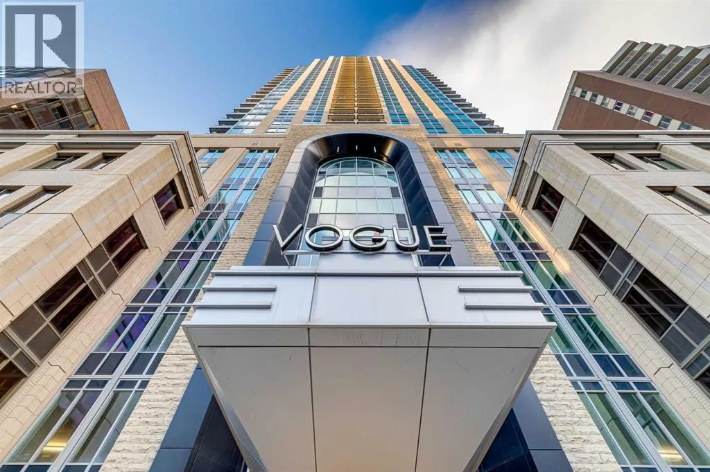 Meet âVimyâ - Panoramic Views | Two Balconies | Sub-Penthouse | Titled Parking - Perched high in the luxurious Vogue building, this end-unit offers one of the most impressive RIVER VIEWS in Calgaryâuninterrupted, expansive, and best experienced from TWO PRIVATE BALCONIES.Natural light pours through floor-to-ceiling windows, highlighting a clean, open layout designed for both everyday living and elevated entertaining. The kitchen is sleek and functional, featuring quartz countertops, full-height cabinetry, under-cabinet lighting, and a stainless steel appliance package that integrates seamlessly into the space.The primary bedroom is thoughtfully designed with a walk-through closet that connects directly to the well-appointed 4-piece bathroom, creating a private, efficient retreat. A second bedroom or office adds flexibility, with its own access to the second balconyâideal for work, guests, or roommates.Additional features include TITLED UNDERGROUND PARKING, a separate STORAGE LOCKER, in-suite laundry, and CENTRAL AIR CONDITIONING.Residents of Vogue benefit from full-service amenities including a CONCIERGE, fitness centre, party room, and elevated social spaces, all within walking distance to the downtown core, river pathways, transit, and Kensington. (id:27476)