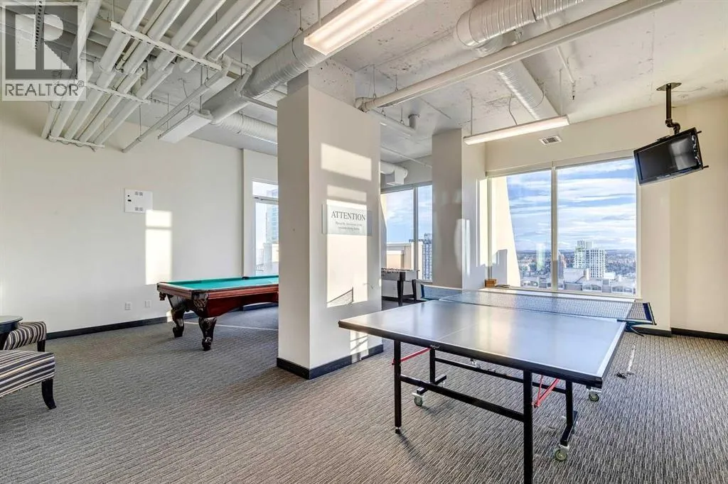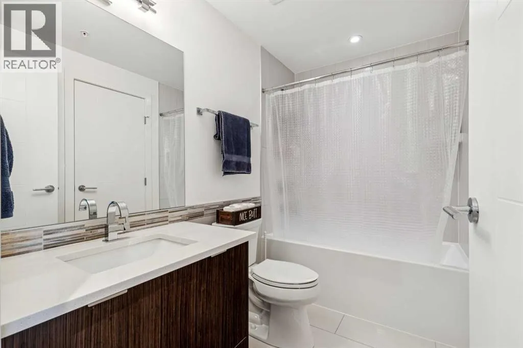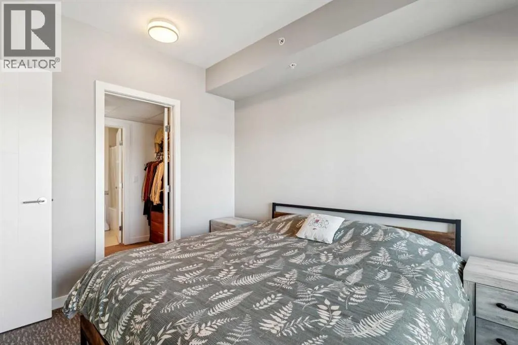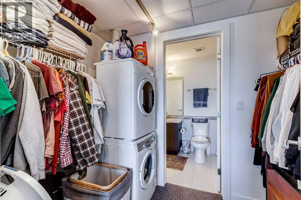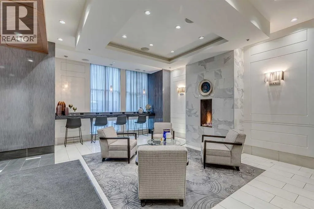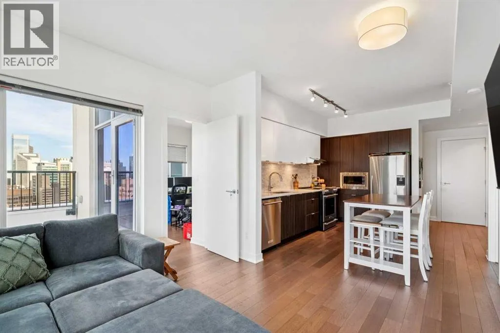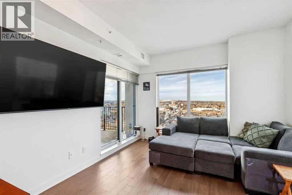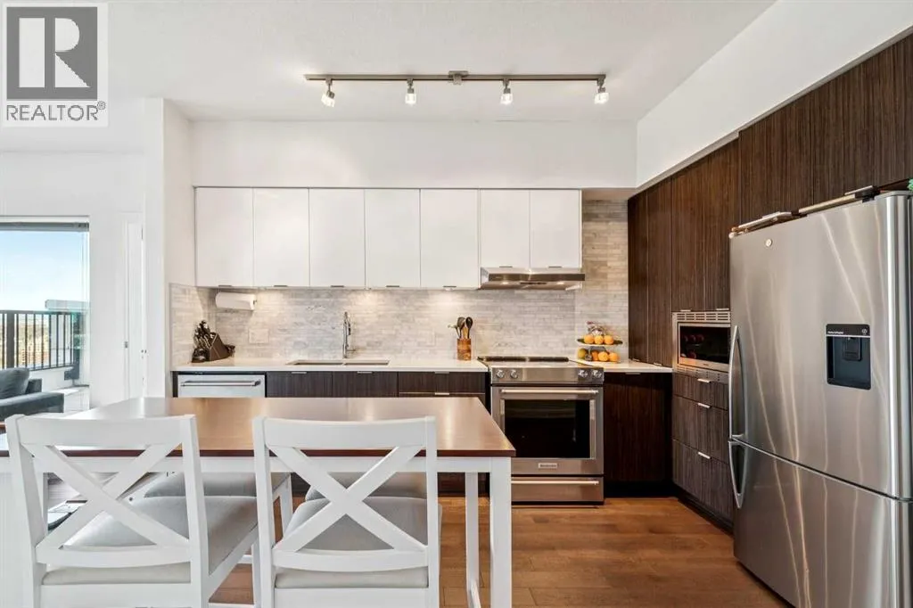 Meet âVimyâ - Panoramic Views | Two Balconies | Sub-Penthouse | Titled Parking - Perched high in the luxurious Vogue building, this end-unit offers one of the most impressive RIVER VIEWS in Calgaryâuninterrupted, expansive, and best experienced from TWO PRIVATE BALCONIES.Natural light pours through floor-to-ceiling windows, highlighting a clean, open layout designed for both everyday living and elevated entertaining. The kitchen is sleek and functional, featuring quartz countertops, full-height cabinetry, under-cabinet lighting, and a stainless steel appliance package that integrates seamlessly into the space.The primary bedroom is thoughtfully designed with a walk-through closet that connects directly to the well-appointed 4-piece bathroom, creating a private, efficient retreat. A second bedroom or office adds flexibility, with its own access to the second balconyâideal for work, guests, or roommates.Additional features include TITLED UNDERGROUND PARKING, a separate STORAGE LOCKER, in-suite laundry, and CENTRAL AIR CONDITIONING.Residents of Vogue benefit from full-service amenities including a CONCIERGE, fitness centre, party room, and elevated social spaces, all within walking distance to the downtown core, river pathways, transit, and Kensington. (id:27476)