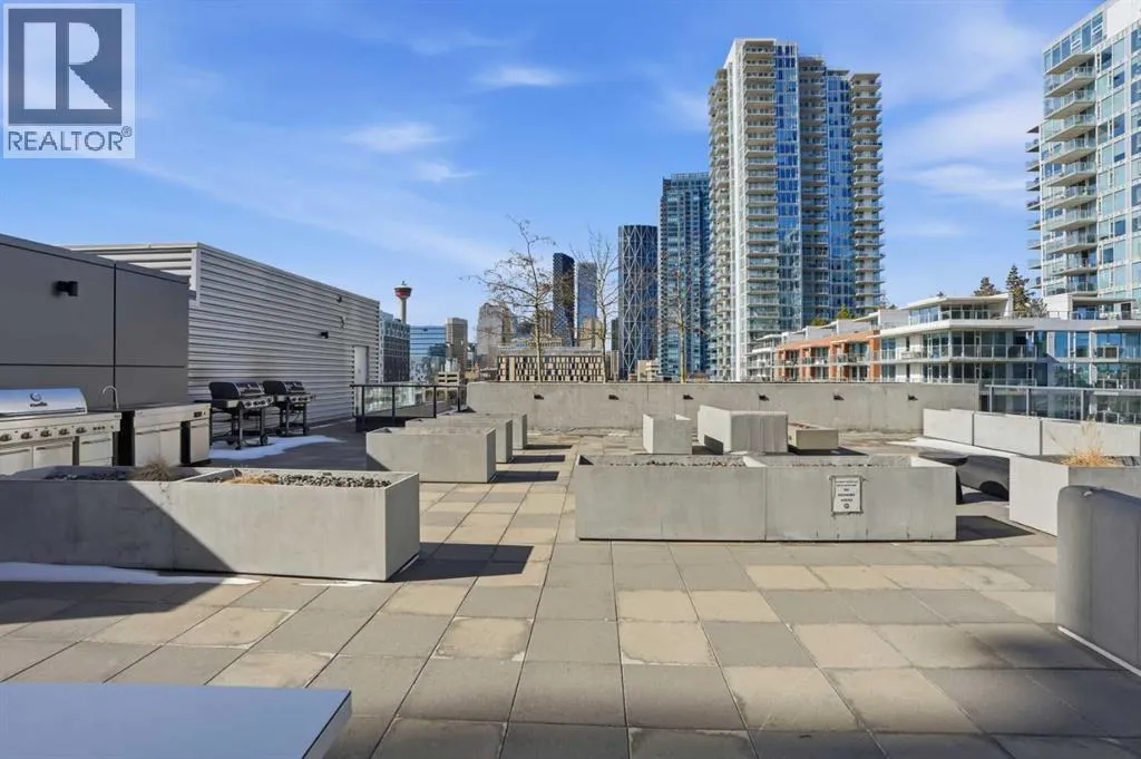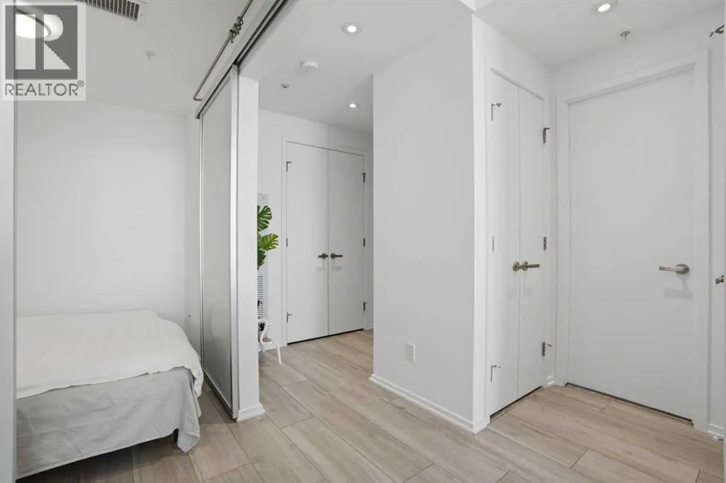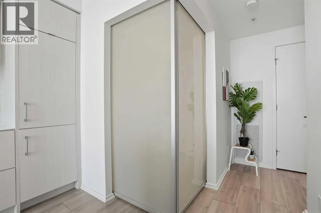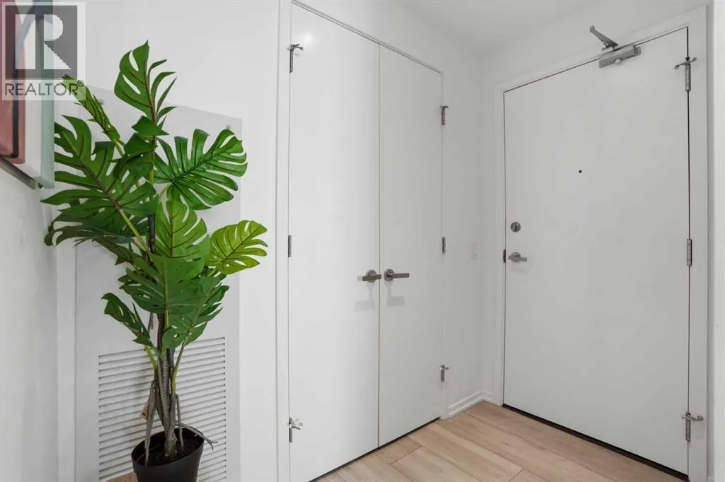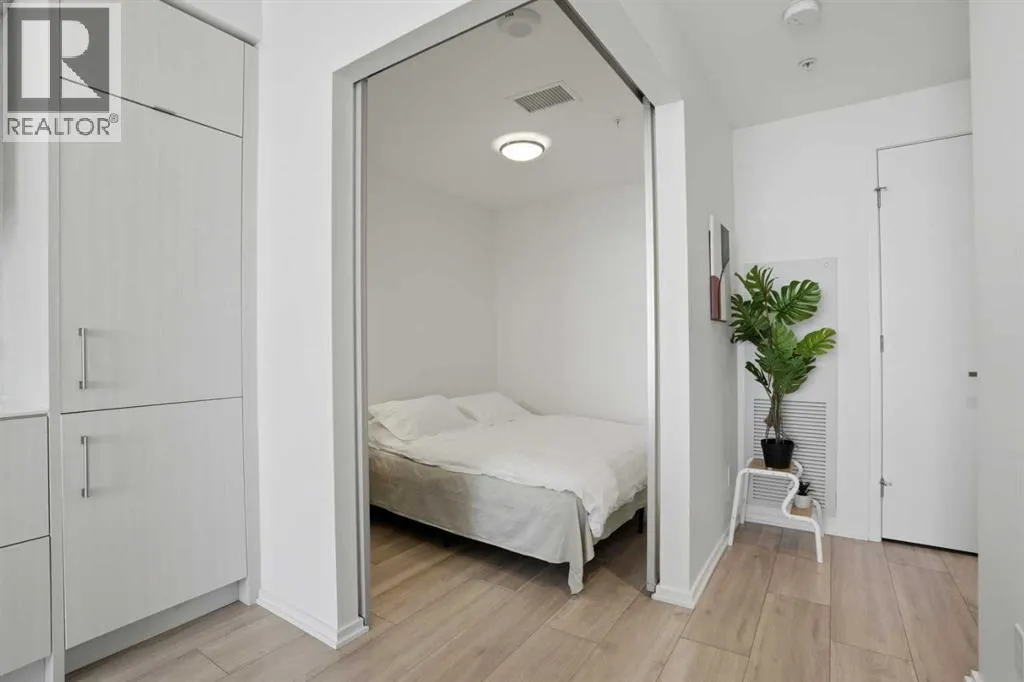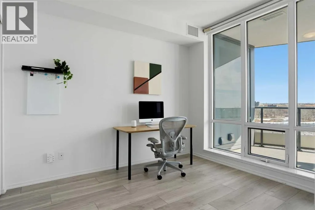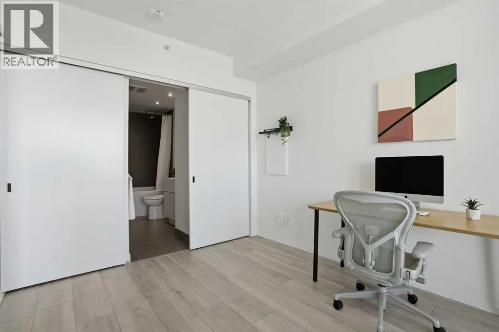 Welcome to this standout 6th floor residence at Verve in East Village, thoughtfully designed as one of the buildingâs most sought-after layouts. Originally featured as the builderâs show suite, this floor plan was chosen for its exceptional flow, functionality, and livability, and it truly stands apart from other units in the building.Offering 1 bedroom plus a spacious den, this home delivers all the space you need without paying for a second bedroom. The den is generously sized and can comfortably fit a king sized bed plus end table. Making it ideal for guests, a home office, or flexible living that rivals a true two bedroom layout.Inside, youâre welcomed by a smart, open-concept design with no wasted space. Unlike many comparable units, there are no long hallways or awkward corners, allowing for a larger, more functional living area. Floor-to-ceiling windows bring in an abundance of natural light, while modern finishes, in suite laundry, and air conditioning ensure everyday comfort. Step outside to your covered balcony, perfect for relaxing or entertaining year-round.Storage is a rare highlight here, with four deep closets throughout the unit, offering more capacity than most similar condos and even competing with many two bedroom layouts. The attention to detail continues with a dedicated storage locker located in a clean, enclosed room on P3, providing a more secure and private alternative to typical parkade storage.Positioned on the 6th floor, this unit offers the perfect balance, not too low, not too high, with direct access to Verveâs best amenities just steps from your door. Enjoy the fully equipped fitness centre, party room, library, and expansive outdoor terrace without ever needing to wait for an elevator.Verve is known for its full concierge service and exceptional lifestyle offerings, including a stunning rooftop terrace on the 25th floor with panoramic views of downtown Calgary, the Bow River, and the mountains.Located in the heart of East Village, youâre just steps from RiverWalk, the CTrain, Superstore, cafes, restaurants, and everyday conveniences, making this one of Calgaryâs most walkable and dynamic communities.This unit includes titled underground parking, a separate storage locker, secure visitor parking, and is pet friendly and approved for mid-term rentals, offering incredible flexibility for both homeowners and investors.A rare opportunity to own one of Verveâs best layouts, combining smart design, exceptional storage, and unbeatable access to amenities. (id:27476)