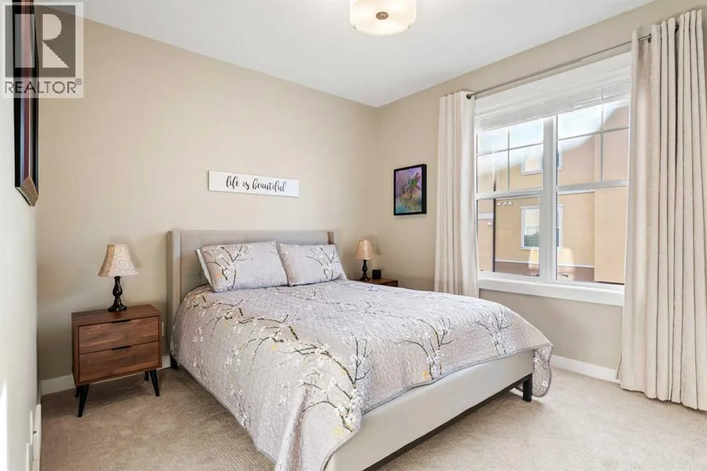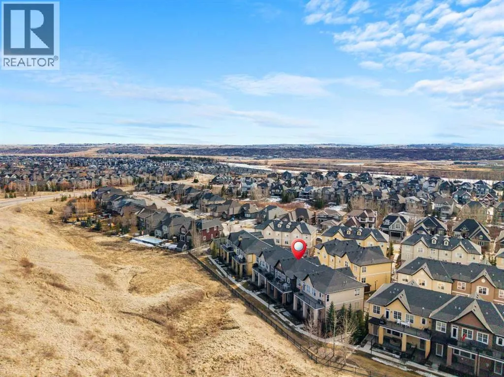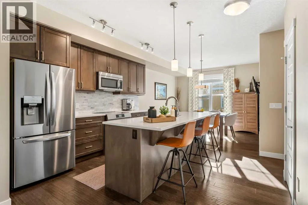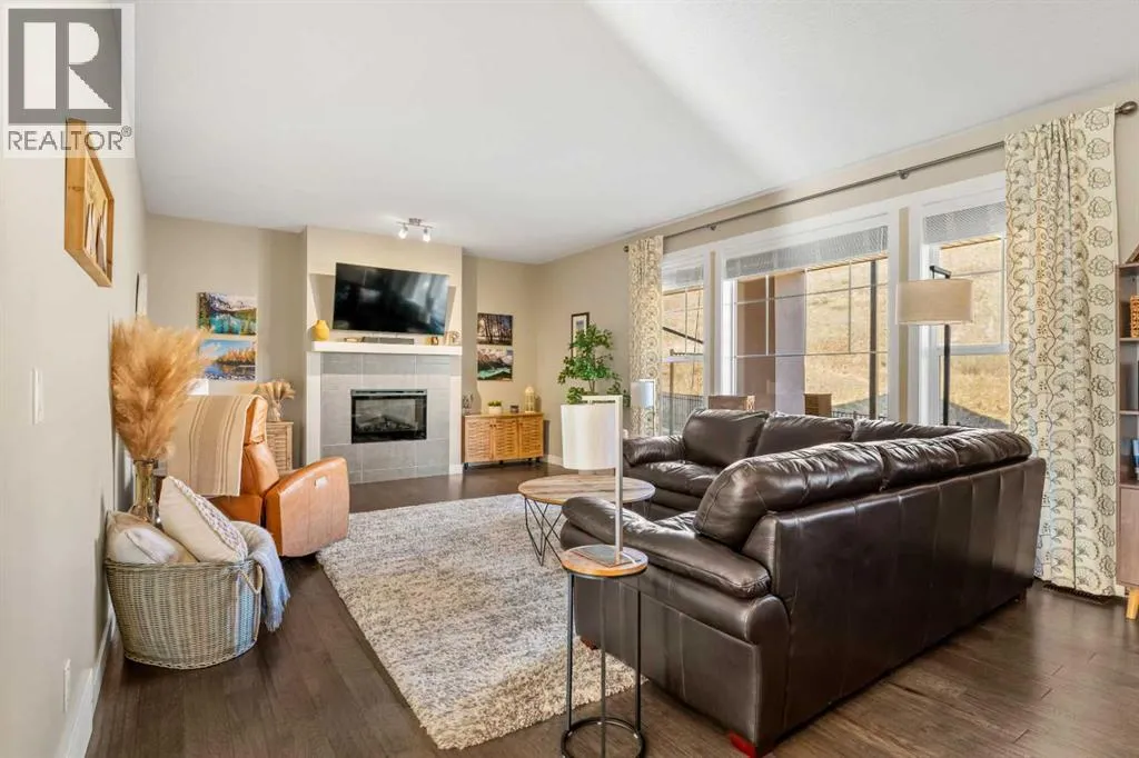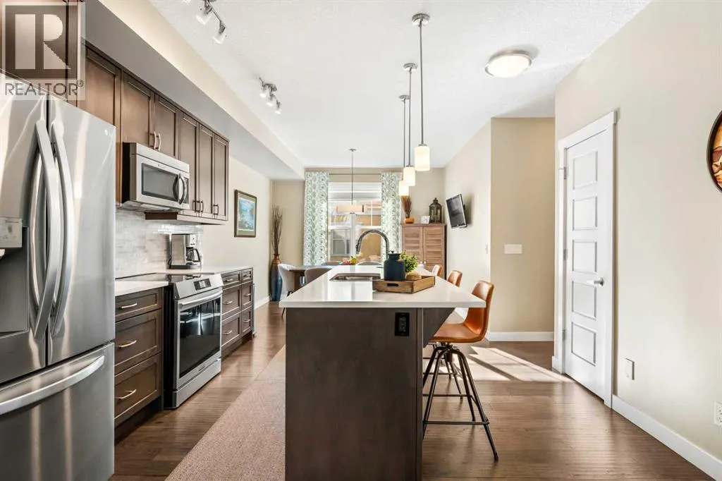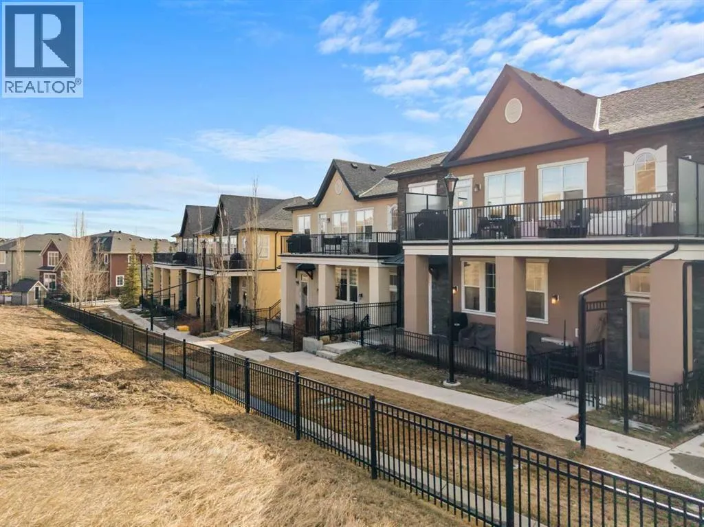 Opportunities like this, do not become available often! ESTATE living Located in the highly desirable community of Cranston Riverstone, this beautifully maintained lower level, BUNGALOW-style townhome offers the perfect blend of comfort, functionality and lifestyleâsurrounded by nature and wild life. With 1732 sq. ft. of combined living space, this home is ideal for downsizers, small families, or buyers seeking low-maintenance living without compromising on style or convenience.The main level features a bright, open-concept layout with durable ENGINEERED HARDWOOD flooring, large windows, and a warm, inviting feel. The living room is centered around a cozy gas fireplace, perfect for relaxing or entertaining. The kitchen is both stylish and functional, complete with quartz countertops, a central island, modern appliances, and ample cabinetry, making everyday cooking a breeze. The adjoining dining area offers plenty of space for hosting and entertaining. This home includes two spacious bedrooms, highlighted by a comfortable primary retreat with a walk-in closet featuring built-in organizers and a private 4-piece ensuite with a double vanity. A second full bathroom provides added flexibility for guests or shared living. In-unit laundry with built-in cabinetry adds everyday convenience.Step outside to enjoy your OVERSIZED patio overlooking the scenic Riverstone HILLSIDE, where nature and wildlife are part of your everyday view. Whether you're relaxing or barbecuing, this outdoor space is perfect for year-round enjoyment. This home also features a FINISHED double attached garage with EXPOXY flooring which also includes garage cabinets, bikes racks and a tire rack. More valuable upgrades include NEW central air conditioning, window coverings, a water softener and doorbell camera. As you enter the basement, this space adds additional versatility, making it an ideal space for a home office, hobby area, or extra storage.Located within Mosaic Riverstone in Cranston, r esidents enjoy professionally maintained grounds with landscaping and snow removal, enhancing the low-maintenance lifestyle. The community offers easy access to walking and biking pathways, schools, shopping, parks, and the Bow Riverâperfect for outdoor enthusiasts. With its smart layout, quality finishes, and prime location in one of southeast Calgaryâs most sought-after communities, 109 Cranbrook Villas SE is an exceptional opportunity! Book your showing today! (id:27476)