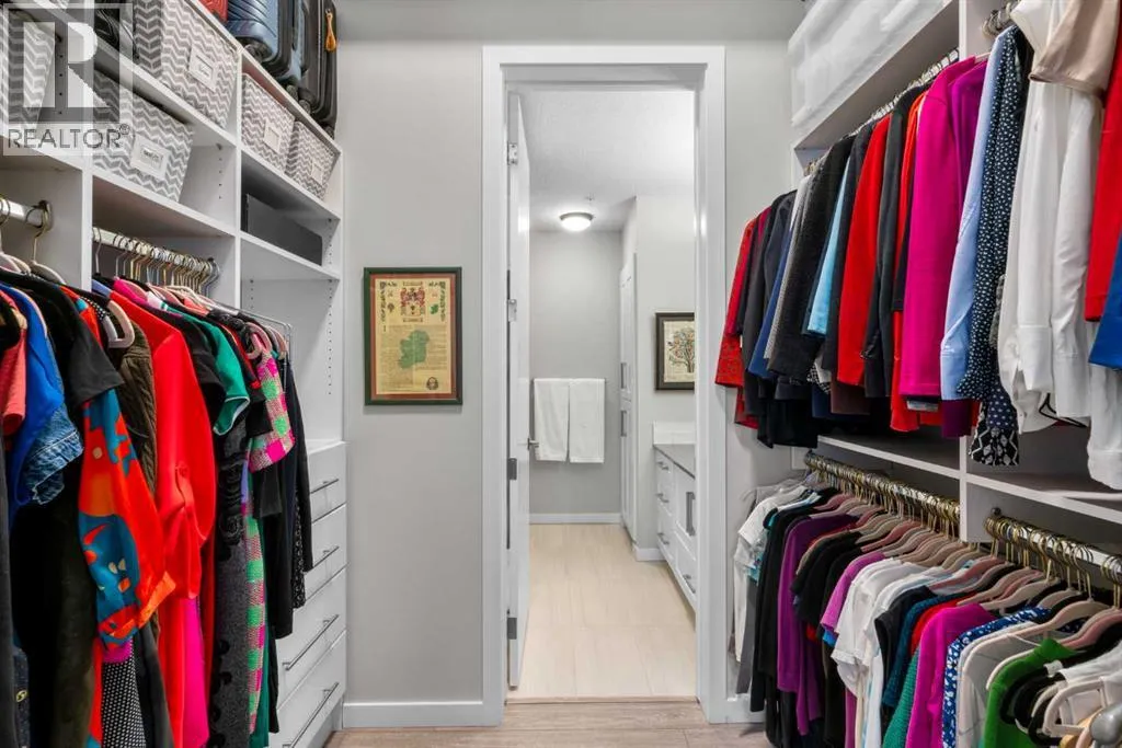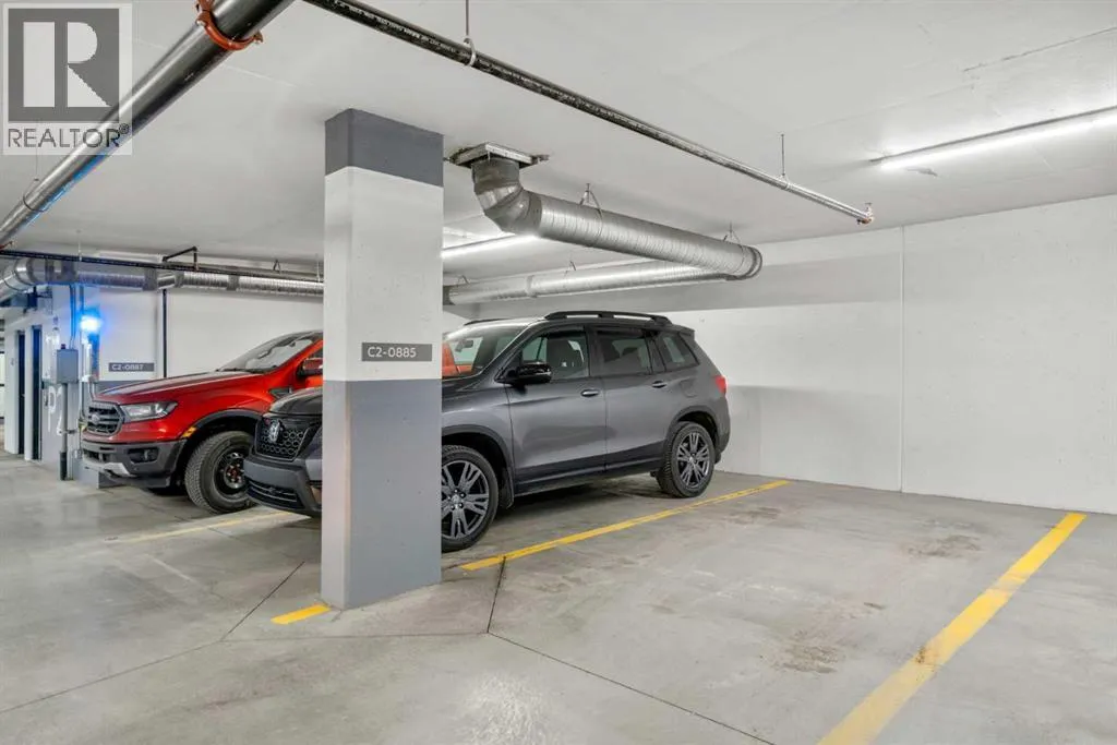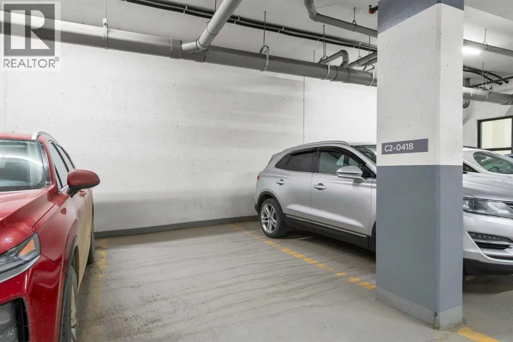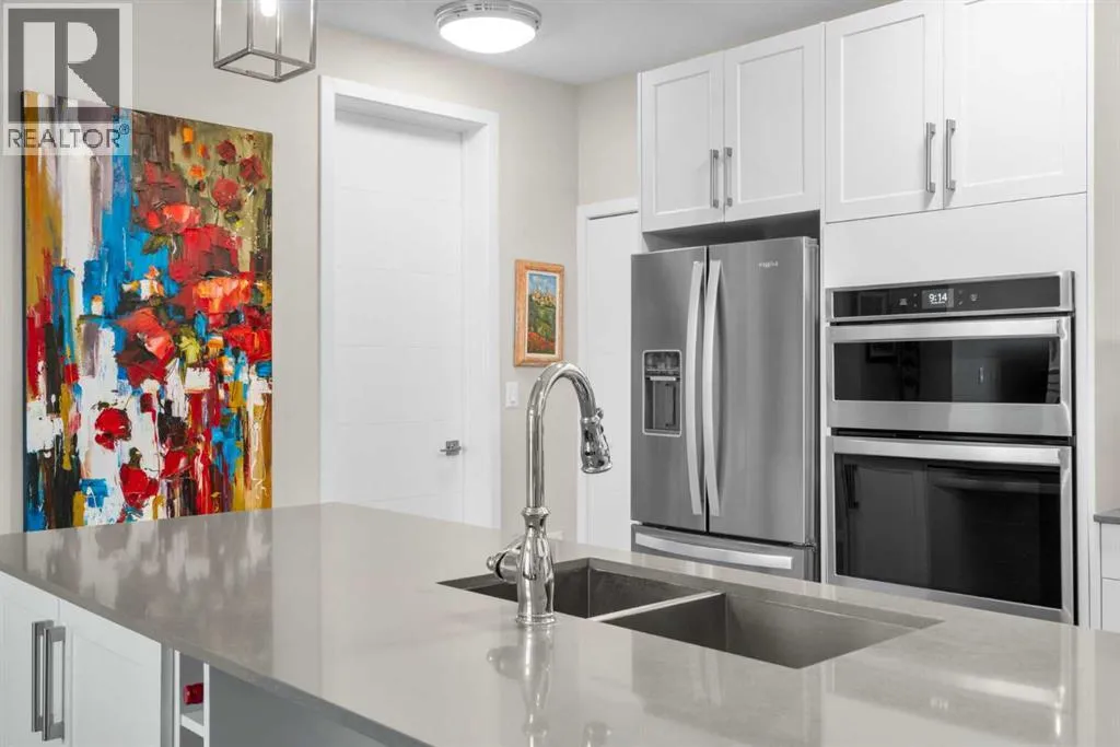 Elevated lake living meets panoramic skyline views in this rare top-floor residence at Westman Village in Mahogany. Positioned at the top of the building with soaring ceilings and expansive west exposure, this executive two-bedroom, two-bathroom luxury condo captures unobstructed mountain, lake, and downtown skyline views â a vantage point seldom available in Calgaryâs condominium market.The elevated ceiling height enhances the sense of space while natural light pours through expansive windows, creating a bright and refined living environment. Top-floor positioning further enhances privacy and delivers uninterrupted sightlines that define the homeâs living experience.Proudly offered by the original owner and meticulously maintained, this residence features an upgraded kitchen package with premium appliances, stone countertops, enhanced cabinetry, and a rare wrap-around U-shaped kitchen peninsula island â a highly functional layout that significantly expands prep space and creates a natural gathering area rarely found in comparable units.The open-concept design flows seamlessly through the dining and living areas and out to a private covered balcony, where sweeping sunset views stretch from the Rocky Mountains across the lake to Calgaryâs skyline.The primary suite offers generous proportions, a customized walk-through closet with built-in organization, and remote-operated blackout blinds for added comfort and privacy. The ensuite is well-appointed with upgraded finishes, while the second bedroom and full bathroom provide flexibility for guests, a home office, or downsizing without compromise.Additional highlights include luxury vinyl plank flooring throughout (no carpet), a thoughtfully designed in-suite laundry space with built-in storage, central air conditioning, triple-pane windows, secure concrete construction, and two titled underground heated parking stalls.Westman Village offers one of Calgaryâs most comprehensive private lifestyle environments, w ith full-service amenities including fitness facilities, wellness areas, social spaces, and premium features such as a wine vault, hot tubs, and steam rooms â all within the building. The complex is pet-friendly and designed for a highly connected, maintenance-free lifestyle.As a resident of Mahogany, youâll also enjoy access to the private Mahogany Beach House, offering year-round recreational opportunities including lake access, paddleboarding, skating, fitness programming, and community events â delivering a true four-season lake lifestyle just steps from your door.This is more than a condominium â it is a top-floor, view-driven luxury residence with rare design features and double titled parking within one of Calgaryâs most sought-after resort-style developments. (id:27476)