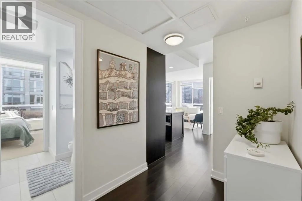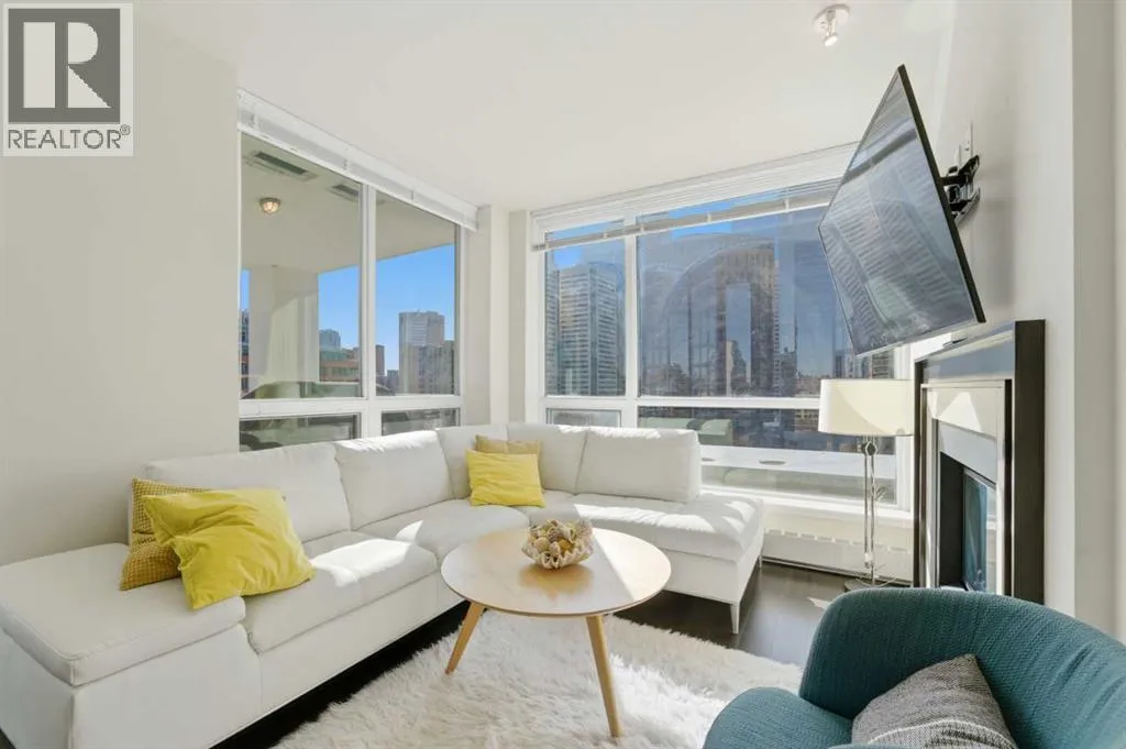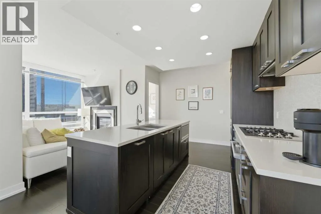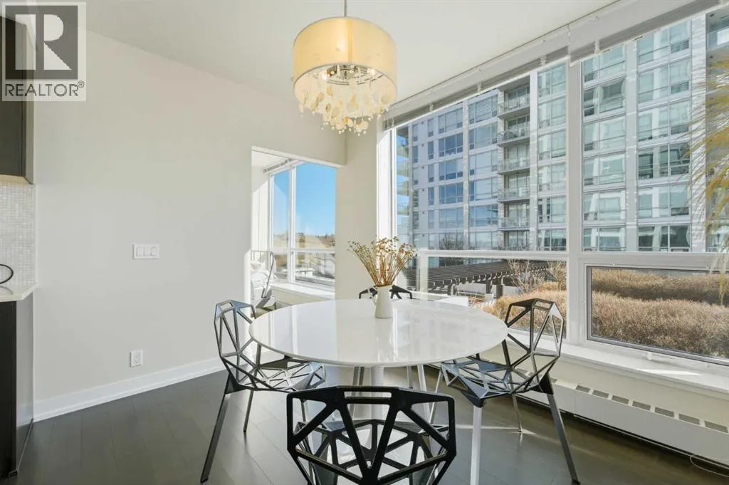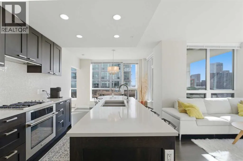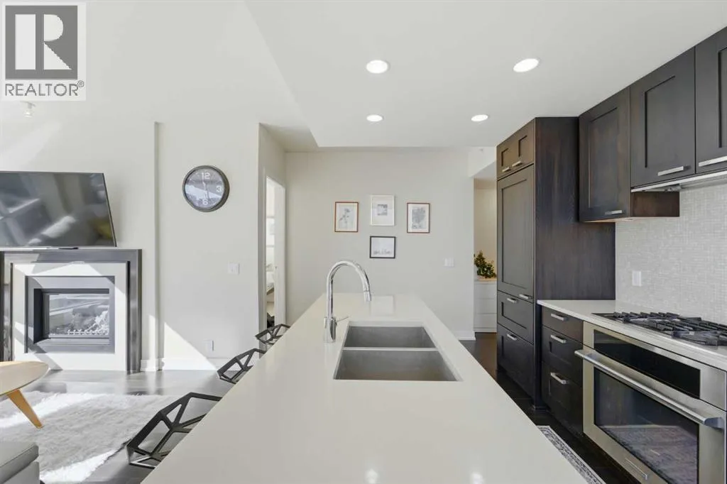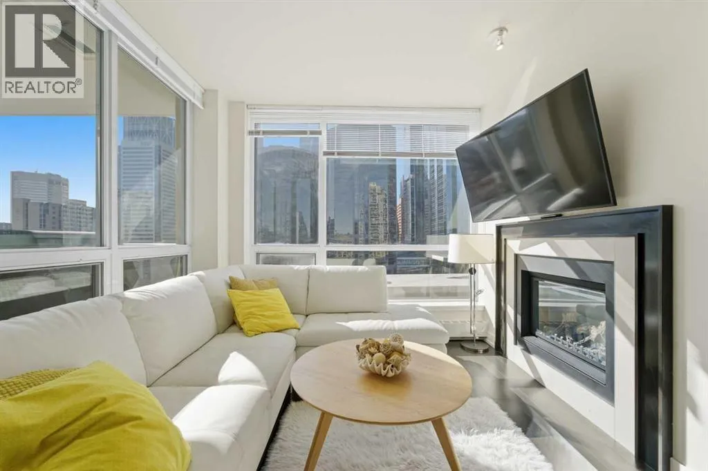 Bright and sunny, corner 2 bedroom and 2 bath in a concrete building. Flooded with beautiful light, this south east corner unit, has amazing city and river views. Very open plan with gourmet kitchen, with gas stove, quart counters, large eating bar. South facing living room with gas fireplace. Master bedroom has a spa style suite, and duel closets. Second bedroom is well located, for privacy making it ideal for a roommate. Underground parking and storage locker are included. Building amenities include a fitness center (weight, cardio equipment and jacuzzi tub), social room, theatre, and of a concierge desk. Lots of visitor parking for friends and family. Prime Eau Claire location steps for coffee shops, restaurants, shopping, river walkways, bike paths, restaurants, downtown nightlife, and transit. Immediate possession. (id:27476)