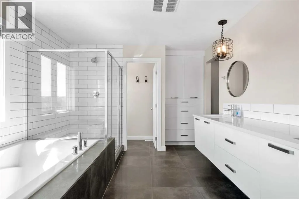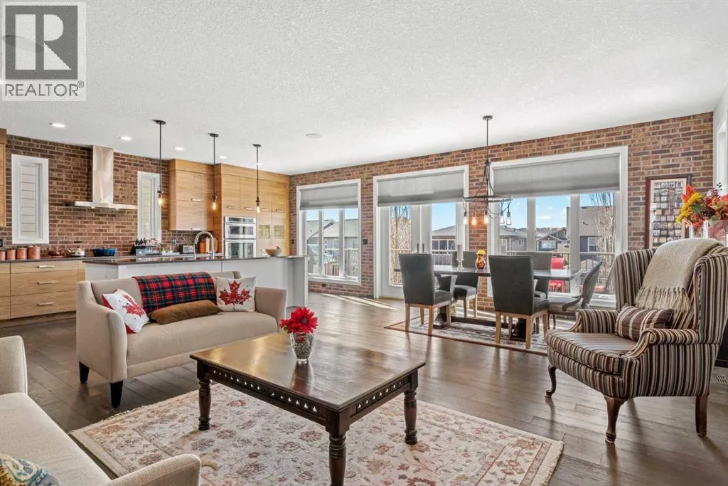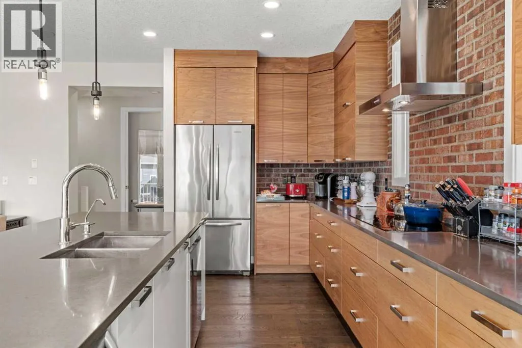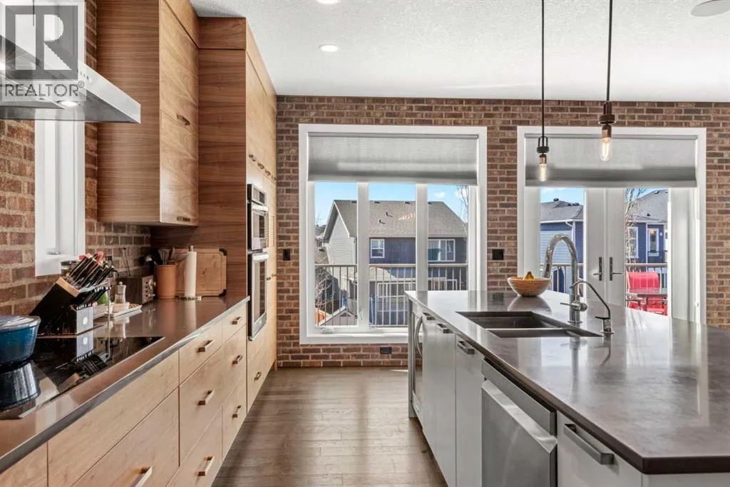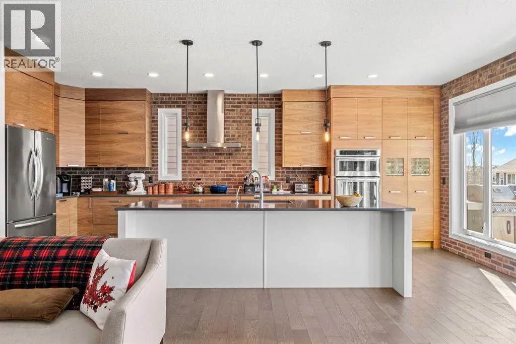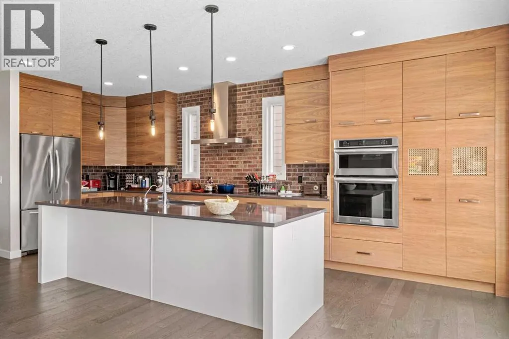 This exceptional contemporary estate residence in Riverstone by Cedarglen Homes offers 3,134 square feet of upgraded living space, perfectly suited for families & multi-generational living. Curb appeal is evident with extra wide exposed aggregate driveway, a spacious landing & a luxurious modern glass-paneled front door with sidelight panels. The expansive main level offers 9 foot knockdown ceilings, a seamless open concept layout, featuring a spacious living room with a sleek linear gas fireplace & full-height, large-scale tile. The bright dining area features a brick facade & premium, full-height west facing casement windows that bathe the space in natural light. The gourmet kitchen is both functional & refined, showcasing full height, book matched flat panel walnut cabinetry, a distinctive brick façade backsplash, quartz countertops, a massive island complete with an undermount sink, beverage fridge, dishwasher, inviting breakfast bar seating & a premium appliance package. Upstairs, the primary bedroom offers a spa-inspired 5 piece ensuite complete with dual sinks set in a floating cabinet, a soaker tub, an oversized double shower with a seating bench & full height subway tile, built-in linen storage & direct access to an expansive walk-in closet. The large bonus room, featuring a vaulted style ceiling, built-in speakers & abundant windows creates a warm & versatile gathering space. Two great sized bedrooms share a thoughtfully designed five piece bathroom with an extra wide double sink vanity, a raised cabinet, a subway tile backsplash, tiled flooring, plus a separate water closet, tub & shower room. The spacious laundry room has upper cabinets, a hanging rod & tile flooring. The fully developed walkout basement presents a self-contained living space ideal for extended family or guests, featuring a complete kitchen with high gloss flat panel cabinetry, subway tile backsplash, full sized appliances & a stylish 3 piece bathroom with a full width, tiled shower. The spacious bedroom features a massive egress window & white brick feature wall. The large living area has its own feature wall & luxury vinyl plank flooring, separate heating control, a dedicated stackable laundry set, dual French doors open onto a full width wood plank covered balcony overlooking the expansive, west facing, fully fenced backyard, landscaped with mature columnar aspen trees. The oversized 24â x 22â garage is fully insulated & drywalled. It is equipped with a gas heater, an 8 foot high door & a convenient mezzanine style storage area. Outdoor living is equally impressive, with a full-width, extra deep west facing Duradeck balcony designed for relaxation & entertaining. Highlights include engineered hardwood flooring, built-in speakers, elegant brick wall treatments, metal spindles, triple glazed casement windows with premium blinds, a Kinetico water system, soundproofed lower level insulation, gas lines to both the BBQ & kitchen plus a professionally landscaped yard. (id:27476)